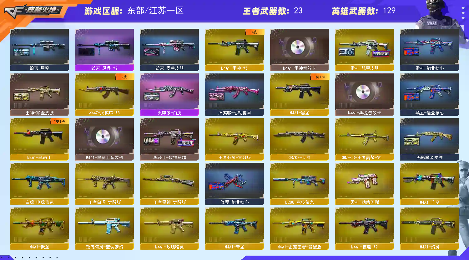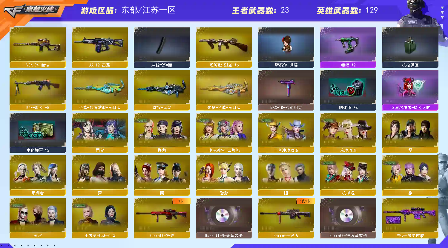 首页 > 租号大厅 > 穿越火线 > 电信区/江苏一区 > 【东部】传说浩劫+艾莉莎⭐幻神女团3皮+音⭐王者星神⭐白虎蔷薇幻影套⭐天袭天戎⭐八面玲珑⭐蝴蝶刀