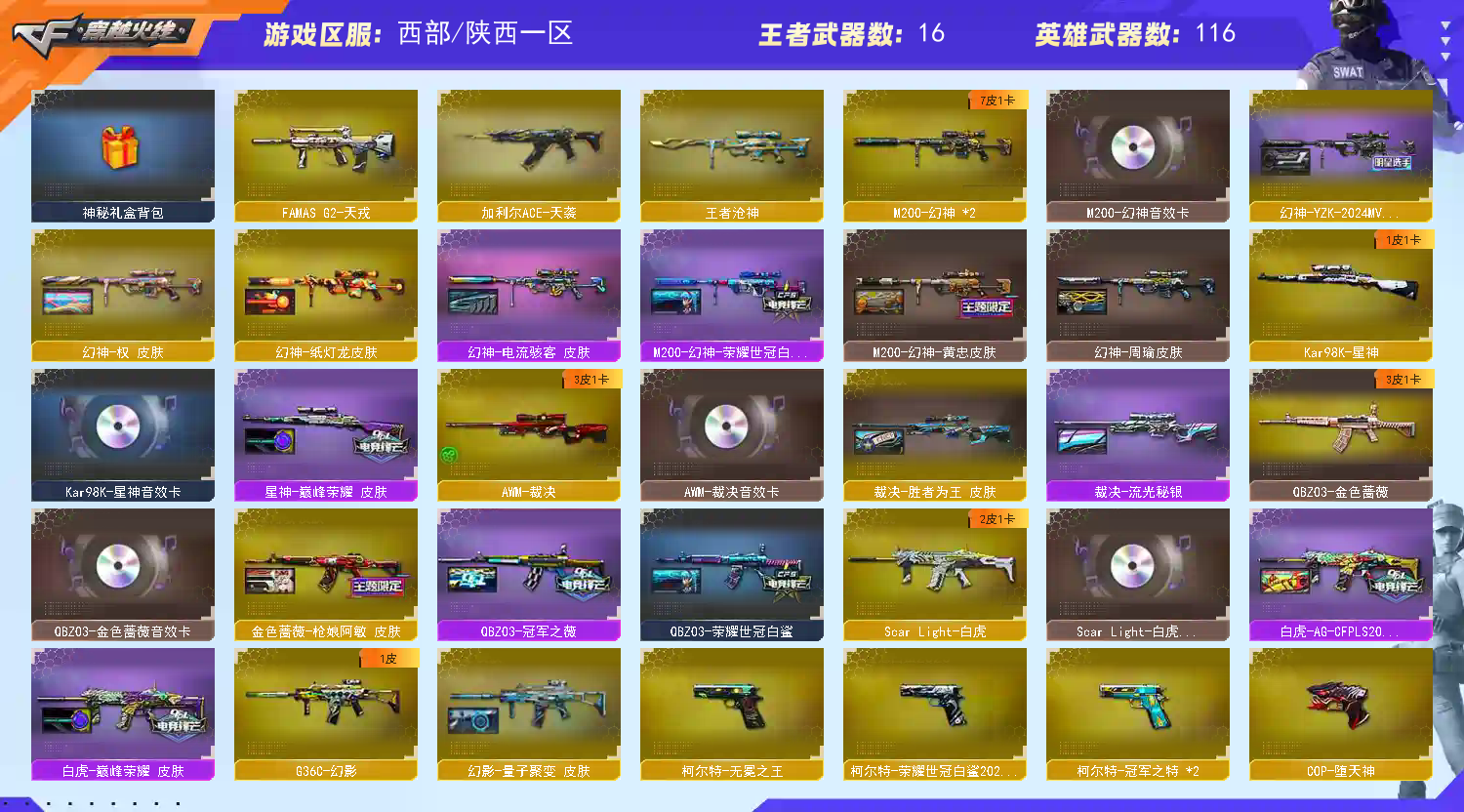 127V幻神新皮肤权【幻影】【白虎3件套】【幻神6皮+卡周瑜/黄忠/荣耀世冠/纸灯龙/电流骇客】星神/5盘/1炼/5烈+烈龙云龙游海/ 【步枪】火麒麟/黑龙/雷神/黑骑士/无影/黑武士/天启/武圣/机械迷城/黑鲨/青龙/朱雀/白虎/天罚/幻影/QBZ云龙/金色蔷薇古蛇迷踪/ 【狙击枪】天龙/毁灭x2/激光/裁决/幻神/星神/王者之力/ 【机枪】盘龙x5/炼狱百战金芒/炼狱 【冲锋枪】烈龙x5/烈龙云龙游海 【手枪】沙鹰x2/天神x2/武圣/堕天使/幻灵x2/天神动感神耀/柯尔特荣耀世冠白鲨/柯尔特冠军之特x2/USP雷霆王者 【刀】屠龙x2/龙啸/擎天/麒麟刺/幻灵之锋/炽芒碟刃/屠龙动感闪耀/擎天云龙游海/屠龙云龙游海/龙啸热带奇洋/龙啸云龙游海/麒麟刺百战金芒/屠龙电竞之星/屠龙斗烈龙骏/ 【手雷】幻灵手雷x5/手雷动感闪耀/手雷云龙游海/云龙手雷x2/热带奇洋手雷/古蛇迷踪手雷/雷霆王者手雷/幻灵闪光x7/闪光云龙/闪光雷暴王者/幻灵烟雾x5/竞技荣光烟雾/烟雾弹云龙/古蛇迷踪 【角色】关小雨/机械姬/葵/鹰/零纪元/隼/战地猎狐/斗烈龙骑/幻面灵狐/葵阿尔发武装/奇洋探员/乔伊教练/蛇隐宗/王者春/王者玲珑/ 【卡】幻神卡/火麒麟/烈火动感闪耀/毁灭音效卡/裁决卡/金色蔷薇卡/雷神卡/白虎卡/极光卡/ 【皮肤】超新星傲竹金蛇/龙啸纸灯龙/幻影量子聚变/朱雀武当/幻神纸灯龙/幻神电流骇客/雷神宇航兔/黑鲨电流骇客/金色蔷薇冠军之薇/黑骑士2021/炼狱电子连击/白虎AG20冠军/幻神荣耀世冠/白虎巅峰荣耀/裁决秘银/金色蔷薇荣耀世冠/黑骑士战神马超/黑骑士破界/幻神黄忠/毁灭冠军之怒/雷神动感闪耀/雷神虎将/雷神白鲨/雷神神秘按键/雷神冠军之魄/黑龙墨子/火麒麟冠军之心/雷神云海游龙幻神周瑜/龙啸青青莓果;柯尔特-无冕之王,USP-雷暴王者,柯尔特-荣耀世冠白鲨2023,柯尔特-冠军之特,炽芒蝶刃,隼,晴雅,