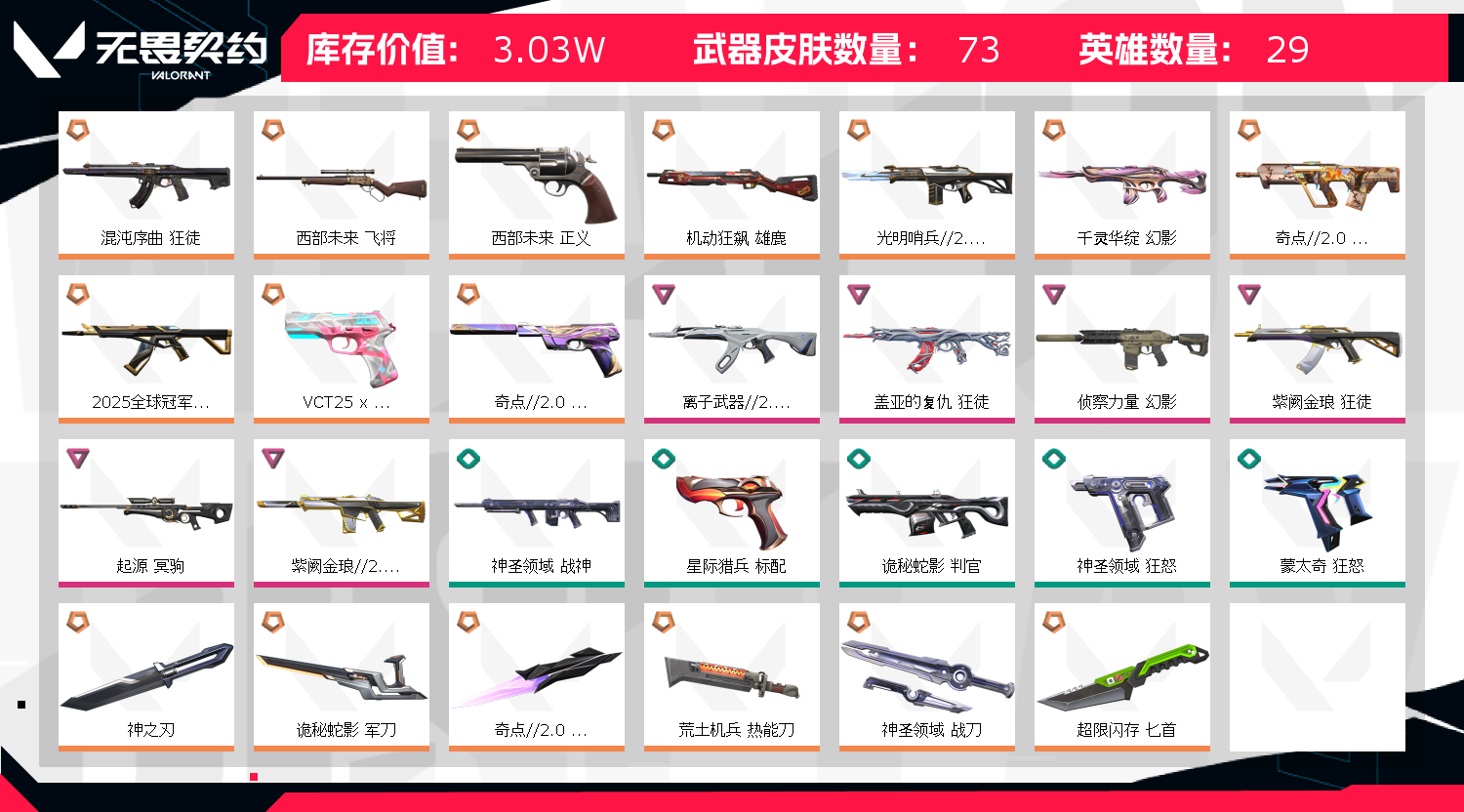 狂徒:盖亚,混沌,资金,25冠军,奇点,离子。幻影:侦查,莲花,紫金,哨兵近站:神之刃,奇点蝴蝶刀