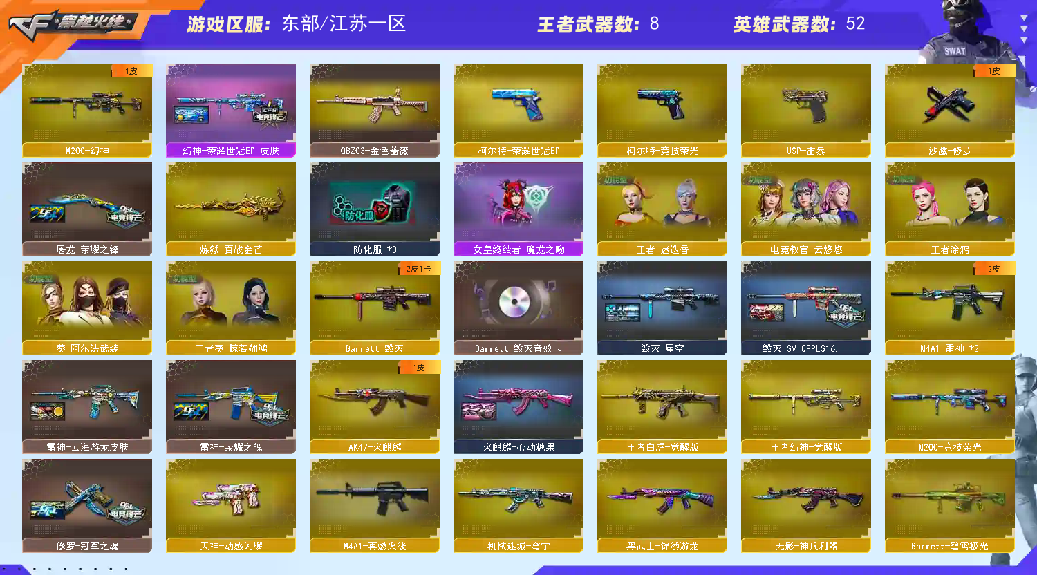 此账号和平台属于合作关系,已经备案。如果账号封号或者什么的,商户将会协助平台然后报警。 收藏好评!由于异地登录保护机制,部分客户在使用客户端自动上号时会出现密码错误,注意本号密码不会错误,请多尝试5-6次!本账号已经过虚拟财产-认1证。请素质租号,文明游戏,谢谢大家配合!!!;USP-雷暴,电竞教官-云悠悠,QBZ03-金色蔷薇,M200-幻神,