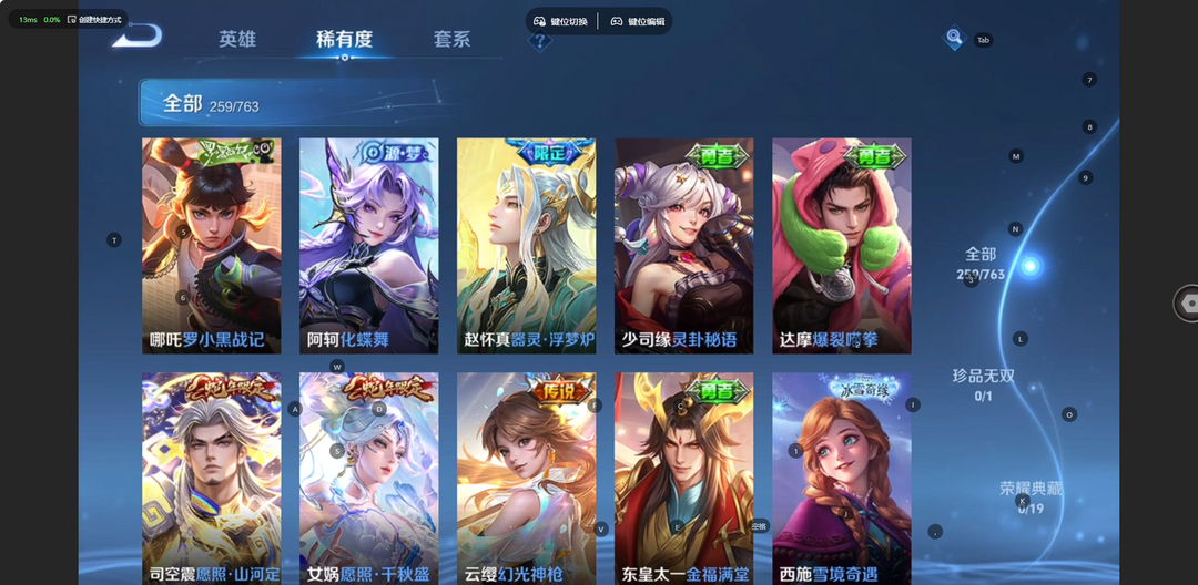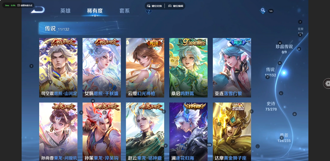 v10、537皮6水4无双、安琪拉-颠倒童话·魔镜、朵莉亚-神骥、遇见神鼓、齐天大圣、白虎志、韩信荣耀典藏、73传说、时之魔女、瑶无双、青丘、九尾、神器明辉仪
