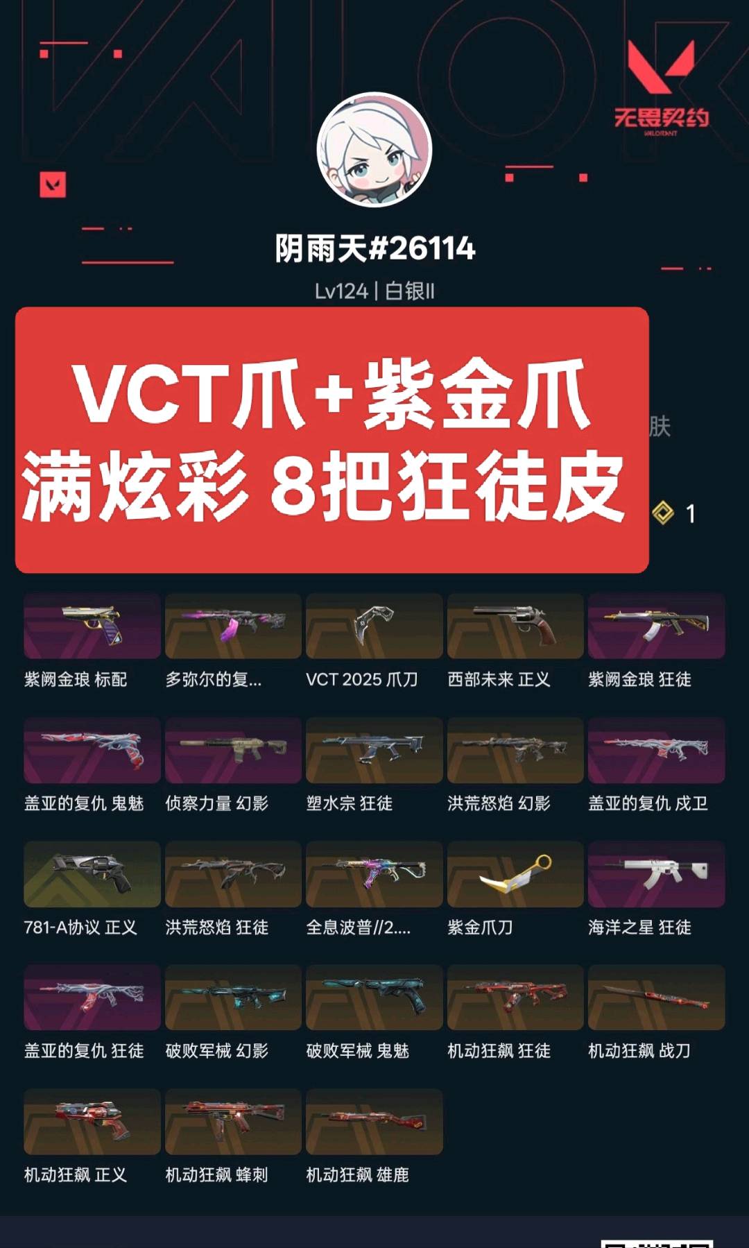 炸鱼丧m⚡️VCT+紫金爪⚡️机动狂飙套⚡️8把特效狂徒皮⚡️多弥尔+流脓+盖亚+紫金+塑水+侦查