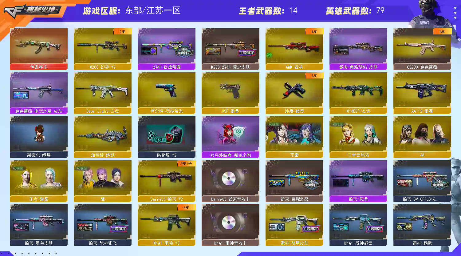 传说辉光【热门武器】:传说辉光,QBZ03-金色蔷薇,M14EBR-玄武,Scar Light-白虎,HK417-朱雀*2,M200-幻神*2,金色蔷薇-古蛇迷踪,修罗-古蛇迷踪,M200-竞技荣光,白虎-电玩蓝兔,M4A1-黑骑士,加特林-炼狱,斯泰尔-蝴蝶,羊驼玩偶*2,USP-雷暴,沙鹰-修罗【王者炫金武器】:王者青龙,炫金雷神,炫金毁灭,炫金天龙【音效卡】:天神-动感闪耀 音效卡,擎天-云海游龙音效卡,AK47-火麒麟音效卡,M4A1-雷神音效卡,M4A1-黑骑士音效卡,Barrett-毁灭音效卡,HK417-朱雀音效卡,Barrett-碧霄极光音效卡【皮肤】:M200-幻神-黄忠皮肤,幻神-巅峰荣耀,白虎-电玩粉兔皮肤,金色蔷薇-电竞之星 皮肤,裁决-典雅胡桃 皮肤,雷神-荣耀之魄,雷神-耀金皮肤,M4A1-战神赵云,雷神-杨戬,雷神-航星皮肤,火麒麟-冠军之心,火麒麟-华夏之心,火麒麟-战神关羽,火麒麟-盘古,火麒麟-心动糖果,毁灭-荣耀之怒,毁灭-SV-CFPLS16冠军,毁灭-战神张飞,毁灭-风暴,毁灭-英雄计划 皮肤,M4A1-千变-孔明皮肤,黑龙-能量核心,黑龙-墨子皮肤,黑骑士-战神马超,无影耀金皮肤,超新星-深海萌鲨 皮肤,战神-流金岁月皮肤,AK47-B-常胜将军-孙权,修罗-星空*2,修罗-冠军之魂【角色】:葵,雨棠,鹰,王者-魅影,王者云悠悠,蛇隐宗,奇洋探员,乔伊教练,修道士,云海玲珑,初恋灵狐,风暴女,嘉年华灵狐,荆棘玫瑰,娟娟,兰-梨园特工,零-热舞青春,灵动武士,龙儿,潘多拉-X,潘多拉-甜心教官,蛇姬,斯沃特-X,新灵狐者,雪莉杨【人偶武器】:天龙-曼陀罗,王者Barrett-英勇金戈,斯泰尔-蝴蝶,AWM-灵狐-15周年嘉年华*2,迷你超能女侍,QBZ03-斯沃特【挑战大师】:神圣爆裂者III,冰龙粉碎者-白马银枪【英雄级武器】:AK47-火麒麟*2,M4A1-黑龙,M4A1-雷神*3,M4A1-黑骑士,AK47-黑武士,AN94-超新星,AK47-雷暴,HK417-朱雀*2,Scar Light-白虎,M14EBR-玄武,无影-神兵利器,超新星-热带奇洋,金色蔷薇-古蛇迷踪,QBZ03-金色蔷薇,烈火-动感闪耀,王者之心-觉醒版,王者之魄-觉醒版,超新星-悦享-觉醒版,AK-47-猩红传说*2,AK47-B-战神,白虎-电玩蓝兔,王者芳薇-觉醒版,Barrett-毁灭*2,AWM-裁决;USP-雷暴,QBZ03-金色蔷薇,M200-幻神,Scar Light-白虎,