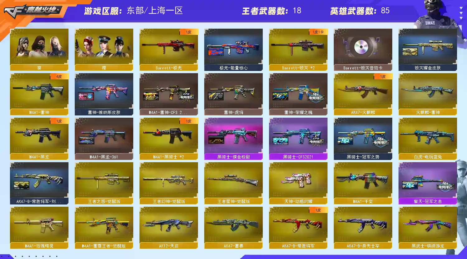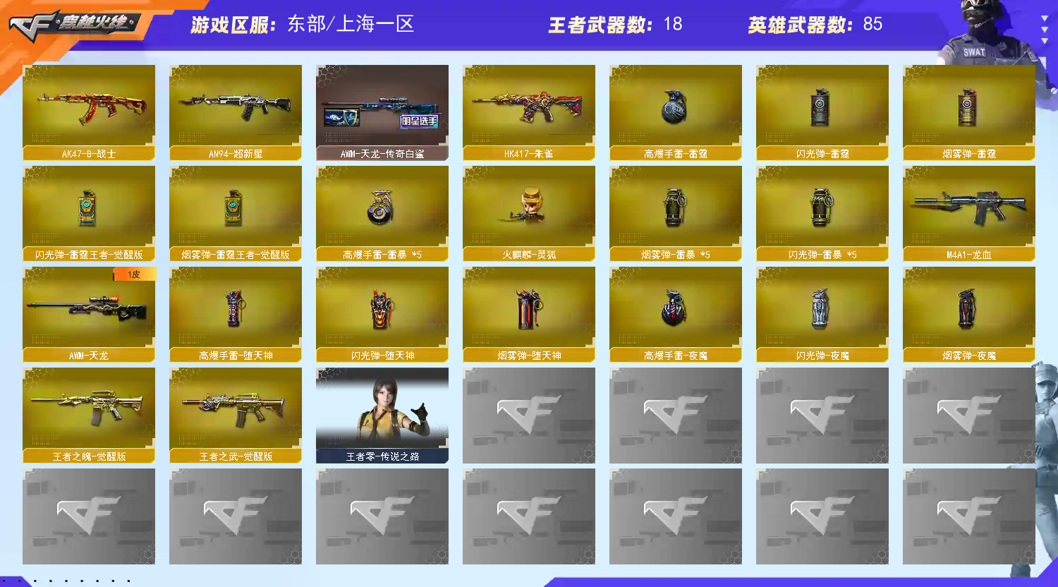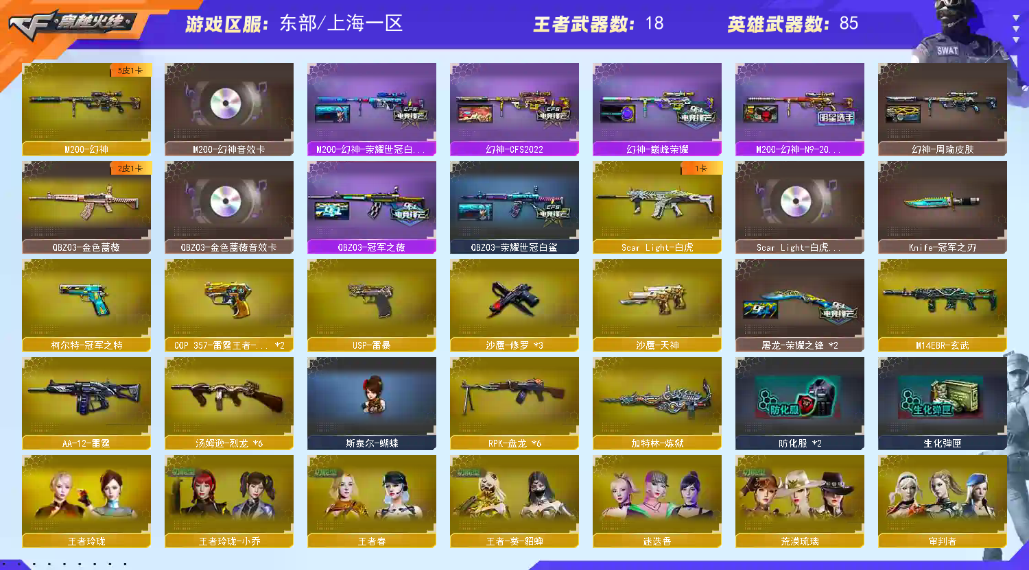 QBZ03-金色蔷薇,M14EBR-玄武,Scar Light-白虎,HK417-朱雀,M200-幻神,死亡之眼,白虎-电玩蓝兔,柯尔特-冠军之特,M4A1-黑骑士*2,汤姆逊-烈龙*6,RPK-盘龙*6,加特林-炼狱,斯泰尔-蝴蝶,USP-雷暴,沙鹰-修罗*3,Knife-冠军之刃【音效卡】:M200-幻神音效卡,Barrett-毁灭音效卡,Scar Light-白虎音效卡【皮肤】:幻神-周瑜皮肤,幻神-巅峰荣耀,幻神-CFS2022,M200-幻神-荣耀世冠白鲨,M200-幻神-N9-2022MVP,白虎-电玩粉兔皮肤,QBZ03-冠军之薇,QBZ03-荣耀世冠白鲨,雷神-荣耀之魄,M4A1-雷神-CFS 2019,雷神-虎将,雷神-维纳斯皮肤,火麒麟-雷神,毁灭耀金皮肤,M4A1-黑龙-361,黑骑士-冠军之势,黑骑士-CFS2021,战神-粉色甜心皮肤,AK47-B-常胜将军-刘备,AWM-天龙-传奇白鲨,极光-能量核心,屠龙-荣耀之锋*2,擎天-冠军之击【角色】:葵,樱,迷迭香,荒漠琉璃,审判者,王者-葵-貂蝉,王者春,王者玲珑,王者玲珑-小乔,乔伊教练,暗夜-X,飞虎队-X,嘉年华灵狐,卡塔琳娜,灵狐者-黄金海岸,麻雀,潘多拉-X,铁骑荣耀,维纳斯,雪莉杨-摸金校尉,影武者-X,幽,职业选手【人偶武器】:火麒麟-灵狐,斯泰尔-蝴蝶,巴雷特-零-水下丽影,AWM-灵狐-15周年嘉年华,黄金迷你裂空之翼,闪光弹-貂蝉,高爆手雷-大乔,迷你超能女侍【暴走生化】:死亡之眼【挑战大师】:神圣爆裂者III【英雄级武器】:M4A1-千变,AK47-火麒麟,M4A1-黑龙,M4A1-雷神,M4A1-黑骑士*2,AK12-天启,AN94-超新星,M4A1-龙血,AK47-雷暴,HK417-朱雀,Scar Light-白虎,M14EBR-玄武,黑武士-锦绣游龙,M4A1-玫瑰精灵,QBZ03-金色蔷薇,王者之武-觉醒版,王者之魄-觉醒版,AK47-B-常胜将军,M4A1-雷霆王者-觉醒版,白虎-电玩蓝兔,AWM-天龙,Barrett-毁灭*2,Barrett-极光,M200-幻神,王者之怒-觉醒版,王者幻神-觉醒版,王者星神-觉醒版,RPK-盘龙*6,加特林-炼狱,汤姆逊-烈龙*6,AA-12-雷霆,沙鹰-修罗*3,沙鹰-天神,USP-雷暴,COP 357-雷霆王者-觉醒版*2,柯尔特-冠军之特,天神-动感闪耀,屠龙*3,龙啸*3,麒麟刺-堕天神,马来剑-夜魔,擎天,斩神刀-雷暴,屠龙-云海游龙,王者之啸-觉醒版,王者之击-觉醒版,高爆手雷-雷霆,高爆手雷-雷暴*5,高爆手雷-堕天神,高爆手雷-夜魔,手雷-动感闪耀,闪光弹-雷霆,闪光弹-雷暴*5,闪光弹-堕天神,闪光弹-夜魔,闪光弹-雷霆王者-觉醒版,烟雾弹-雷霆,烟雾弹-雷暴*5,烟雾弹-堕天神,烟雾弹-夜魔,烟雾弹-雷霆王者-觉醒版【道具】:EP战队炫彩背包,EDG炫彩背包,WE炫彩背包,XROCK炫彩背包,炫彩背包,超级背包,绿色巨人,灵魂忍者,变异宝贝,迷雾幽灵,生化弹匣,夺命之镰,防化服*2,金色流光-枪王排位*2,星辰流光-枪王排位,巅峰赛先锋-金色流光,枪王排位28赛季金色流光,语音特效-生化,电玩兔兔表情,斯沃特表情,循环实验表情,防弹头盔*2,防弹衣*3,C4工具钳*3,手雷包*3【特殊枪械】:蝴蝶斯泰尔+6烈龙,1白虎,2黑骑士,6烈龙,6盘龙,1炼狱,1蝴蝶斯泰尔;USP-雷暴,柯尔特-冠军之特,Knife-冠军之刃,RPK-盘龙,QBZ03-金色蔷薇,M200-幻神,Scar Light-白虎,