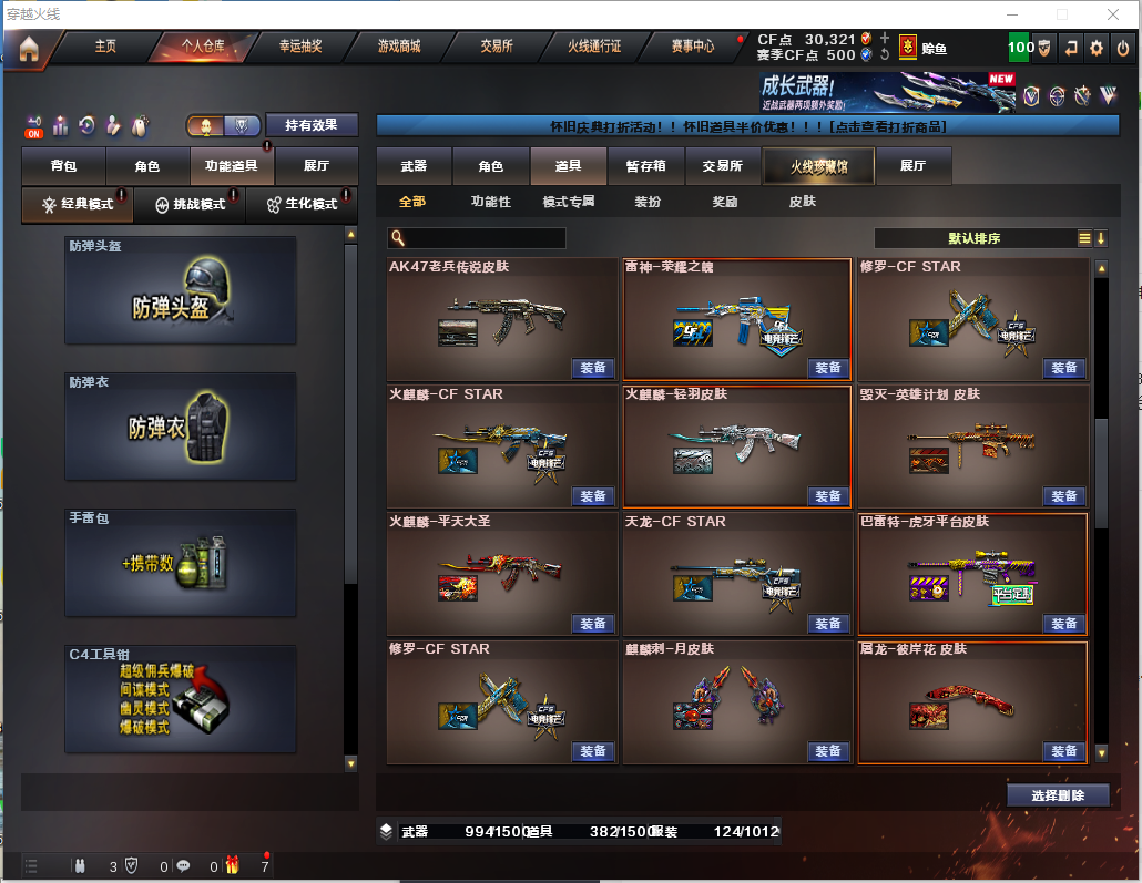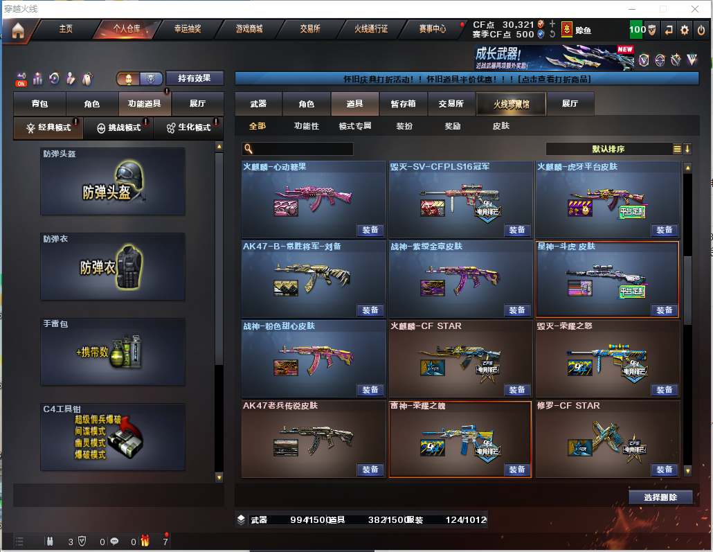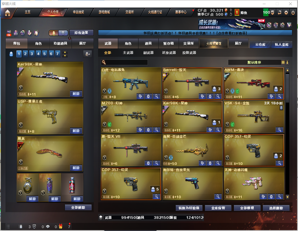 92V【白虎3件套】【裁决3件套】【幻神-电竞之星-YZK2024】【星神3件套】 【步枪】火麒麟/雷神/白虎/幻灵/黑武士锦绣游龙/超新星热带奇洋/金色蔷薇古蛇迷踪/朱雀电竞之星/金色蔷薇/黑骑士海王/白虎蓝兔 【狙击枪】毁灭/裁决/幻神/星神/ 【机枪】炼狱百战金芒 【冲锋枪】 【散弹枪】 【挑战强化武器】白虎/黑武士锦绣游龙/超新星热带奇洋/黑骑士海王/白虎电玩蓝兔/裁决/炼狱百战金芒 【生化武器】幻灵/金色蔷薇古蛇迷踪/朱雀电竞之星/金色蔷薇/裁决/幻神/双面神竞魂/ 【副武器】幻灵x2/柯尔特竞技荣光/天神动感神耀/柯尔特无冕之王/修罗古蛇迷踪/柯尔特冠军之特/USP雷霆王者x3/ 【刀】屠龙/麒麟刺/尼泊尔雷霆/战神刀雷暴/幻灵之锋/擎天竞技荣光/屠龙动感闪耀/龙啸热带奇洋/丛林匕首玄豹/麒麟刺百战金芒/屠龙竞技之星/王者之啸/ 【手雷】雷霆手雷x2/幻灵手雷x7/竞技荣光手雷x2古蛇迷踪手雷/炫豹手雷/雷霆王者手雷x2/雷暴王者手雷/雷霆闪光弹x2/幻灵闪光弹X8/竞技荣光闪光X2/玄豹闪光X2/雷霆王者闪光X5/雷霆烟雾X2/幻灵烟雾X4/竞技荣光烟雾/古蛇迷踪烟雾/玄豹烟雾/雷霆王者烟雾X2/ 【角色】鹰/影豹/零.纪元/战地猎狐/幻面灵狐/葵—阿尔法武装/奇洋探员/乔伊教练/蛇隐宗/王者—春/王者零-华冠丽服/ 【卡】音神音效卡/白虎音效卡/黑骑士音效卡/金色蔷薇音效卡/裁决音效卡/毁灭音效卡/ 【皮肤】裁决-叶忙苍灵/幻神-YZK-2024MVP/雷神-宇航兔/雷神-蓝风铃/雷神-CFS十周年纪念版/毁灭-航天科技/幻神-电竞之星/白虎-虎牙/AK47-B-常胜将军/毁灭-百城浙江/火麒麟-雷神/火麒麟-心动糖果/毁灭-SV-CFPLS16冠军/火麒麟-虎牙平台/AK47-B-常胜将军-刘备/星神-斗虎/毁灭荣耀之怒/雷神荣耀之魄/火麒麟青羽/毁灭英雄计划/毁灭虎牙皮肤/麒麟刺月皮肤/屠龙彼岸花;柯尔特-无冕之王,USP-雷暴王者,柯尔特-冠军之特,QBZ03-金色蔷薇,M200-幻神,Scar Light-白虎,Kar98K-星神,