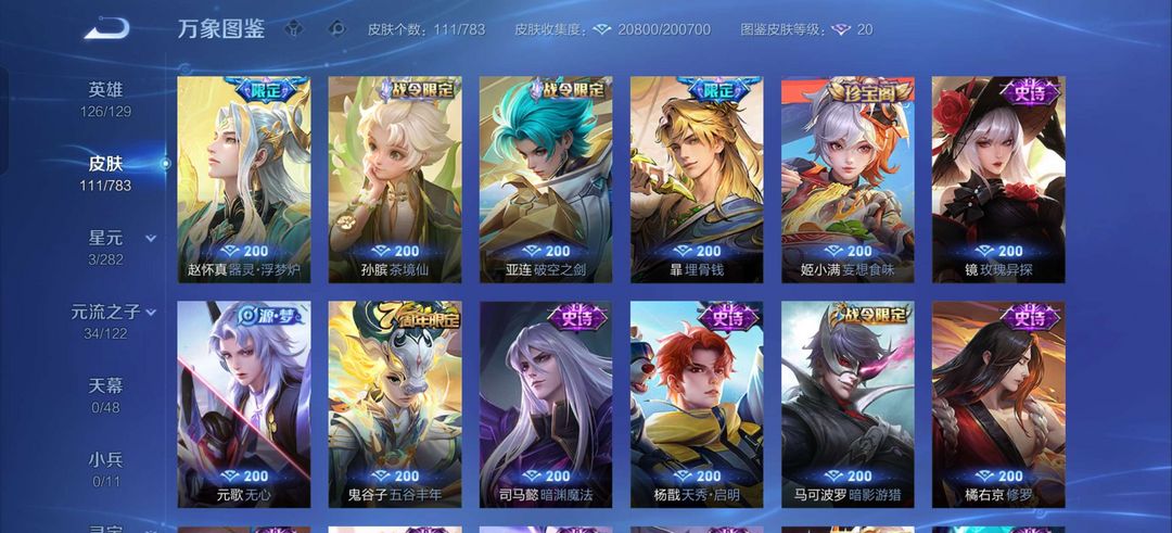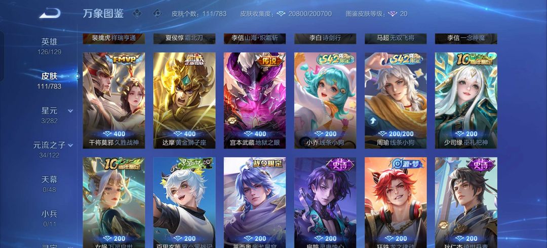 v10、537皮6水4无双、安琪拉-颠倒童话·魔镜、朵莉亚-神骥、遇见神鼓、齐天大圣、白虎志、韩信荣耀典藏、73传说、时之魔女、瑶无双、青丘、九尾、神器明辉仪