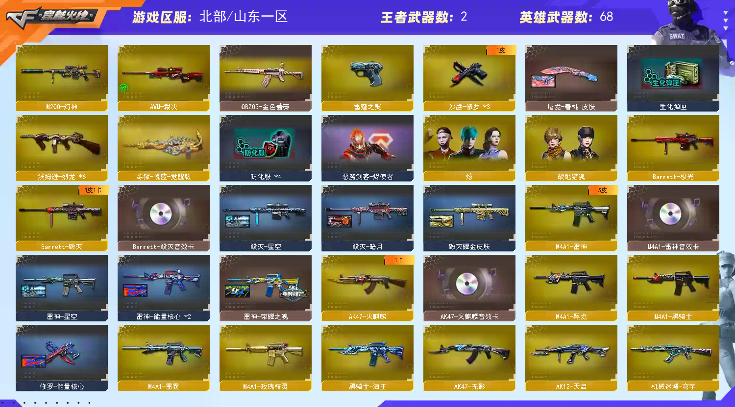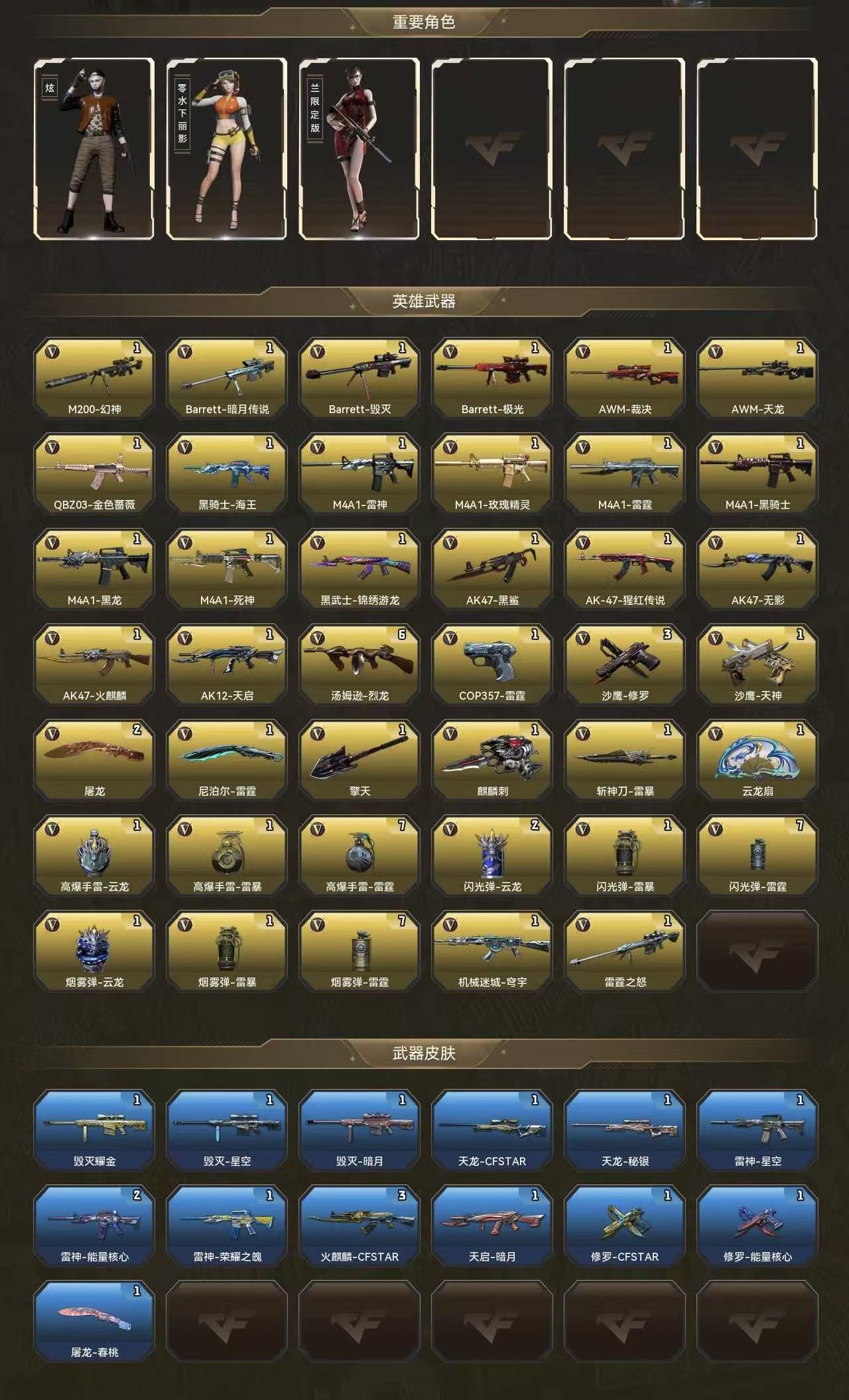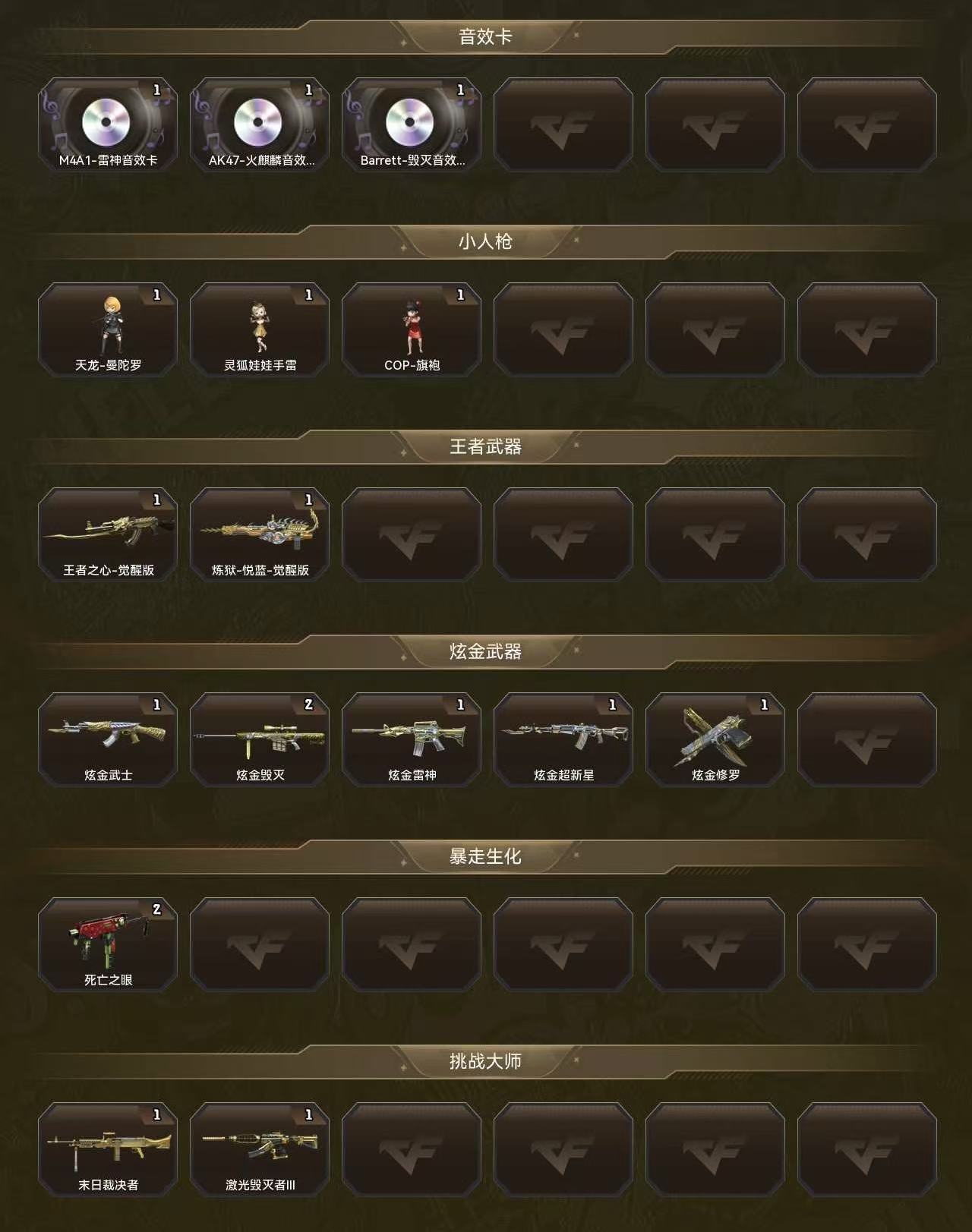 ✅幻神✅⑥烈龙✅暗月传说✅QBZ03-金色蔷薇✅云龙✅雷霆✅挑战✅王者小人枪✅炫金武器✅音效卡;