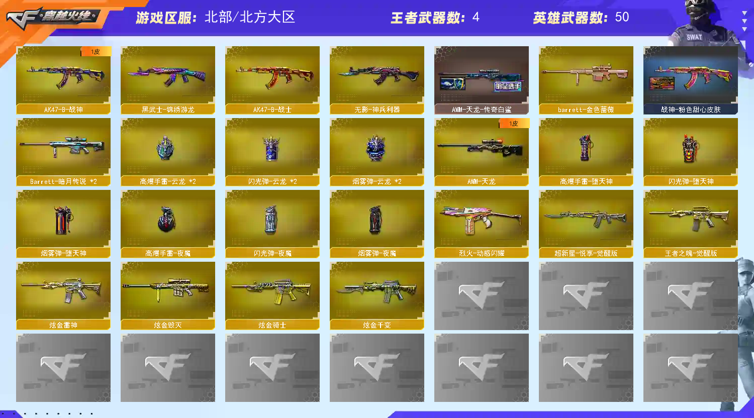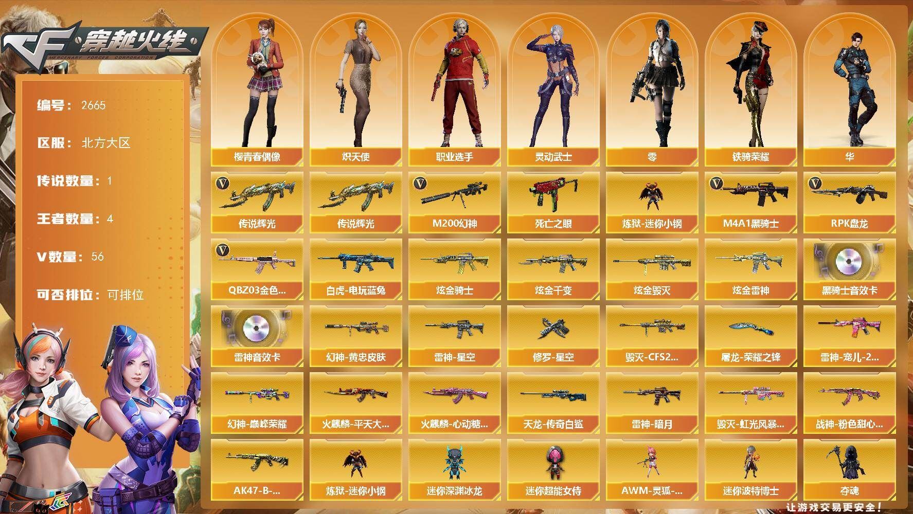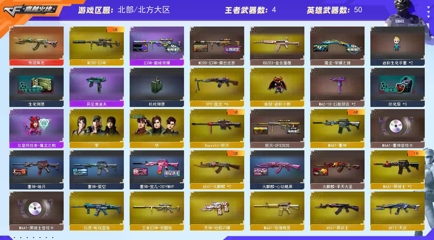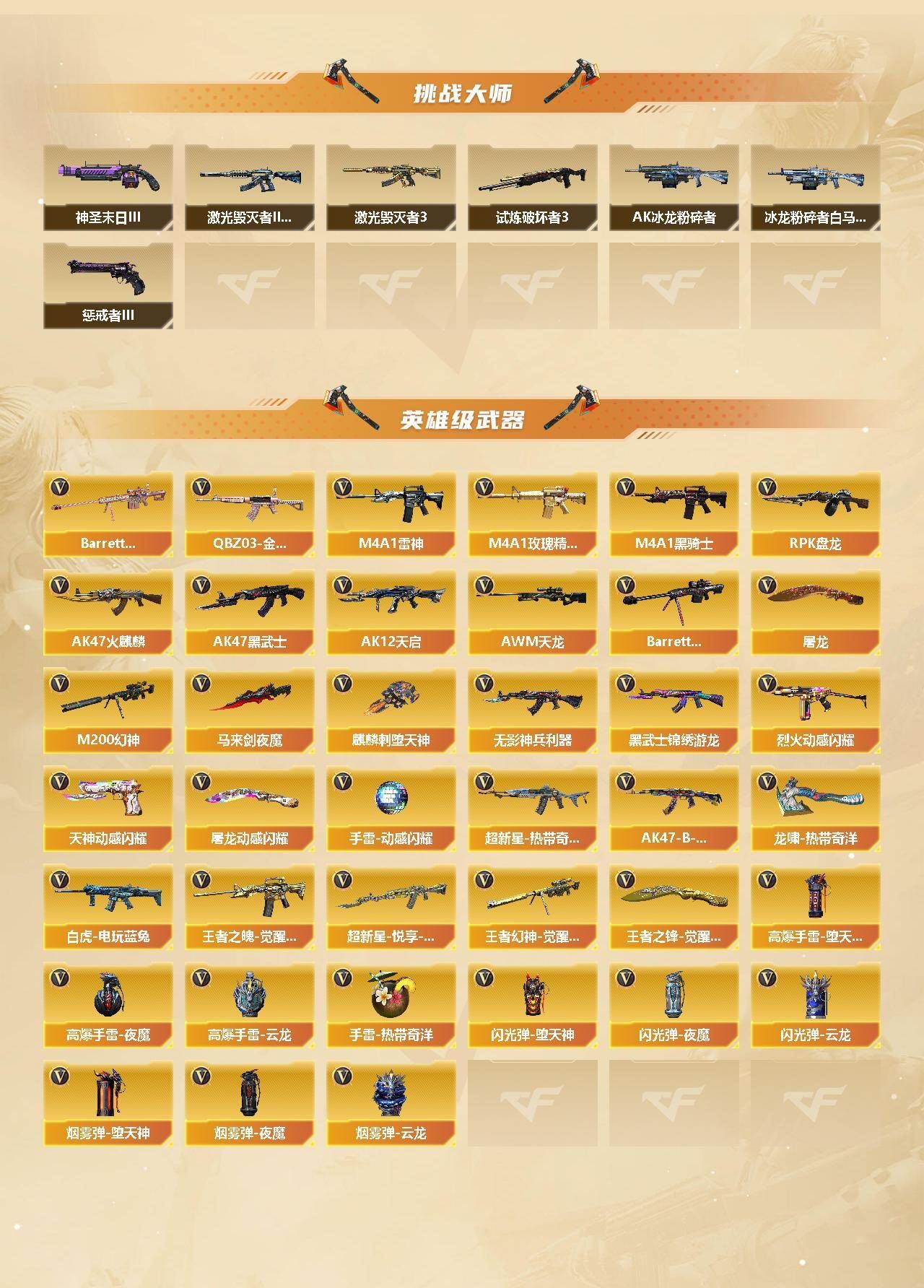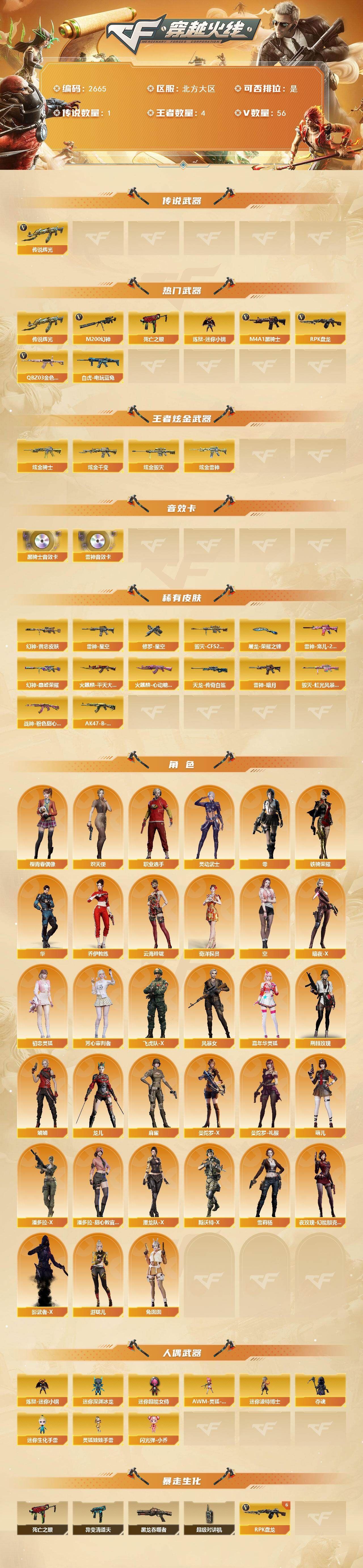 【传说武器】:传说辉光【热门武器】:传说辉光,QBZ03-金色蔷薇,M200-幻神,死亡之眼,白虎-电玩蓝兔,炼狱-迷你小钢,M4A1-黑骑士*2,RPK-盘龙*6【王者炫金武器】:炫金骑士,炫金千变,炫金雷神,炫金毁灭【音效卡】:M4A1-雷神音效卡,M4A1-黑骑士音效卡【皮肤】:M200-幻神-黄忠皮肤,幻神-巅峰荣耀,雷神-暗月,雷神-星空,雷神-宠儿-2019MVP,火麒麟-平天大圣,火麒麟-心动糖果,毁灭-CFS2020,毁灭-虹光风暴 皮肤,战神-粉色甜心皮肤,AK47-B-常胜将军-孙权,AWM-天龙-传奇白鲨,修罗-星空,屠龙-荣耀之锋【角色】:零,华,奇洋探员,乔伊教练,云海玲珑,炽天使,空,暗夜-X,初恋灵狐,芳心审判者,飞虎队-X,风暴女,嘉年华灵狐,荆棘玫瑰,娟娟,灵动武士,龙儿,麻雀,曼陀罗-X,曼陀罗-礼服,萌儿,潘多拉-X,潘多拉-甜心教官,潜龙队-X,斯沃特-X,铁骑荣耀,兔囡囡,雪莉杨,夜玫瑰-幻能朋克,4防樱-青春偶像,影武者-X,游珑儿,职业选手【人偶武器】:炼狱-迷你小钢,AWM-灵狐-15周年嘉年华,迷你深渊冰龙,迷你波特博士*5,夺魂,迷你生化手雷*2,闪光弹-小乔,迷你超能女侍,灵狐娃娃手雷【暴走生化】:异变清道夫,黑龙吞噬者,死亡之眼,超级对讲机【挑战大师】:AK47-冰龙粉碎者,冰龙粉碎者-白马银枪,激光毁灭者III-白马银枪,激光毁灭者III,试炼破坏者III,神圣爆裂者-末日III,惩戒者III【英雄级武器】:AK47-火麒麟*2,M4A1-雷神,M4A1-黑骑士*2,AK47-黑武士,AK12-天启,无影-神兵利器,黑武士-锦绣游龙,超新星-热带奇洋,M4A1-玫瑰精灵,QBZ03-金色蔷薇,烈火-动感闪耀,王者之魄-觉醒版,超新星-悦享-觉醒版,AK47-B-战神,白虎-电玩蓝兔,AWM-天龙,Barrett-毁灭,M200-幻神,Barrett-金色蔷薇,王者幻神-觉醒版,RPK-盘龙*6,天神-动感闪耀,屠龙,麒麟刺-堕天神,马来剑-夜魔,屠龙-动感闪耀,龙啸-热带奇洋,王者之锋-觉醒版,高爆手雷-堕天神,高爆手雷-夜魔,手雷-动感闪耀,高爆手雷-云龙*2,手雷-热带奇洋,闪光弹-堕天神,闪光弹-夜魔,闪光弹-云龙*2,烟雾弹-堕天神,烟雾弹-夜魔,烟雾弹-云龙*2【道具】:CFS限定背包,奇洋探员-海龟背包,沙漠龙背包-猛男专属,炫彩背包,热带奇洋炫彩背包,超级背包,女皇终结者-魔龙之吻,绿色巨人,灵魂忍者*3,变异宝贝,迷雾幽灵*2,生化弹匣,夺命之镰,防化服*3,金色流光-枪王排位*2,星辰流光-枪王排位,枪王排位28赛季金色流光,电玩兔兔表情,热带奇洋表情,动感闪耀表情,EP战队名片,EP战队喷图,防弹头盔*6,防弹衣*5,C4工具钳*5,手雷包*7【特殊枪械】:2黑骑士,6盘龙;RPK-盘龙,QBZ03-金色蔷薇,M200-幻神,
