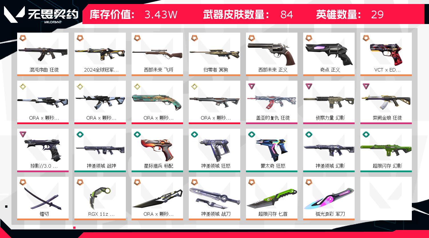 英雄28 武器皮肤数量84;镭切,盖亚的复仇 狂徒,侦察力量 幻影,紫阙金琅 狂徒,混沌序曲 狂徒,2024全球冠军赛 幻影,西部未来 飞将,