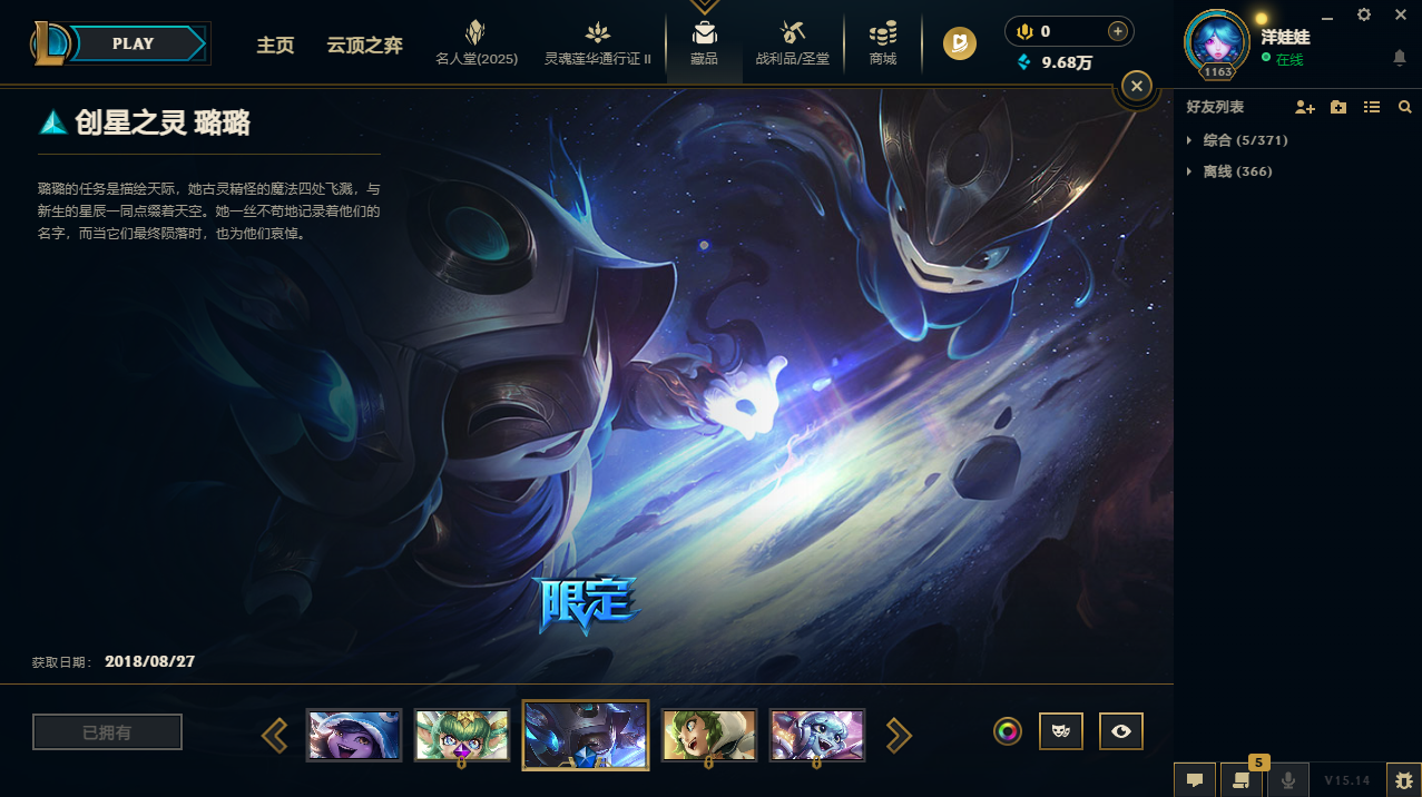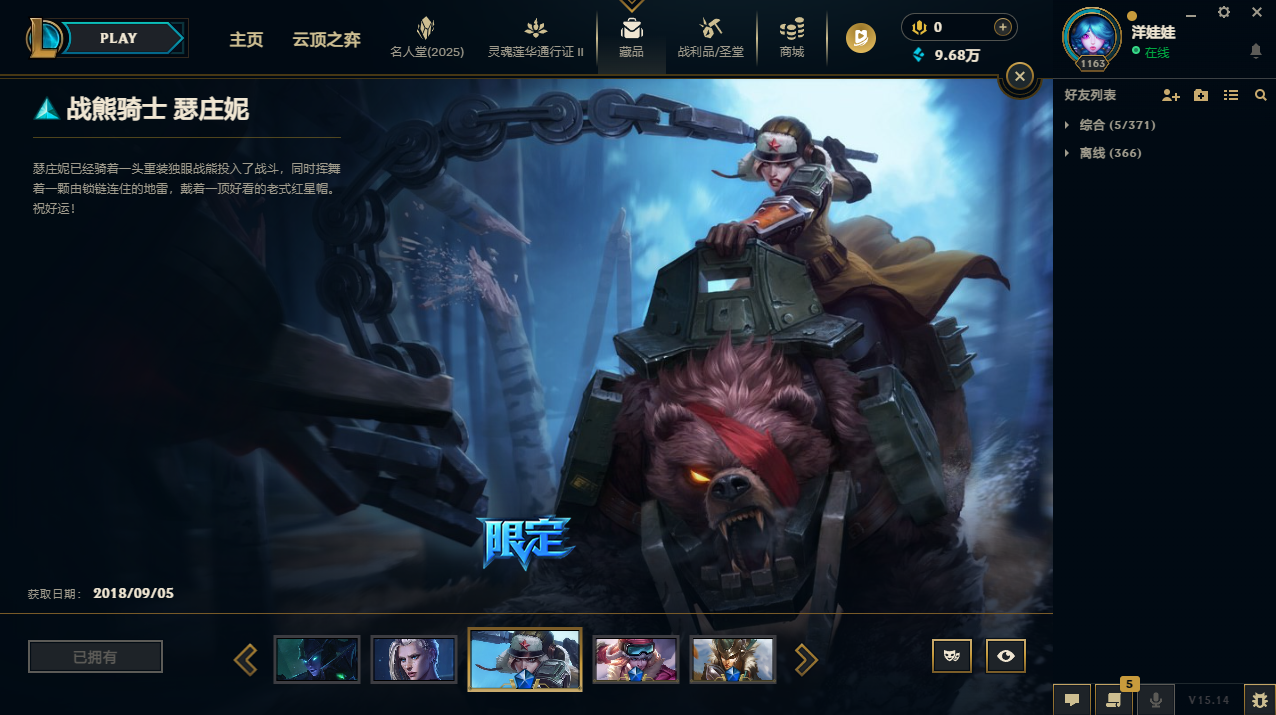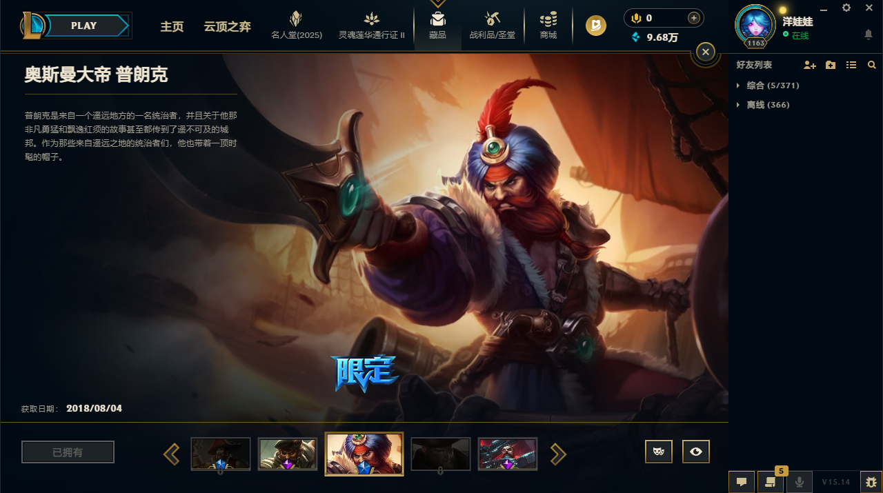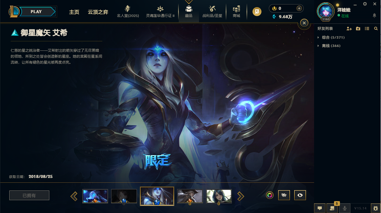 ★艾欧里亚/皮肤960/可排位定位赛无/英雄160/至臻盖伦/武装战姬厄运小姐/海克斯皇子/海克斯满英雄1086皮肤陪老板朋友都不错龙虾