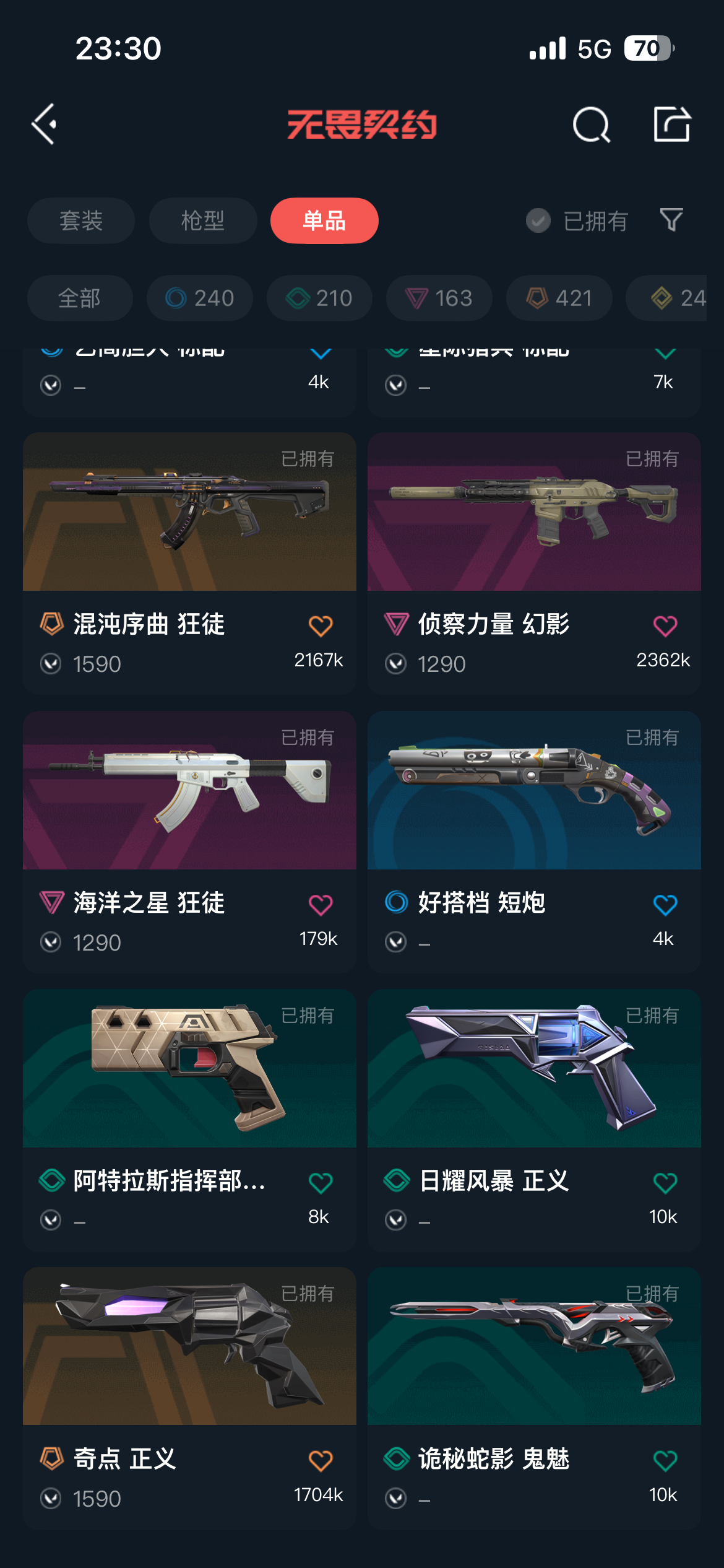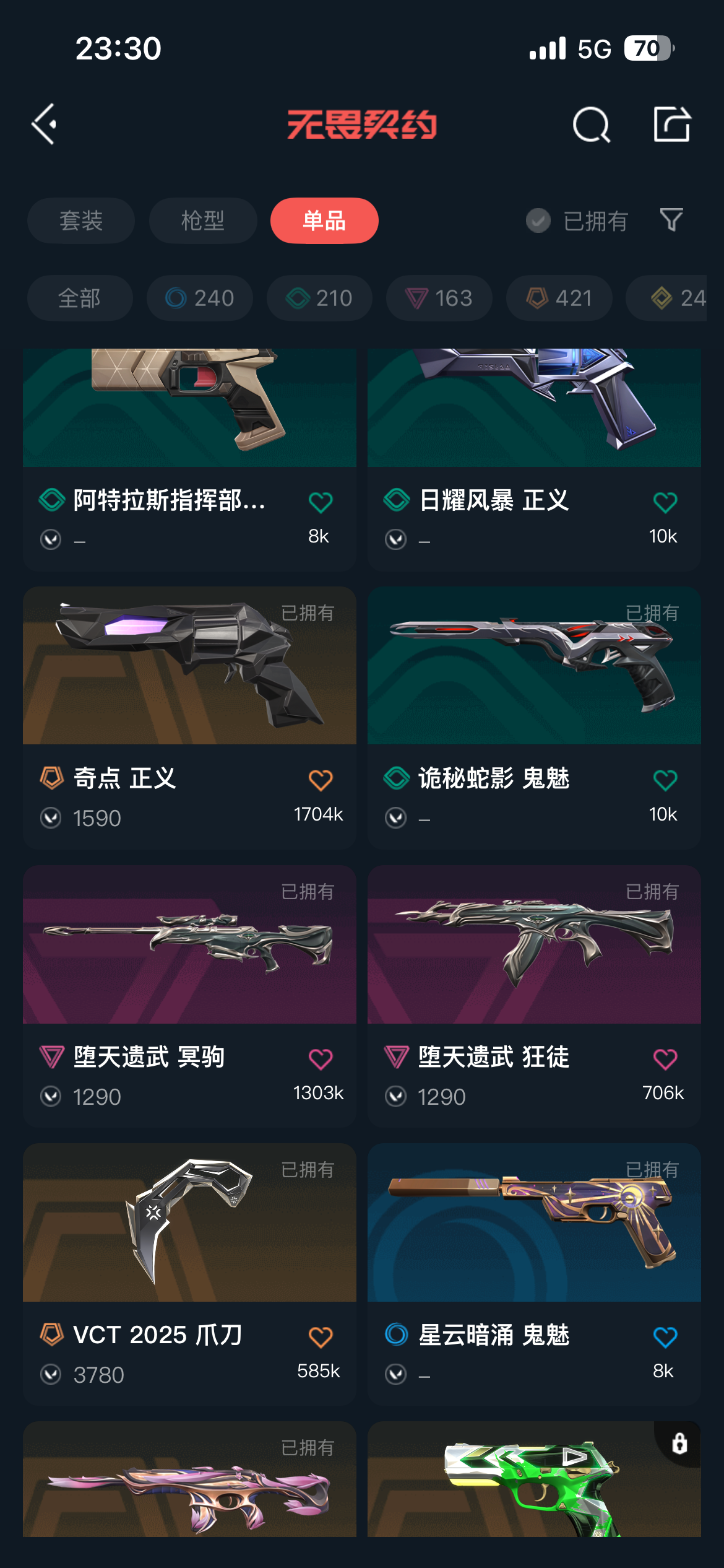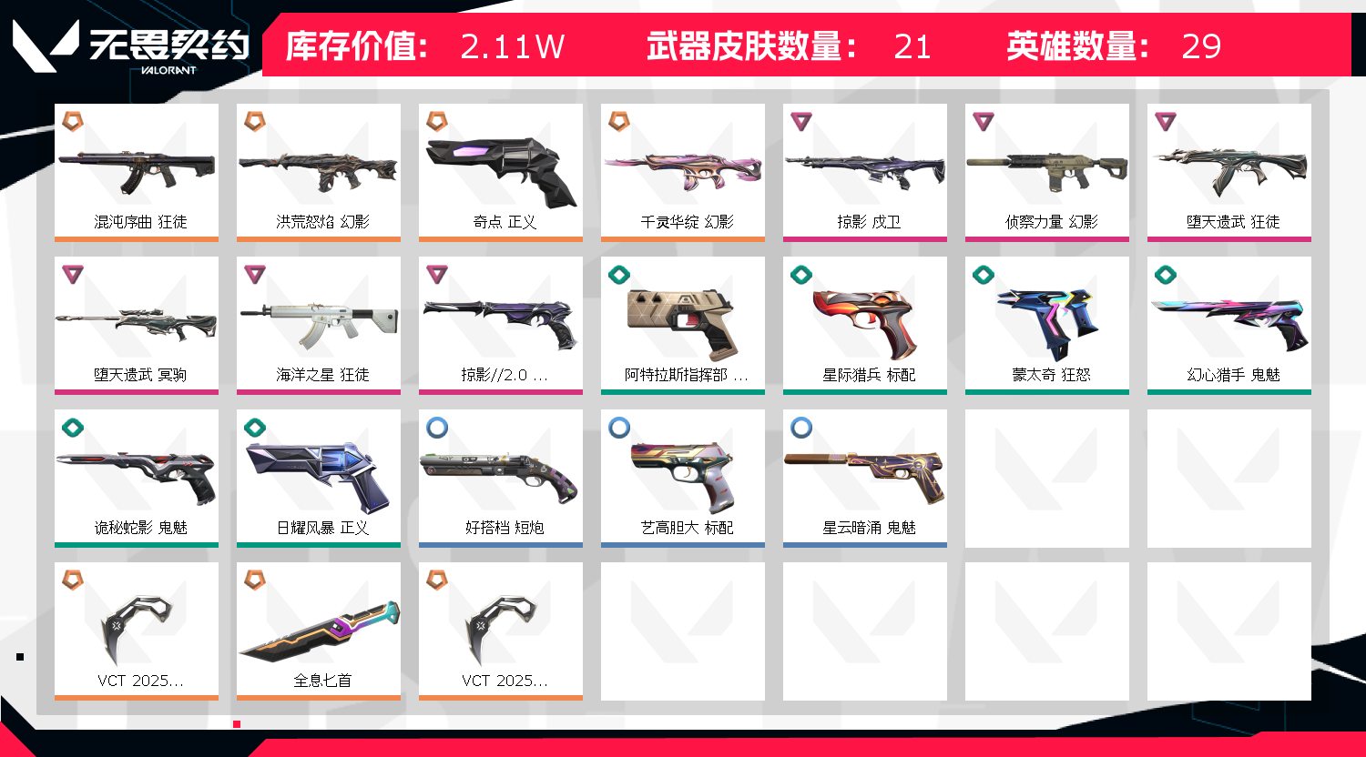 允许 英雄29 武器皮肤数量21;VCT 2025 爪刀,掠影 戍卫,侦察力量 幻影,洪荒怒焰 幻影,堕天遗武 狂徒,混沌序曲 狂徒,堕天遗武 冥驹,