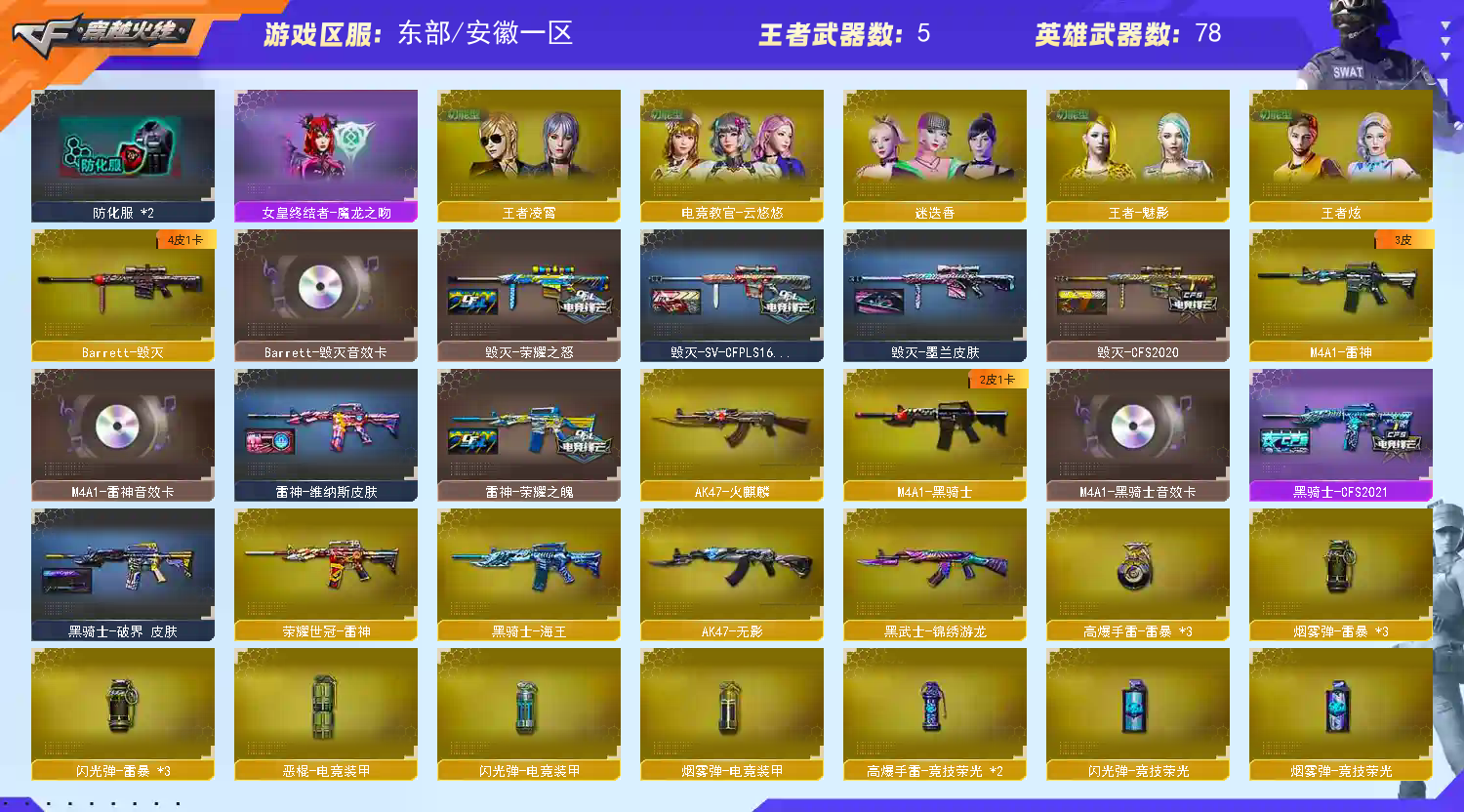 【幻神5皮三件套!!!】【白虎三件套!!!】【qbz03金色蔷薇三件套!!!】【M200幻神*2+幻神音效卡+星火小队签名臻藏版皮肤+荣耀世冠白鲨2023皮肤+cfs2022皮肤+电流骇客皮肤+女团皮肤+冠军之特+炽芒蝶刃+4防云悠悠】【传说暗裔】【白虎+白虎音效卡+巅峰荣耀皮肤】【qbz03金色蔷薇+金色蔷薇音效卡+冠军之薇皮肤】【G36C幻影】【荣耀世冠雷神】【王者之心 王者之势】【雷神+雷神音效卡+荣耀之魄皮肤+CFS十周年纪念版皮肤】【黑骑士+黑骑士音效卡+CFS2021皮肤】【毁灭+毁灭音效卡+荣耀之怒皮肤+CFPLS16冠军皮肤】【无影 黑武士锦绣游龙 源雷神IV 金色蔷薇古蛇迷踪 朱雀电竞之星 黑骑士海王 源毁灭IV 2炼狱 烈龙 AA12雷霆】——【冠军之特 usp雷暴 柯尔特荣耀是冠白鲨2023 沙鹰修罗 沙鹰天神 cop堕天神 柯尔特电竞装甲 柯尔特无冕之王 修罗古蛇迷踪 荣耀世冠柯尔特】——【炽芒蝶刃 屠龙 擎天 斩神刀雷暴 麒麟刺堕天神 龙啸堕天神 马来剑夜魔 屠龙电竞之星】——【雷暴投掷武器套装*3 堕天神投掷武器套装*5 夜魔投掷武器套装 电竞装甲投掷武器套装 竞技荣光投掷武器套装*2 】——【热门武器/小人你枪】【朱雀蛇隐宗 水枪不败狙神 炫金毁灭 cop白鲨 巴雷特零水下丽影 黑桃斩神 斯泰尔蝴蝶】——【角色】【4防(云悠悠 王者魅影 王者炫)】【迷迭香 隼】;USP-雷暴,柯尔特-无冕之王,荣耀世冠-柯尔特,柯尔特-荣耀世冠白鲨2023,柯尔特-冠军之特,炽芒蝶刃,隼,