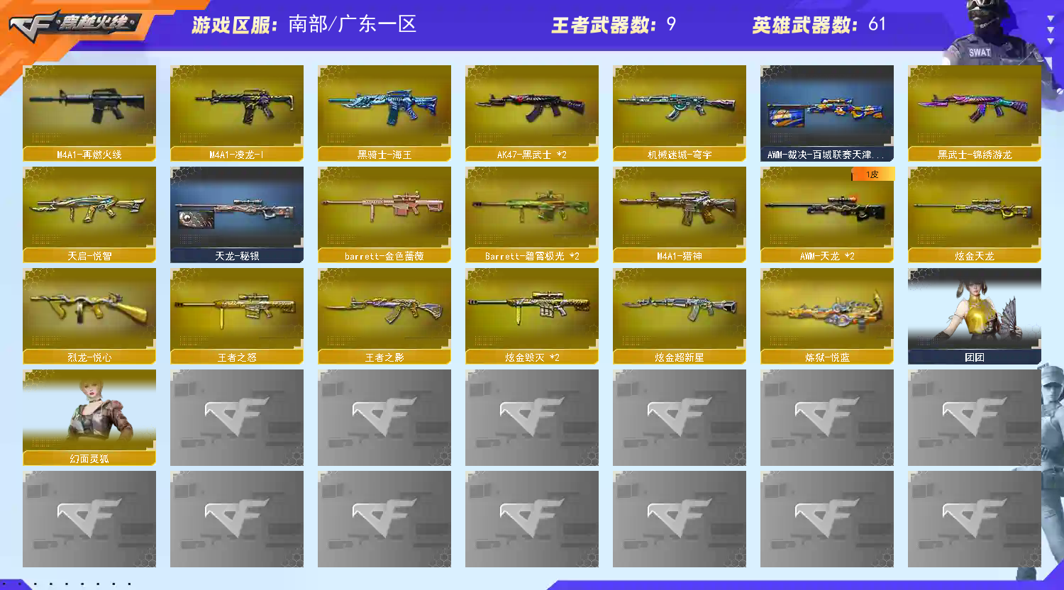 幻神m200、幻影g36c、裁决awm、爆破四防角色王者魅影、6列6盘 重要提示: 号已经在公安局做了虚拟财产登记如果因为外挂行为导致封号平台是实名制平台会提供个人信息不管在哪都能抓住你最后造成的损失由你或你家人承担切勿开挂违法必究该账号已在公安局备案到时请及时续租不要挂机导致禁赛的一律拉黑处理;RPK-盘龙,G36C-幻影,M200-幻神,
