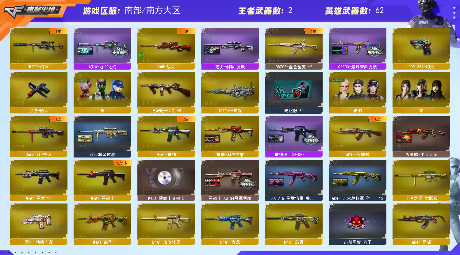 【m200幻神+冠军之幻】【臻选套 擎天柱】【qbz金色蔷薇+巅峰荣耀】【火麒麟】【黑龙】【雷神+s18冠军】【黑骑士+卡】【毁灭】【裁决】【幻灵套】【武器:武圣 青龙 幻灵 炼狱 烈龙*3】【5手枪:修罗 武圣 幻灵 天神】【4刀具:屠龙*2 幻灵之峰 龙啸】【雷套:幻灵雷*6】【音效卡:黑骑士音效卡】【角色:隼 影豹 】;