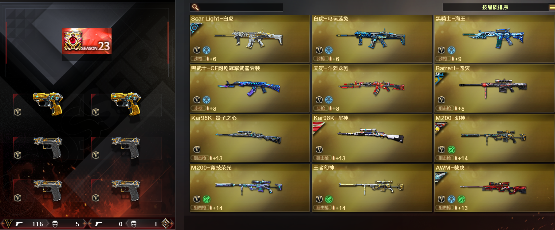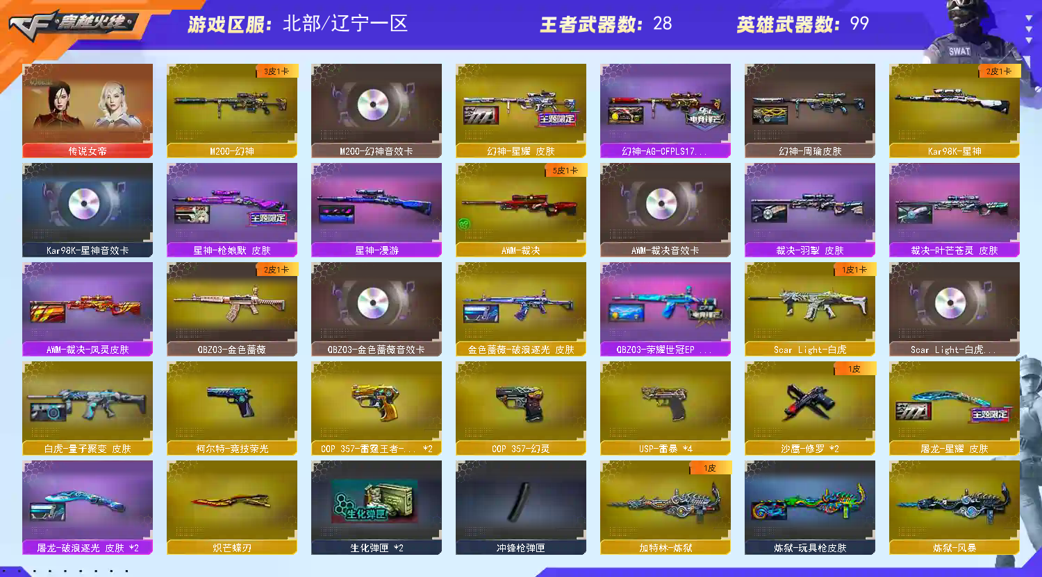 北部极品爆破I传说女帝I幻神AG星神裁决qbz白虎毁灭三件套I98k量子之心I8副手I4把usp雷暴2copI赤芒蝶刃I;USP-雷暴,炽芒蝶刃,传说女帝,电竞教官-云悠悠,QBZ03-金色蔷薇,M200-幻神,Scar Light-白虎,