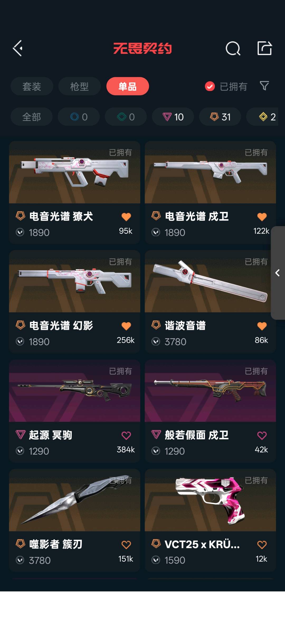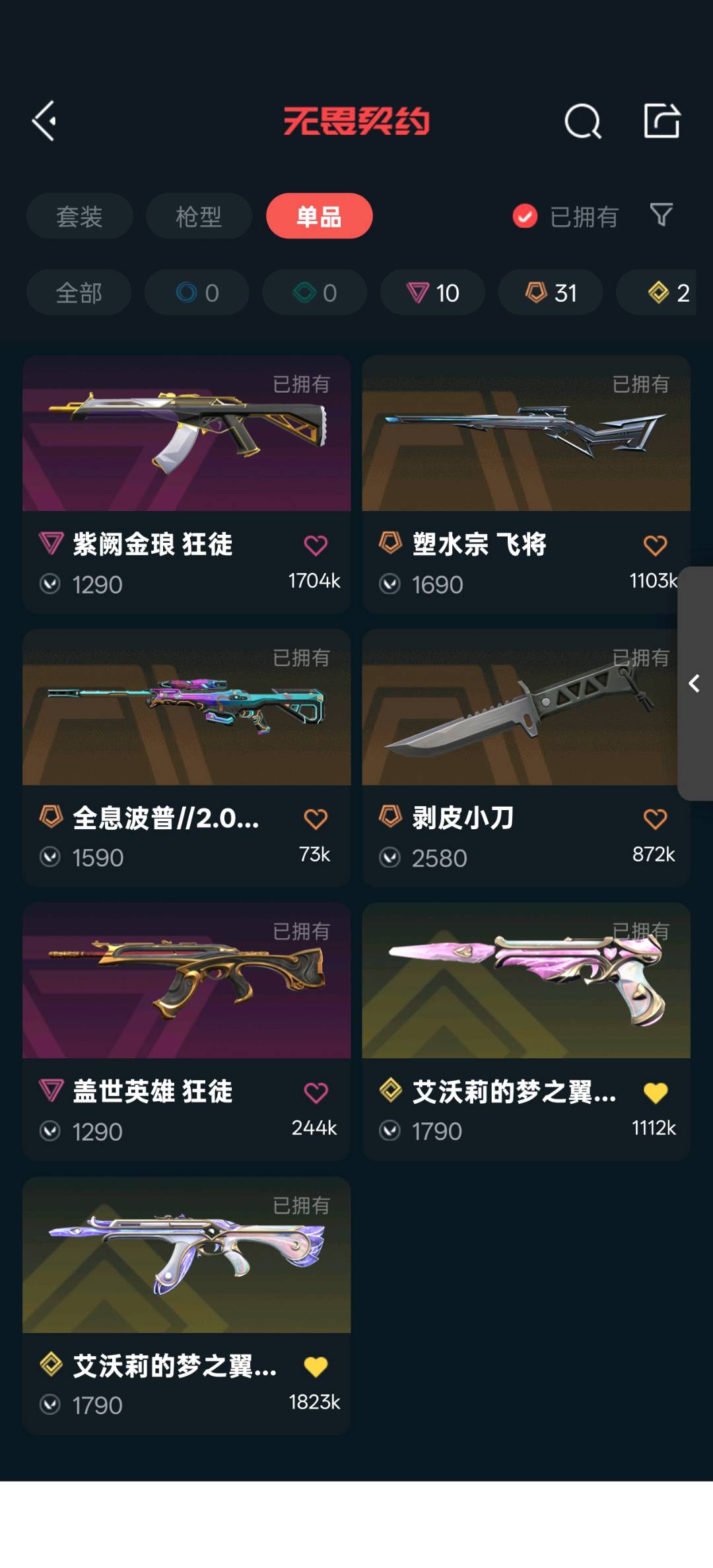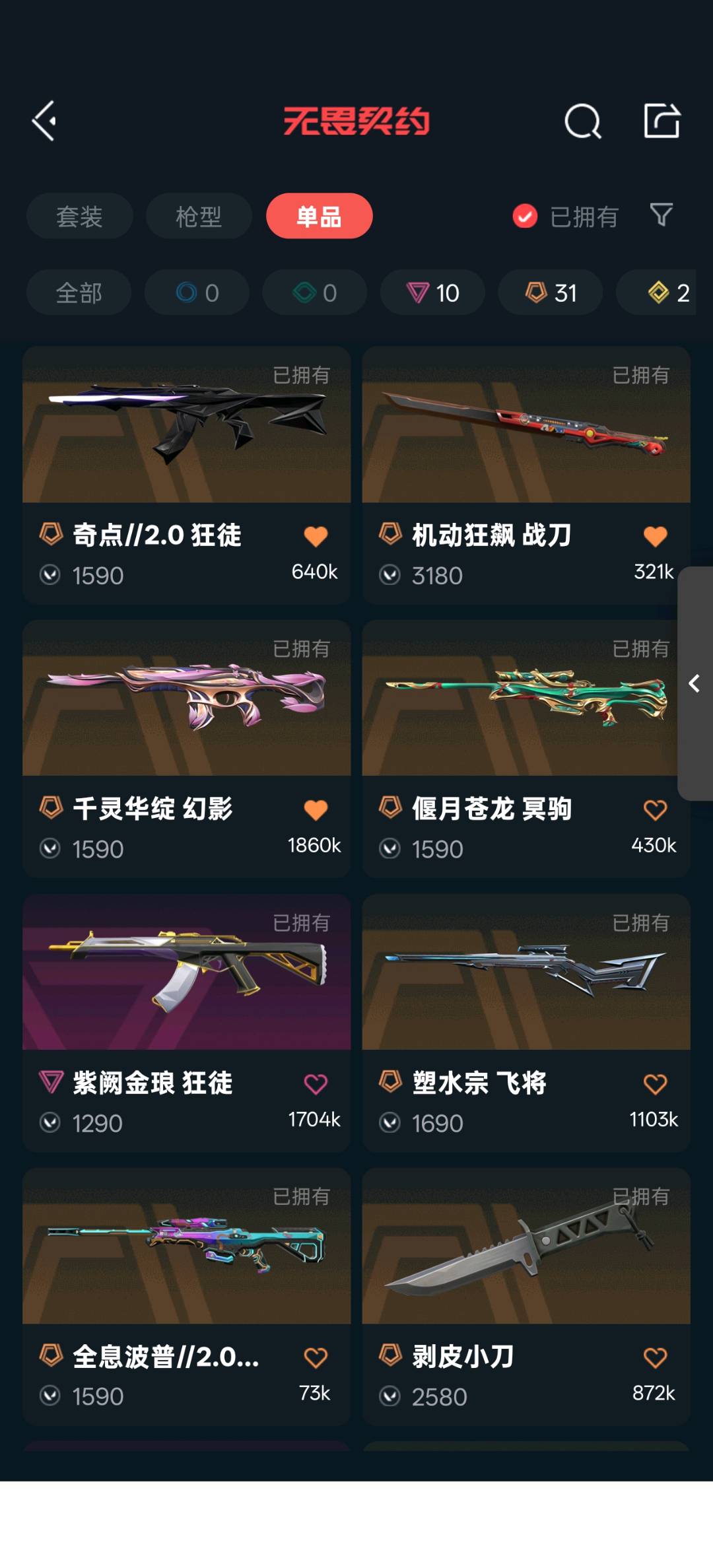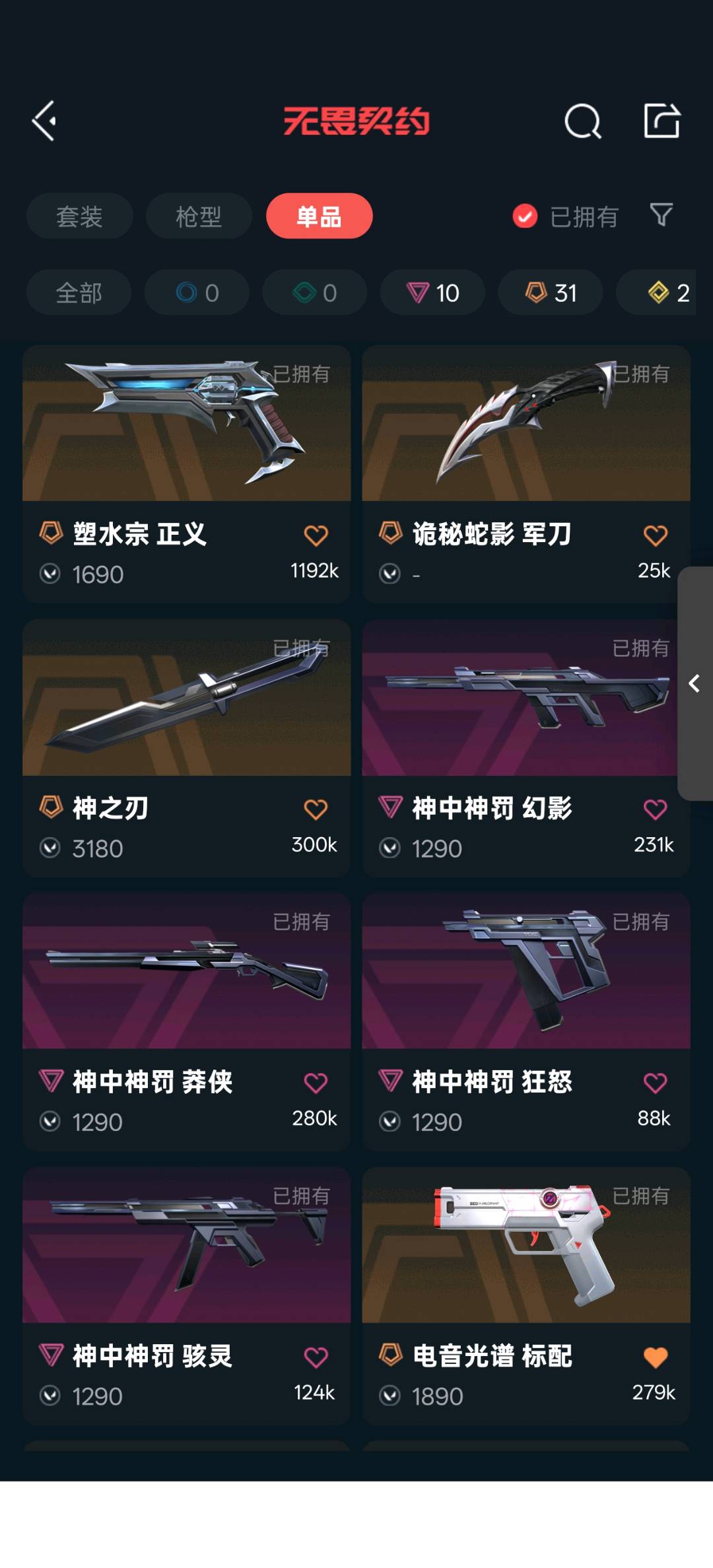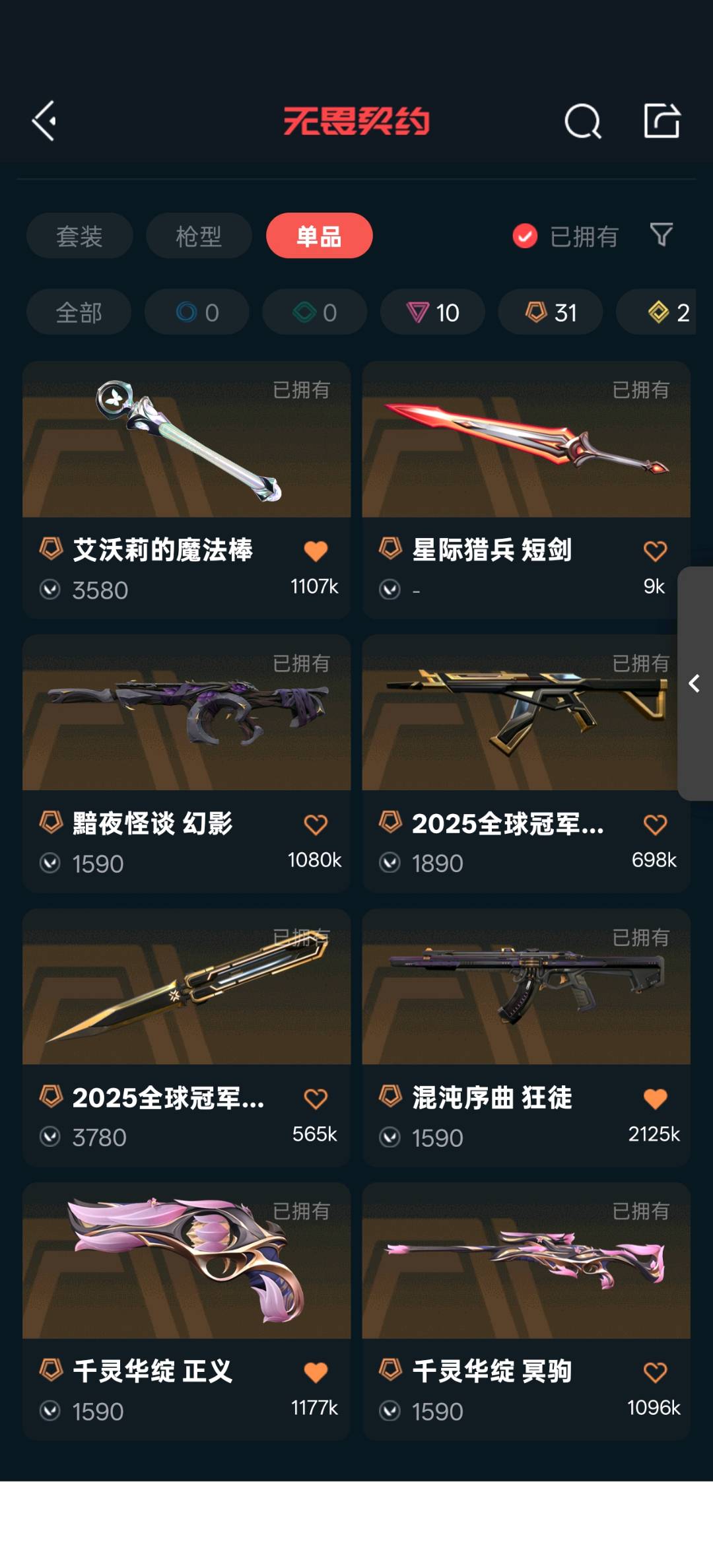 25冠军套,电音光谱套,神中神罚套,vct爪刀,艾沃莉的魔法棒,簇刃,鬼丸国纲,机动狂飙战刀,剥皮小刀,狂徒混沌序曲,机动狂飙,光明哨兵,奇点2.0,紫金,盖世英雄,艾沃莉的梦之翼,幻影黯夜怪谈,侦察力量,正义塑水宗,千灵华绽,冥狙千灵华绽,全息波普,偃月苍龙,起源鬼魅艾沃莉的梦之翼,飞将塑水宗,战神盖亚,奥丁砰砰x特工队;砰砰X特攻队 奥丁,剥皮小刀,VCT 2025 爪刀,侦察力量 幻影,紫阙金琅 狂徒,混沌序曲 狂徒,塑水宗 飞将,