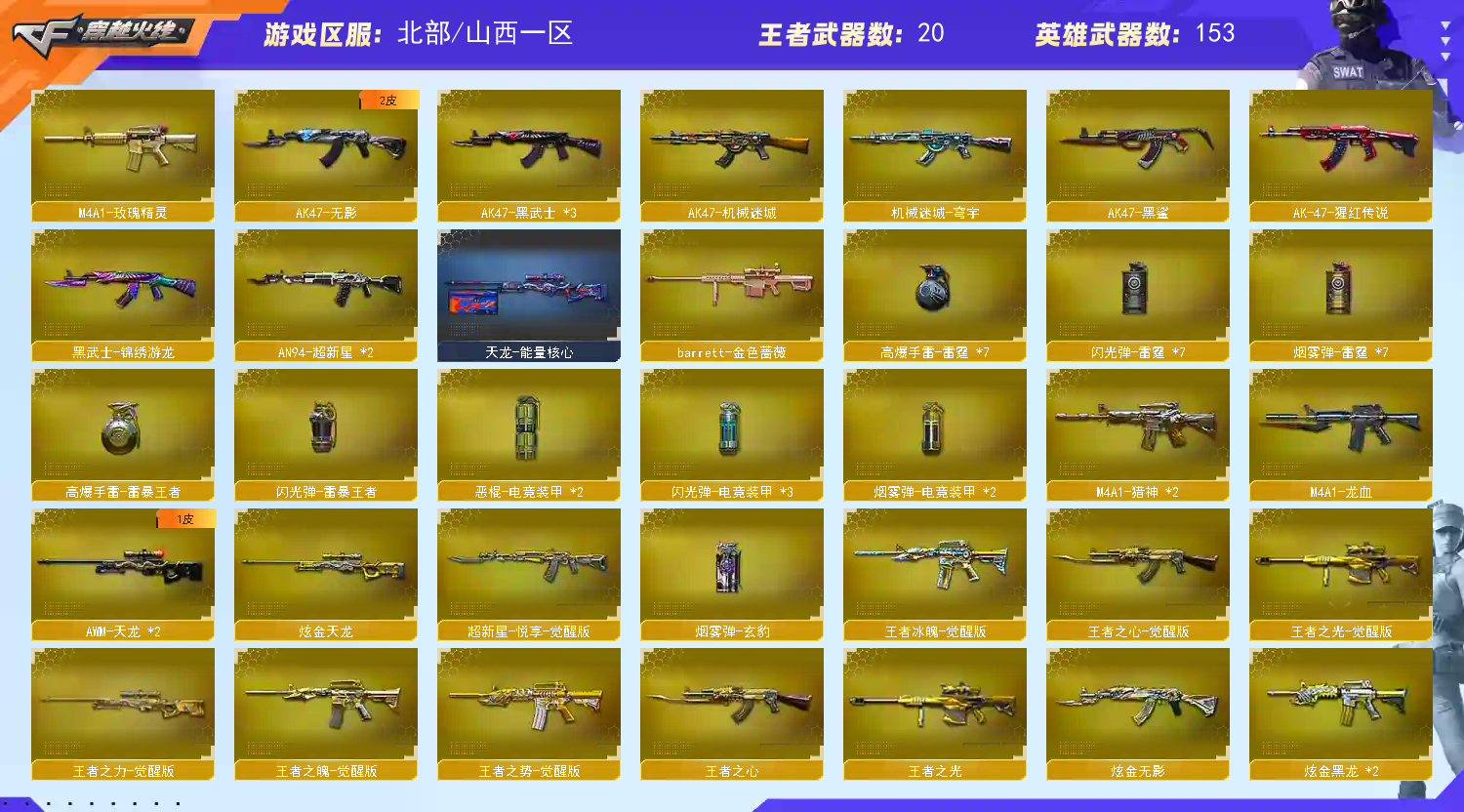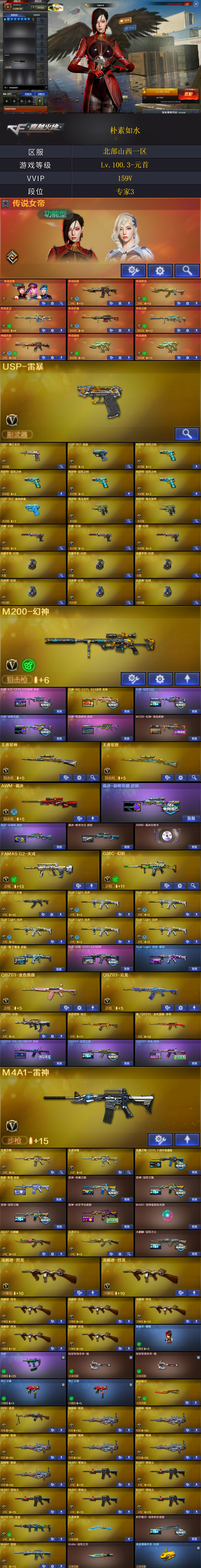 商品标题】:北部山西一区-159V-可二次实名-【Lv.100.3-元首】-【段位:专家3】 【稀有武器】:传说暗裔/传说辉光/传说圣灵/传说梦魇/传说灵眸/传说破晓(2)/M200-幻神/G36C-幻影/ScarLight-白虎(5)/M14EBR-玄武/M4A1-雷霆/雷霆之契/USP-雷暴/柯尔特-电竞装甲(2)/USP-神工天巧/沙鹰-幻兽(3)/柯尔特-冠军之特(4)/QBZ03-云龙/QBZ03-金色蔷薇(2)/QBZ95-幻兽/AK47-火麒麟(2)/M4A1-黑龙/M4A1-雷神(2)/M4A1-黑骑士(5)/AK47-无影/AK47-黑武士(3)/Barrett-毁灭/Barrett-极光(2)/AWM-裁决(2)/RPK-盘龙/加特林-炼狱(6)/汤姆逊-烈龙(7)/炽芒蝶刃/尼泊尔-电竞装甲/云龙扇(3)/女皇利刃-幻兽 【王者武器】:王者之心-觉醒版/王者之魄-觉醒版/王者之光-觉醒版/王者之力-觉醒版/王者星神-觉醒版/王者之心/王者之光/王者星霆 【热门角色】:传说女帝/炫/王者-魅影/王者沙漠玫瑰/空/潘多拉 【热门音效卡】:AWM-裁决音效卡 【热门皮肤】:幻神-AG-CFPLS24冠军皮肤/幻神-冠军之幻/幻神-巅峰荣耀/幻神-电流骇客皮肤/白虎-白鲨-CFPLS23冠军/裁决-巅峰荣耀皮肤/荣耀之魄-CFPL十周年臻藏版/屠龙-星火燎原/擎天-冠军之击/QBZ03-冠军之薇/QBZ03-虎鱼皮肤/炼狱-电子连击皮肤/屠龙-巅峰荣耀皮肤/ScarLight-白虎-暗星/火麒麟-冠军之心/毁灭-冠军之怒/屠龙-荣耀之锋/雷神-冠军之魄(2)/龙啸-冠军之啸/炽芒蝶刃-冠军炽芒皮肤/雷神-虎牙平台皮肤/巴雷特-虎牙平台皮肤/雷神-荣耀之魄 【其他亮点】:斯泰尔-蝴蝶/Knife-冠军之刃/MK5-炽火炎龙/毒蜂/异变清道夫/贝雷塔687-射手座(2)/黄金猫猫手套-白鲨 (截图展示段位不代表实际段位,如赛季更新等不可抗拒因素发生变化,其余道具看截图或咨询客服);USP-雷暴,柯尔特-冠军之特,炽芒蝶刃,Knife-冠军之刃,传说星骇,传说女帝,王者沙漠玫瑰,