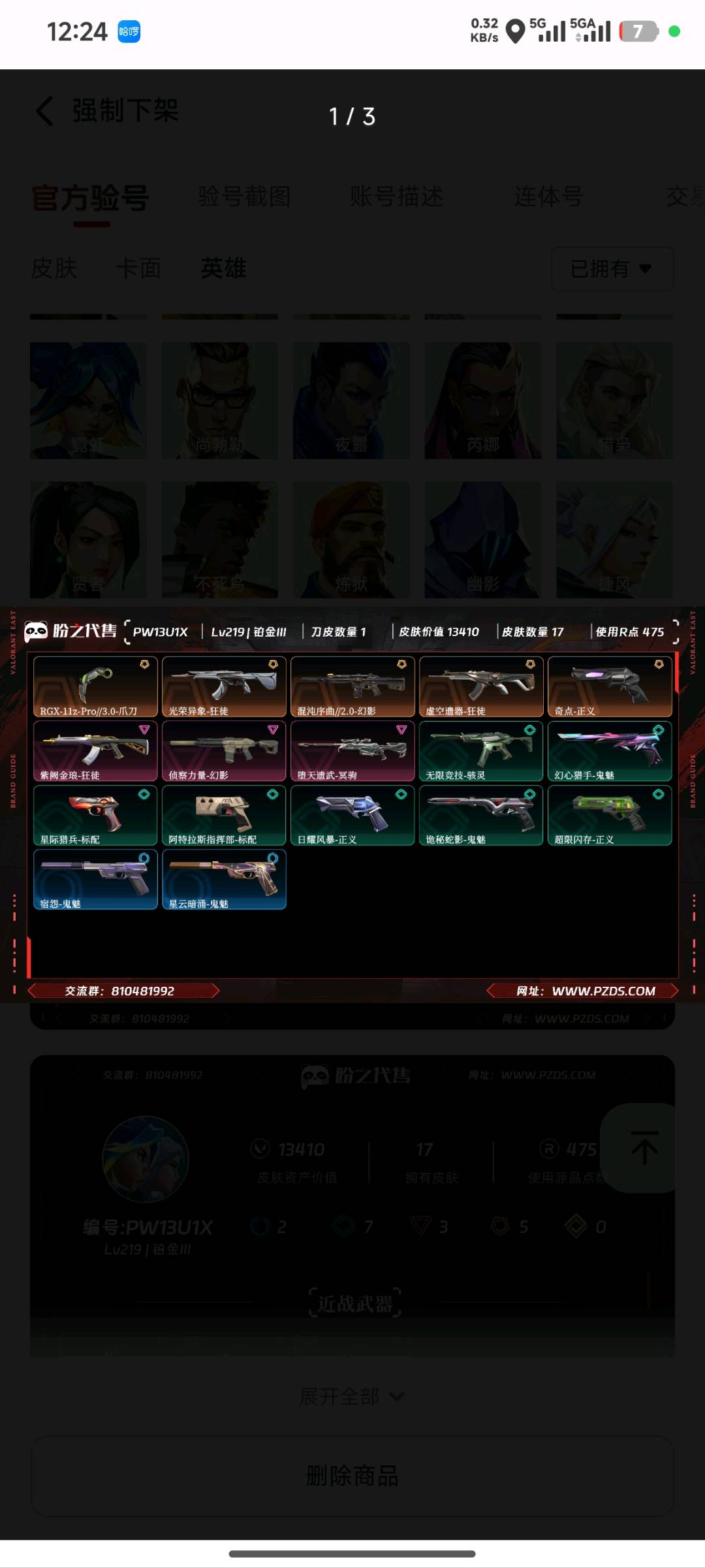 Lv219 ,皮肤总价值13410,铂金III,总皮肤17,刀皮1枪皮16(传奇4卓越3) 高校特权