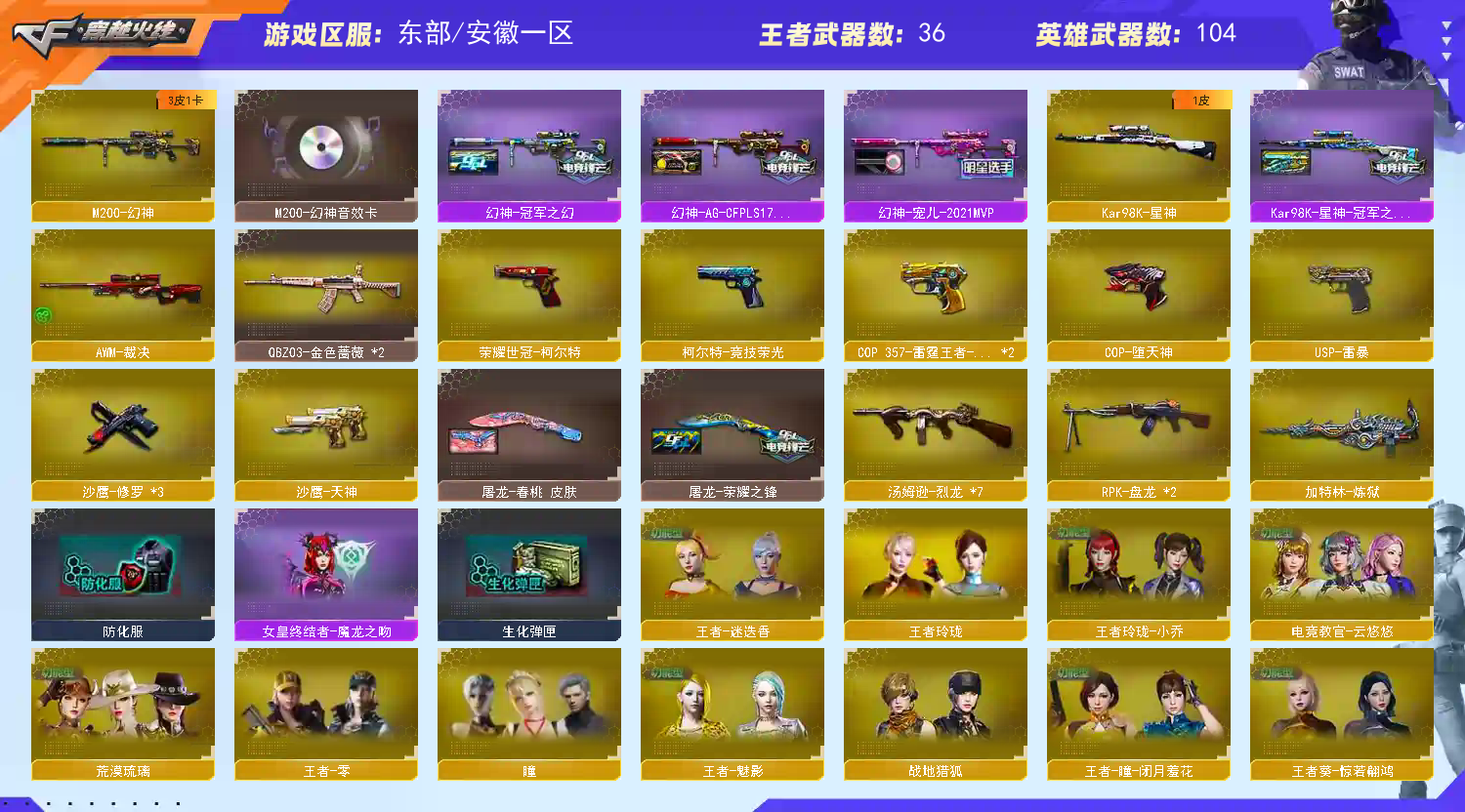可打字❤幻神音效卡+冠幻+宠儿+AG❤星神冠军之星❤裁决❤白虎❤USP雷暴❤COP堕天神❤世冠柯尔特 ❤由于排位新赛季改版,麻烦各位老板新赛季排位不要随意退排位会禁赛,还有希望冬位老板如果上号发现还有未结束的排位赛,可以接上打完,在此谢谢了❤ 【温馨提示】开始登录游戏时不要动鼠标,静等一两分钟,多次登录不上就选择(F9)账号密码登录即可! 登录不上请耐心多尝试几次 登号时别动鼠标登录不上请耐心多尝试几次 登号时别动鼠标登录不上请耐心多尝试几次 登号时别动鼠标 由于异地登录保护机制,部分客户在使用客户端自动上号时会 出现密码错误,注意本号密码不会错误,请多尝试5-6次! 安全分不足时大厅匹配游戏即可。谢谢! 多四防角色,各种皮肤武器光效玩偶道具,欢迎来体验!武器 太多,截不了那么多图! 【温馨提示】此号价值数十万,如有开G开辅助封号的,想想 自己是否能够承担的起后果自负,由平台提供,身份信息,证据和地址进行报警处理!祝各位老板玩得开心。请使用官方启动,更快捷稳定上号。偶尔会异地冻结,显示暂时无法登陆,请维权更新密码,商品完成维权代表密码已更新,再次下单即可,带来不便,抱歉。恶意下单维权及检测到外挂将无法再次下单! 【游戏小贴士】官方启动高配置电脑分辨率调整144hz刷新率16:9比例1920*1080画面更清晰,设置好分辨率结束游戏重新打开游戏界面登录(不退游戏登录器)无黑屏,关闭击中效果,开启饰品确认攻击,游戏体验更佳。 【请租客爱护此号,当成自己号玩,喜欢请收藏,感谢】;USP-雷暴,荣耀世冠-柯尔特,电竞教官-云悠悠,RPK-盘龙,QBZ03-金色蔷薇,M200-幻神,Kar98K-星神,