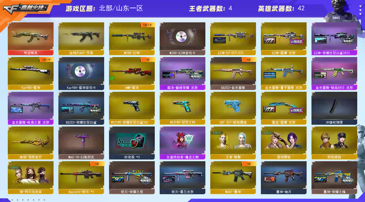 幻神三皮带卡。星神带卡。冠军之特。白鲨柯尔特。雷神荣耀。白鲨QBZ。裁决颠峰荣耀。传说辉光。细节看图;柯尔特-荣耀世冠白鲨2023,柯尔特-冠军之特,QBZ03-金色蔷薇,M200-幻神,加利尔ACE-天袭,Kar98K-星神,