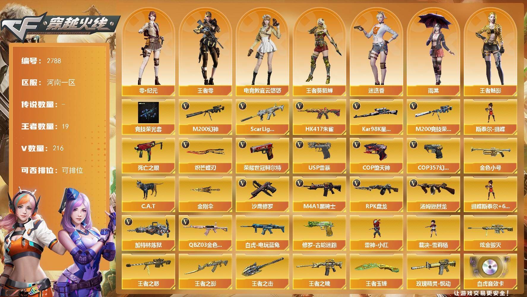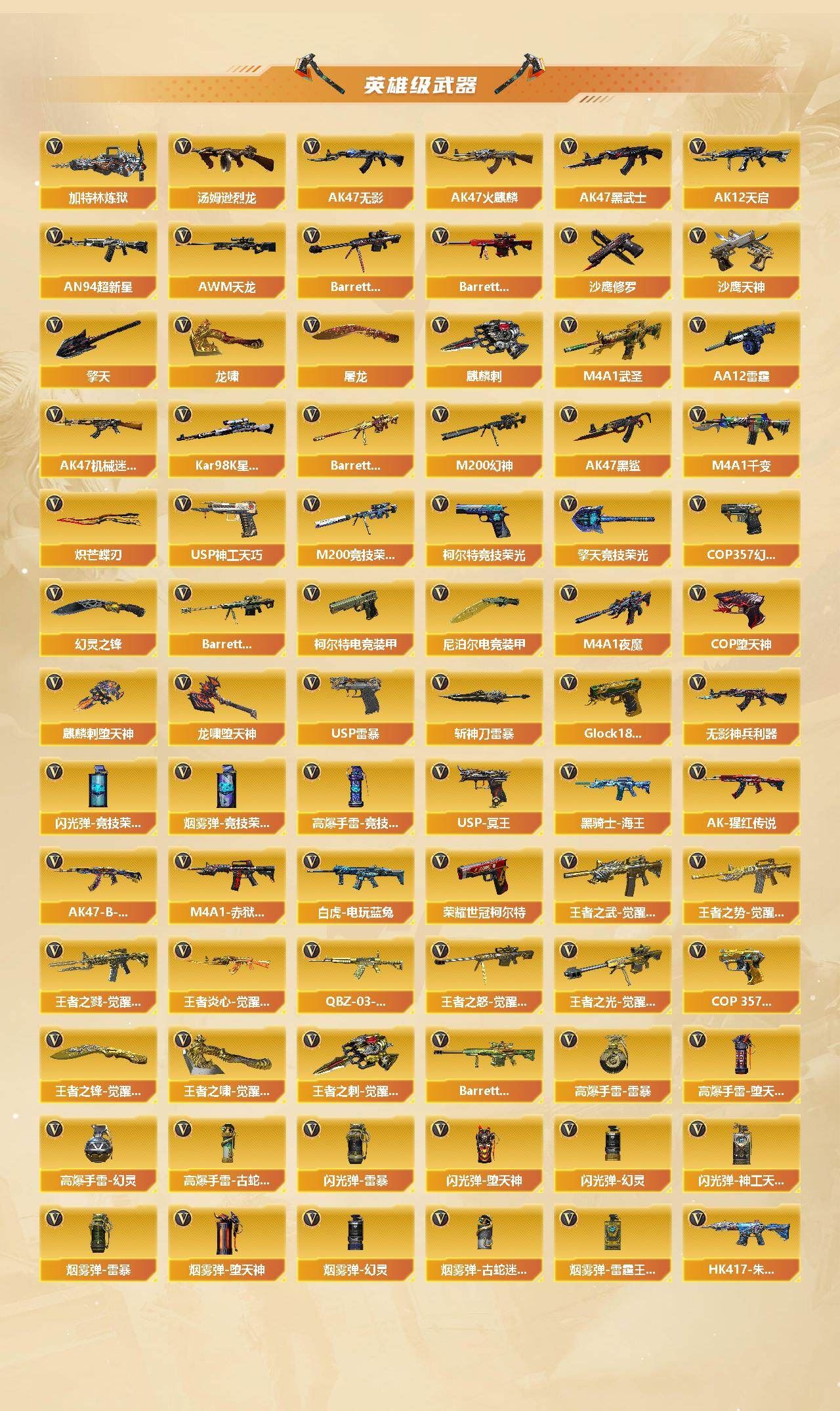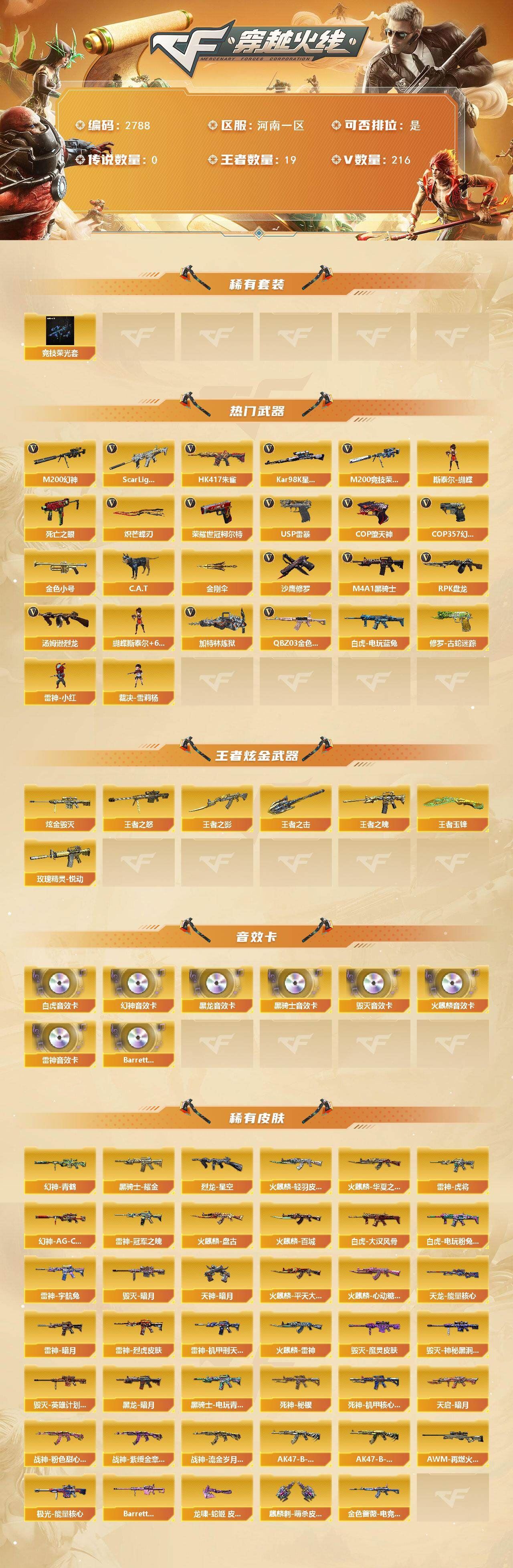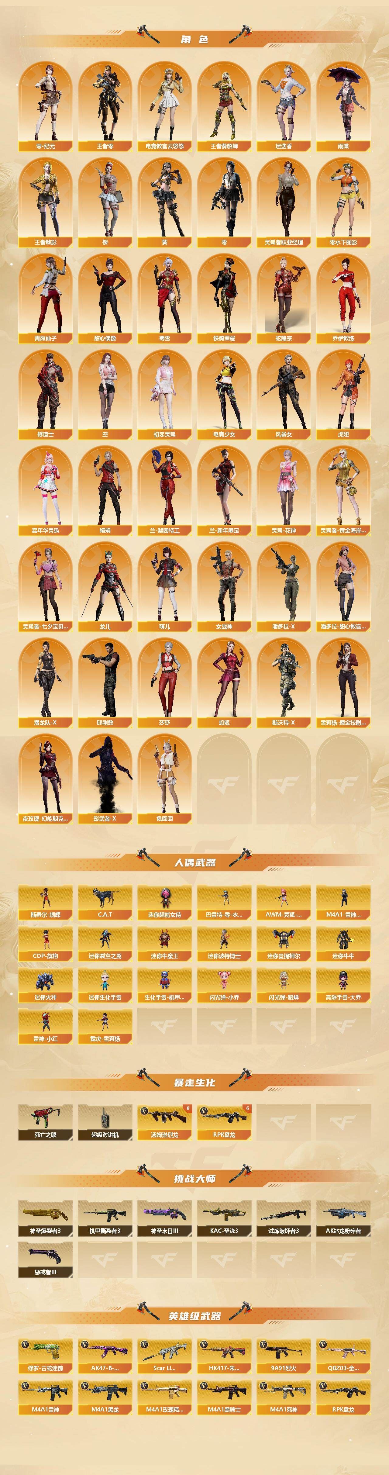 【热门武器】:QBZ03-金色蔷薇,Scar Light-白虎,HK417-朱雀,M200-幻神,修罗-古蛇迷踪,M200-竞技荣光,死亡之眼,白虎-电玩蓝兔,荣耀世冠-柯尔特,Kar98K-星神,金色小号,C.A.T,M4A1-黑骑士,汤姆逊-烈龙*9,RPK-盘龙*8,加特林-炼狱,斯泰尔-蝴蝶,雷神-小红,裁决-雪莉杨,USP-雷暴,COP-堕天神,COP 357-幻灵,沙鹰-修罗*9,炽芒蝶刃,金刚伞【王者炫金武器】:玫瑰精灵-悦动,王者之影,王者之魄,王者之怒,王者之击,王者玉锋,炫金毁灭【音效卡】:M200-幻神音效卡,AK47-火麒麟音效卡,M4A1-雷神音效卡,M4A1-黑龙音效卡,M4A1-黑骑士音效卡,Barrett-毁灭音效卡,Scar Light-白虎音效卡,Barrett-碧霄极光音效卡【皮肤】:幻神-AG-CFPLS17冠军,幻神-青鹤,白虎-大汉风骨,白虎-电玩粉兔皮肤,金色蔷薇-电竞之星 皮肤,烈龙-星空,雷神-暗月,雷神-虎将,雷神-冠军之魄,雷神-烈虎皮肤*3,雷神-机甲刑天皮肤,雷神-宇航兔皮肤,火麒麟-雷神,火麒麟-华夏之心,火麒麟-轻羽皮肤,火麒麟-平天大圣,火麒麟-盘古,火麒麟-百城,火麒麟-心动糖果,毁灭-暗月,毁灭-魔灵皮肤,毁灭-神秘黑洞皮肤,毁灭-英雄计划 皮肤,黑龙-暗月*2,黑骑士耀金皮肤,黑骑士-电玩青兔皮肤,死神-秘银*2,死神-机甲核心皮肤,天启-暗月,战神-粉色甜心皮肤*2,战神-紫绶金章皮肤*2,战神-流金岁月皮肤,AK47-B-常胜将军-刘备*3,AK47-B-常胜将军-孙权,天龙-能量核心,AWM-再燃火线,极光-能量核心*3,Barrett-金色蔷薇-蛇姬 皮肤,天神-暗月*2,龙啸-蛇姬 皮肤,麒麟刺-萌杀皮肤【角色】:零,葵,樱,迷迭香,雨棠四防,电竞教官-云悠悠四防,零·纪元,王者-葵-貂蝉四防,王者-零,王者-魅影四防,蛇隐宗,乔伊教练,修道士,空,初恋灵狐,电竞少女,风暴女,虎妞,嘉年华灵狐,娟娟,兰-梨园特工,兰-新年限定,零-水下丽影,灵狐-花神,灵狐者-黄金海岸,灵狐者-七夕宝贝,灵狐者-职业经理,龙儿,萌儿,女战神,潘多拉-X,潘多拉-甜心教官,潜龙队-X,邱刚敖,青霞仙子,莎莎,蛇姬,斯沃特-X,甜心偶像,蜀雪,铁骑荣耀,兔囡囡,雪莉杨-摸金校尉,夜玫瑰-幻能朋克,影武者-X【特殊枪械】:蝴蝶斯泰尔+6烈龙,1白虎,1黑骑士,6烈龙,6盘龙,1炼狱,1蝴蝶斯泰尔【稀有套装】:竞技荣光套【人偶武器】:雷神-小红,裁决-雪莉杨,M4A1-雷神-精英刀锋,斯泰尔-蝴蝶,巴雷特-零-水下丽影*2,AWM-灵狐-15周年嘉年华,COP-旗袍,C.A.T,迷你裂空之翼,迷你牛魔王,迷你波特博士*15,迷你曼提柯尔,迷你牛牛,迷你火种*3,迷你生化手雷,生化手雷-机甲核心*2,闪光弹-小乔*2,闪光弹-貂蝉,高爆手雷-大乔,迷你超能女侍【暴走生化】:死亡之眼,超级对讲机【挑战大师】:神圣爆裂者III,AK47-冰龙粉碎者,机甲撕裂者III,试炼破坏者III,KAC-圣炎切割者III,神圣爆裂者-末日III,惩戒者III,工具钳,手雷包,;