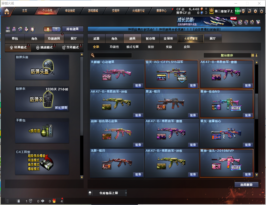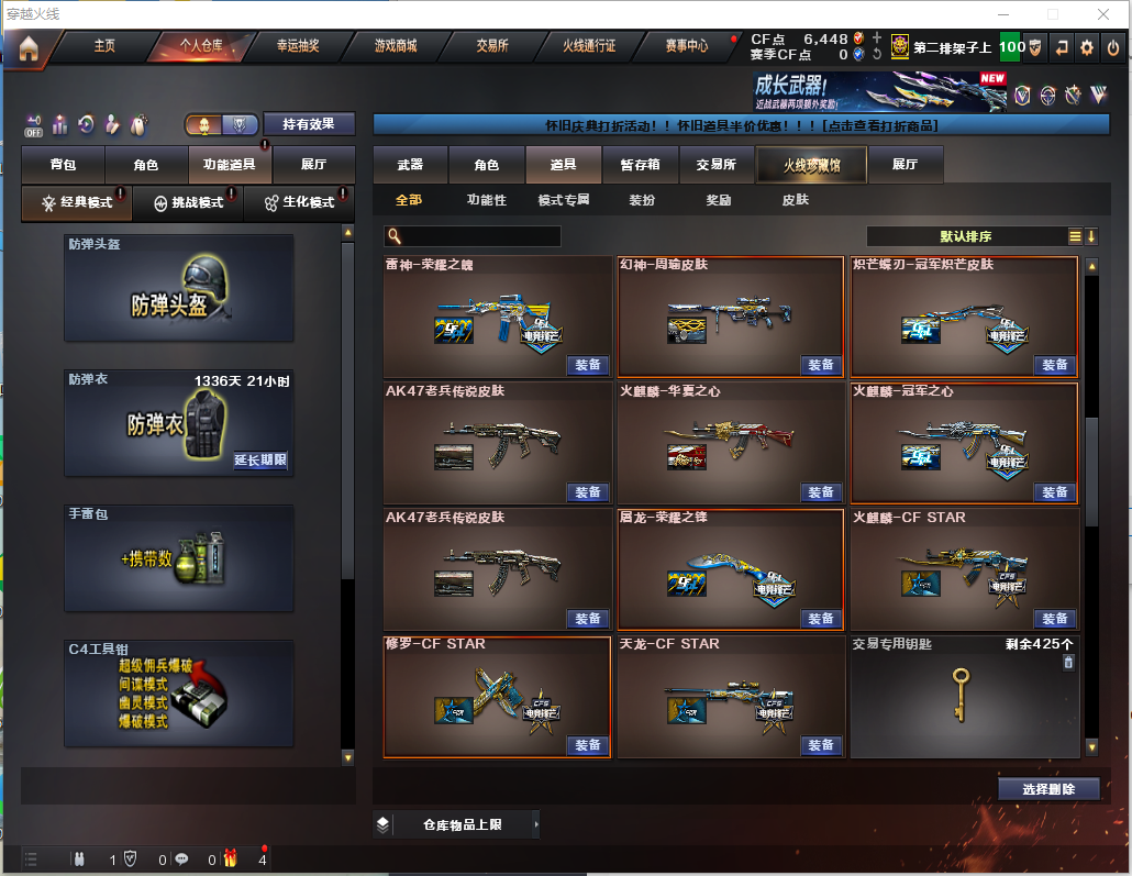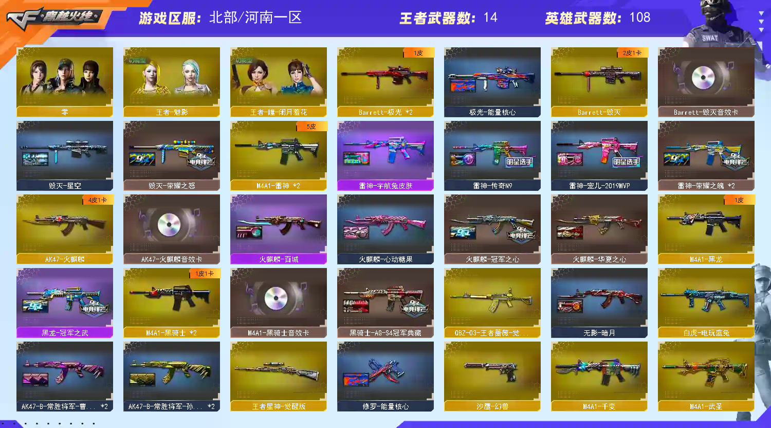 【幻神3皮+卡+周瑜/N9/2021/】3盘2炼7烈/炽芒蝶刃/ 【步枪】千变/火麒麟/黑龙/雷神/黑骑士/无影/天启/武圣/雷暴/白虎幻灵/无影神兵利器/金色蔷薇/王者之势/超新星悦享/王者蔷薇/白虎电玩蓝兔 【狙击枪】天龙/毁灭/激光/裁决/幻神/金色蔷薇/暗月传说/王者之星 【机枪】盘龙x3/炼狱x2/ 【冲锋枪】烈龙x7 【散弹枪】 【挑战强化武器】黑骑士/白虎/王者之势/超新星悦享/白虎电玩蓝兔/裁决/盘龙x3/炼狱x2/烈龙x7 【生化武器】AK雷暴/M4幻灵/QBZ金色蔷薇/裁决/幻神 【手枪】修罗x3/天神x2/USP雷暴x2/柯尔特电竞装甲x2/COP幻灵/柯尔特无冕之王/沙鹰幻兽/荣耀世冠柯尔特x2/COP雷霆王者/柯尔特冠军之特x2 【刀】屠龙x5/龙啸/擎天/麒麟刺/尼泊尔x2/斩神刀雷暴/麒麟刺堕天神/幻灵之锋/炽芒碟刃/女皇利刃/幻兽/王者之锋/王者之击/荣耀世冠龙啸/ 【手雷】雷霆手雷x2/雷暴手雷x5/堕天神手雷/幻灵手雷x2/幻灵手雷/雷霆闪光弹x2/雷暴x5/堕天神闪光弹/电竞装甲/闪光弹幻灵x3/竞技荣光闪光弹/闪光弹幻兽/雷霆王者闪光弹/雷霆烟雾弹x2/雷暴烟雾弹x5/堕天神/电竞装甲/幻灵烟雾弹x2/幻兽烟雾弹 【角色】零/影豹/王者葵貂蝉/王者迷迷享/王者瞳闭月羞花/王者魅影 【卡】黑骑士卡/毁灭卡/火麒麟卡/幻神卡 【皮肤】黑骑士白马银枪/幻神N9/幻神宠儿/火麒麟百城/雷神宇航员/黑龙冠军之武/擎天冠军之击/QBZ冠军之薇/屠龙荣耀世冠/毁灭AG15冠军/雷神宠儿/黑骑士AGS4冠军典藏/雷神荣耀之魄/毁灭荣耀之怒/幻神周瑜/炽芒蝶刃冠军炽芒/火麒麟华夏之心/火麒麟冠军之心;USP-雷暴,柯尔特-无冕之王,荣耀世冠-柯尔特,柯尔特-冠军之特,炽芒蝶刃,Knife-冠军之刃,RPK-盘龙,