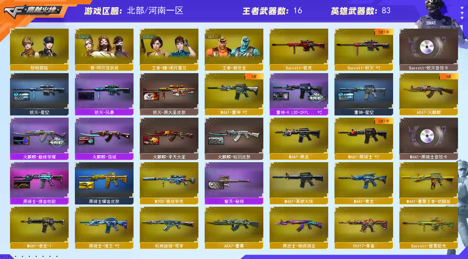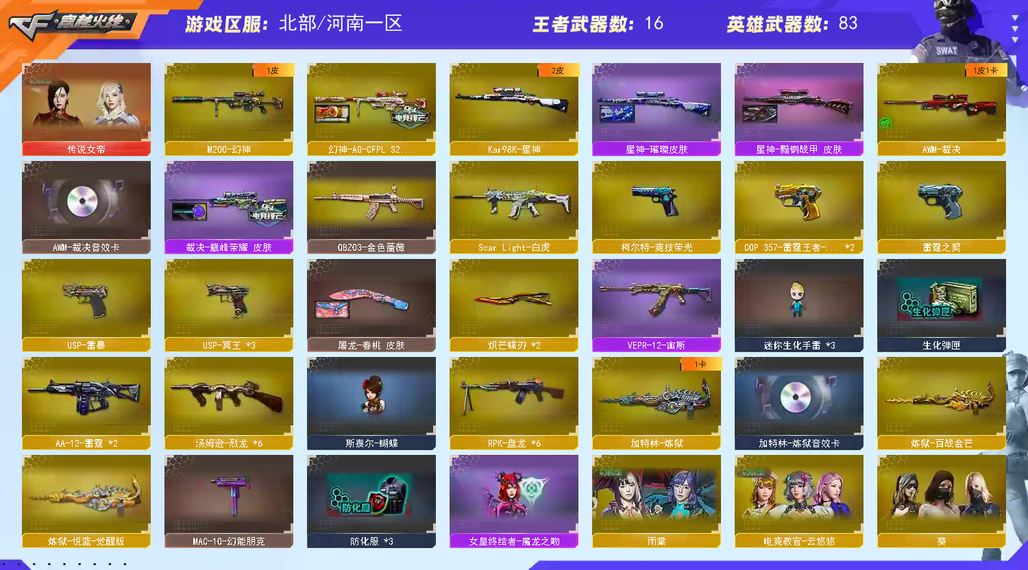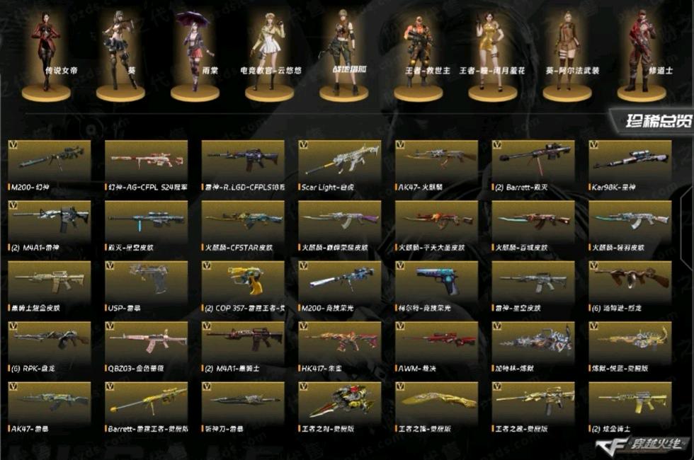 VIP6 96V,5王者,2炫金,幻神AGCFPL S24冠军 /星神黯钢战甲 /星神璀璨/毁灭星空/毁灭风暴/毁灭黑大圣/巴雷特SV/天龙CFSTAR/裁决巅峰荣耀 /火麒麟CFSTAR/传说女帝 _葵/雨棠/电竞教官-云悠悠/战地猎狐/M200-幻神/M200-竞技荣光/Barrett-毁灭(2)/Barrett-极光/Barrett-朱雀/竞技荣光套装/雷暴套装/雷霆王者套装/HK417-朱雀音效卡/M4A1-黑骑士音效卡/Barrett-毁灭音效卡/AWM-昌龙-怀旧音效卡/AWM-裁决音效卡/Barrett-碧霄极光音效卡/炼狱-百战金芒-庆典舞曲音效卡/加特林-炼狱音效卡;