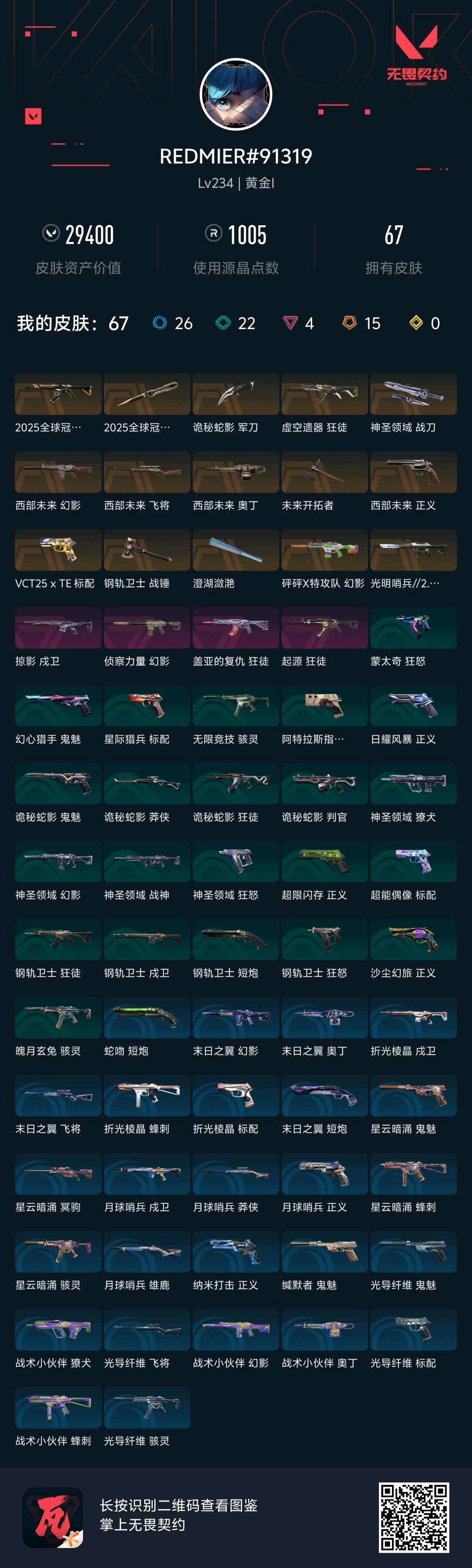 可排位 英雄28 武器皮肤数量67;西部未来 奥丁,盖亚的复仇 狂徒,虚空遗器 狂徒,掠影 戍卫,侦察力量 幻影,西部未来 飞将,西部未来 正义,