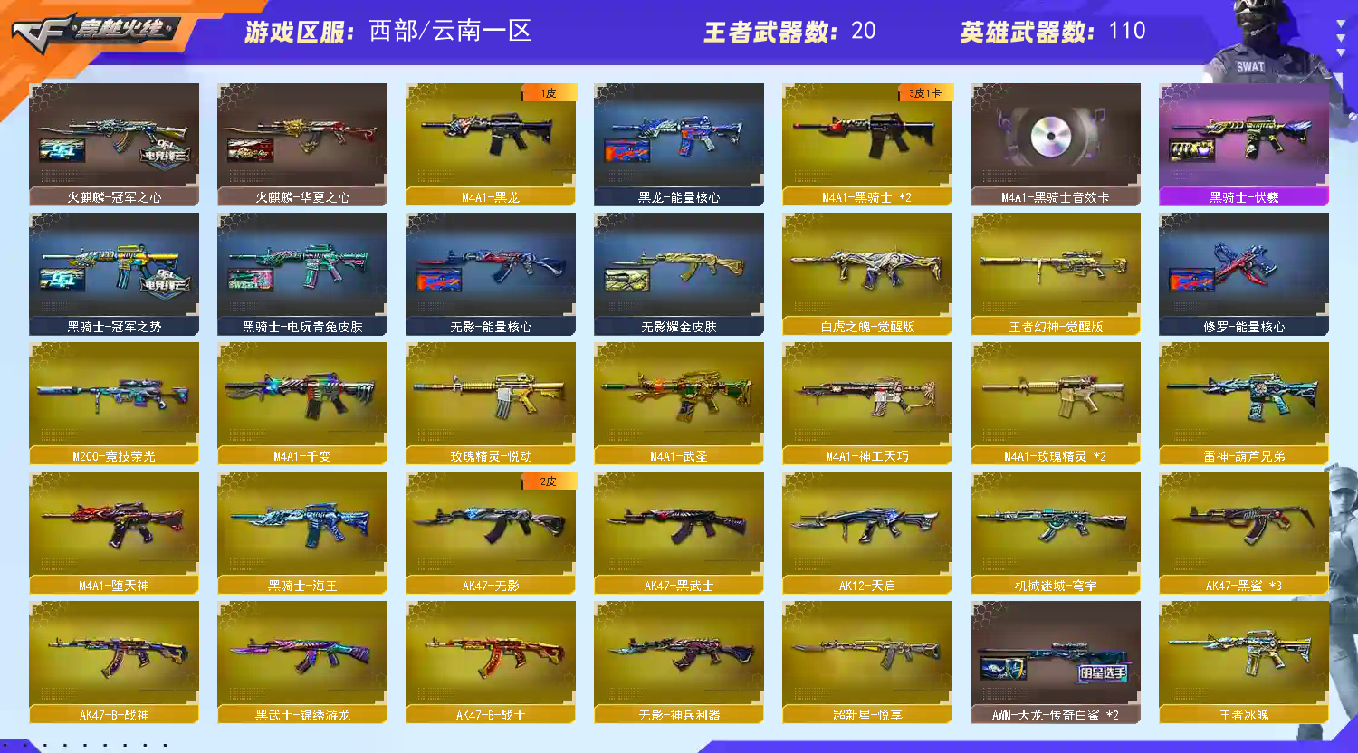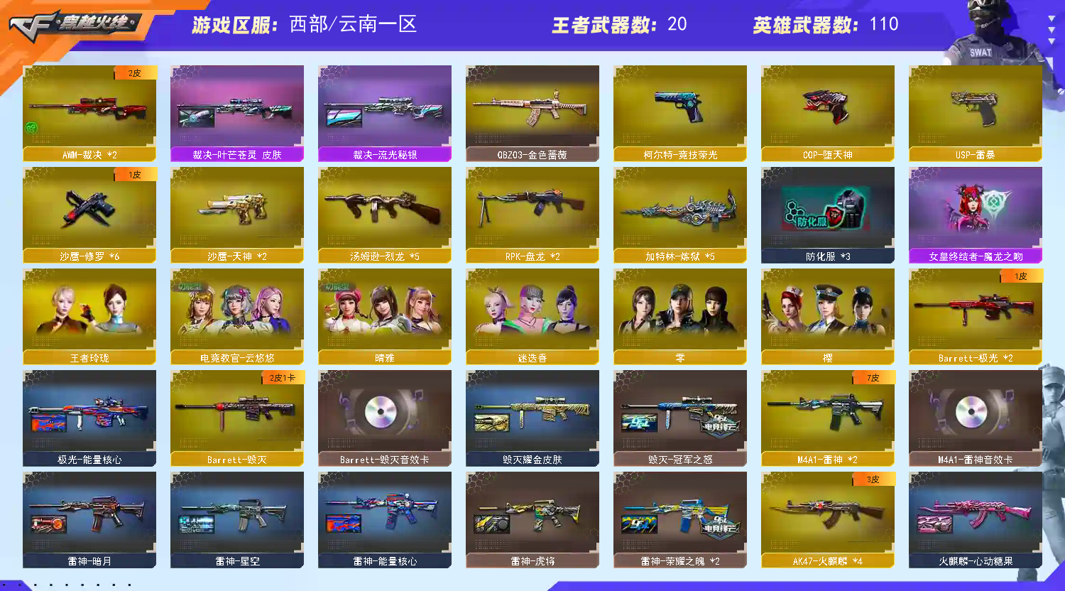 m200竞技荣光套+usp雷暴+四防云悠悠】【王者幻神】【5烈龙 死亡之眼 盘龙*2 炼狱*5】【白虎之魄】【qbz金色蔷薇】【火麒麟+冠军之心】【黑龙】【雷神+卡+荣耀之魄】【黑骑士+卡+冠军之势】【毁灭+卡+ag15冠军+冠军之怒】【极光】【裁决+叶芒苍灵】【堕天神套装/竞技荣光套装】【武器:武圣 堕天神 神工天巧 海王 王者之心 王者之魄】【12手枪:修罗*6 天神*2 武圣 雷暴 堕天神 竞技荣光】【15刀具:屠龙*3 龙啸*4 擎天 麒麟刺*2 堕天神 幻灵之峰 竞技荣光 神工天巧 王者之击】【9雷套:堕天神雷*6 幻灵雷*3】【音效卡:雷神音效卡 黑骑士音效卡 毁灭音效卡】【四防角色:云悠悠 晴雅;USP-雷暴,电竞教官-云悠悠,晴雅,RPK-盘龙,QBZ03-金色蔷薇,