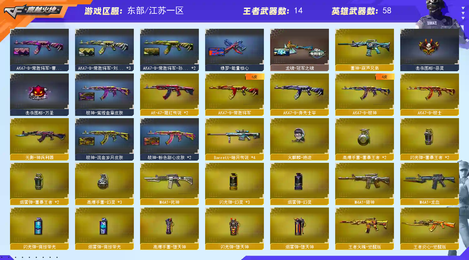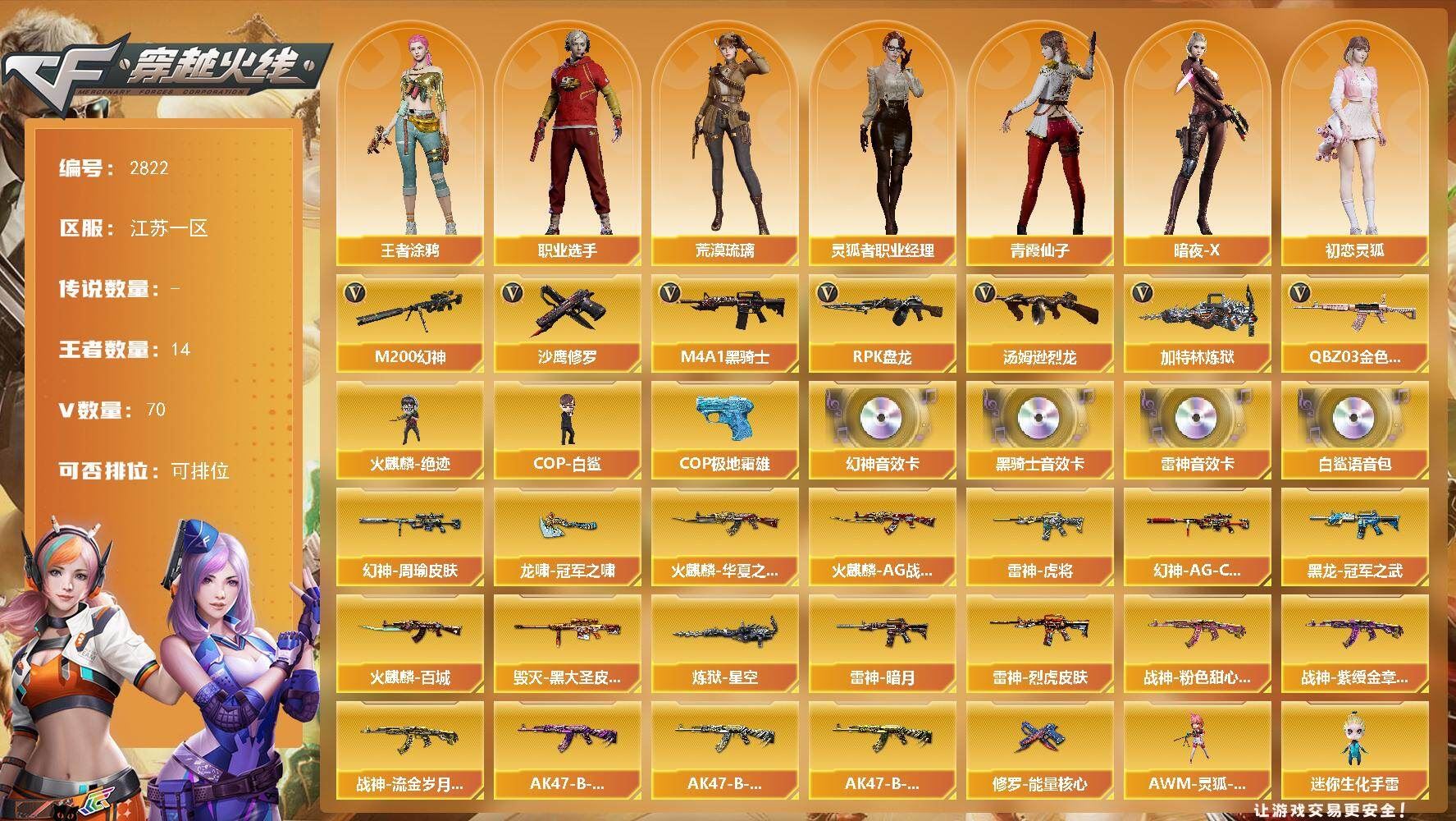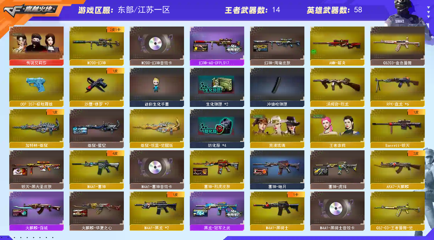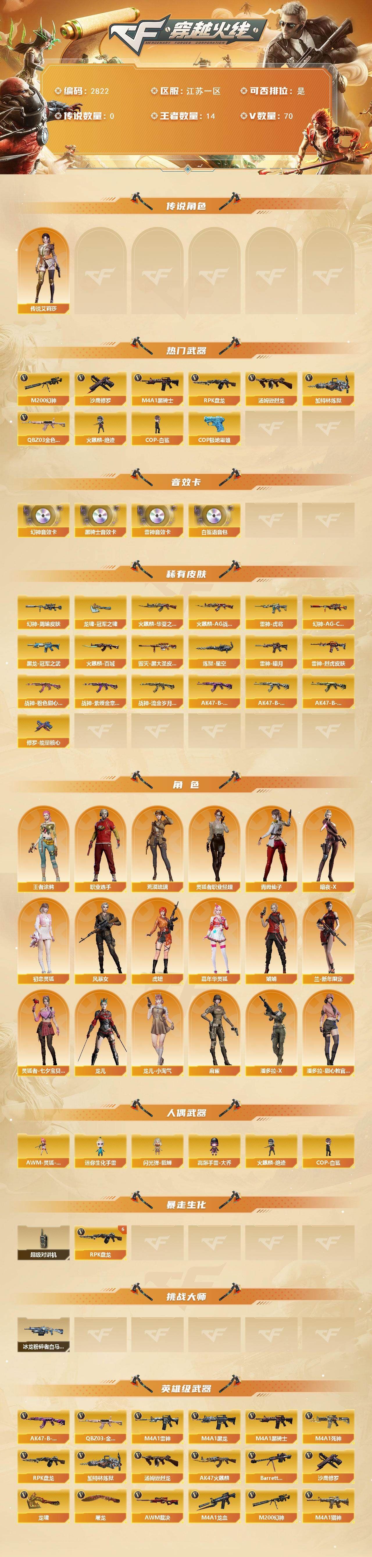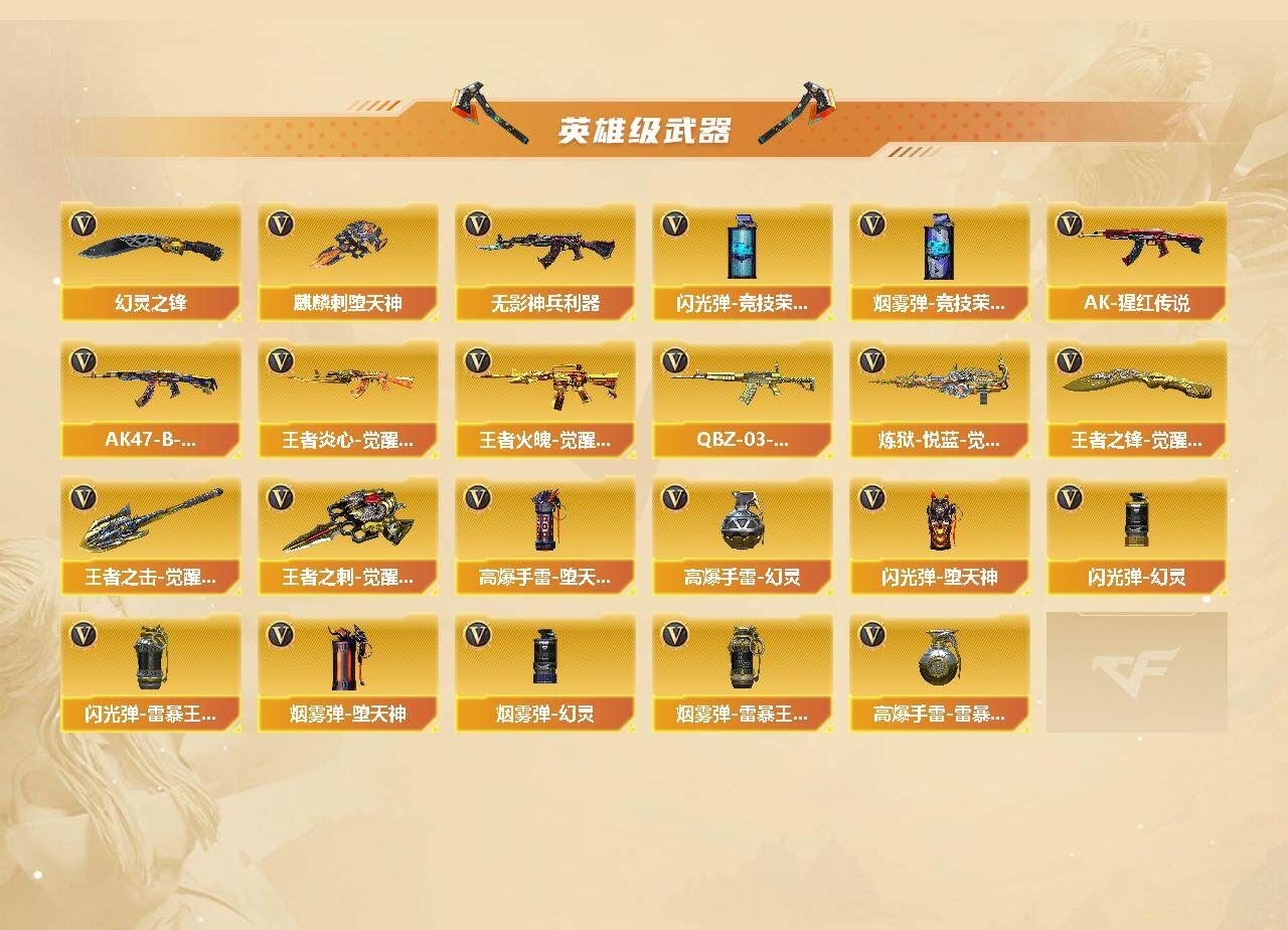 【传说角色】:传说艾莉莎【热门武器】:QBZ03-金色蔷薇,M200-幻神,M4A1-黑骑士,汤姆逊-烈龙,RPK-盘龙*6,加特林-炼狱,火麒麟-绝迹,COP-白鲨,沙鹰-修罗*7,COP 357-极地霜雄【音效卡】:M200-幻神音效卡,M4A1-雷神音效卡,M4A1-黑骑士音效卡,白鲨语音包【皮肤】:幻神-周瑜皮肤,幻神-AG-CFPLS17冠军,雷神-暗月,雷神-虎将,雷神-烈虎皮肤,火麒麟-AG战队皮肤,火麒麟-华夏之心,火麒麟-百城,毁灭-黑大圣皮肤,黑龙-冠军之武,战神-粉色甜心皮肤*2,战神-紫绶金章皮肤,战神-流金岁月皮肤,AK47-B-常胜将军-曹操,AK47-B-常胜将军-刘备*3,AK47-B-常胜将军-孙权*2,炼狱-星空,修罗-能量核心,龙啸-冠军之啸【角色】:荒漠琉璃,王者涂鸦,暗夜-X,初恋灵狐,风暴女,虎妞,嘉年华灵狐,娟娟,兰-新年限定,灵狐者-七夕宝贝,灵狐者-职业经理,龙儿,龙儿-小淘气,麻雀,潘多拉-X,潘多拉-甜心教官,青霞仙子,职业选手【人偶武器】:火麒麟-绝迹,COP-白鲨,AWM-灵狐-15周年嘉年华,迷你生化手雷,闪光弹-貂蝉,高爆手雷-大乔【暴走生化】:超级对讲机【挑战大师】:冰龙粉碎者-白马银枪【英雄级武器】:AK47-火麒麟,M4A1-黑龙*2,M4A1-雷神,M4A1-黑骑士,M4A1-死神,M4A1-龙血,无影-神兵利器,QBZ03-金色蔷薇,M4A1-猎神,AK-47-猩红传说*2,AK47-B-战神,王者炎心-觉醒版,王者火魄-觉醒版,AK47-B-常胜将军,QBZ-03-王者蔷薇-觉醒版,Barrett-毁灭,AWM-裁决,M200-幻神,RPK-盘龙*6,加特林-炼狱,炼狱-悦蓝-觉醒版,汤姆逊-烈龙,沙鹰-修罗*7,屠龙,龙啸,麒麟刺-堕天神,幻灵之锋*2,王者之锋-觉醒版,王者之击-觉醒版,王者之刺-觉醒版,高爆手雷-堕天神,高爆手雷-幻灵*3,高爆手雷-雷暴王者*2,闪光弹-堕天神,闪光弹-幻灵*3,闪光弹-竞技荣光,闪光弹-雷暴王者*2,烟雾弹-堕天神,烟雾弹-幻灵,烟雾弹-竞技荣光,烟雾弹-雷暴王者*2【道具】:冰冰背包-猛男专用,背包-葫芦兄弟,超级背包,黄金生化钩,变异宝贝,迷雾幽灵,生化弹匣,夺命之镰*2,防化服*3,金色流光-枪王排位*2,星辰流光-枪王排位,枪王排位28赛季金色流光,EP战队名片,C4-红龙,C4-沙漠,防弹头盔*3,防弹衣*3,C4工具钳*3,手雷包*3【特殊枪械】:1黑骑士,1烈龙,6盘龙,1炼狱;传说艾莉莎,RPK-盘龙,QBZ03-金色蔷薇,M200-幻神,
