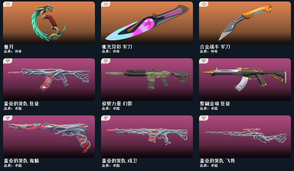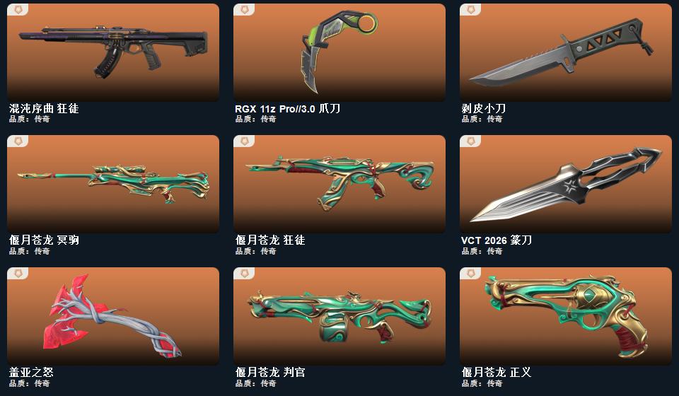 VCT 2026 赛季套装,偃月苍龙套装,盖亚的复仇套装,无畏启程套装 ,VCT 2026 篆刀,RGX 11z Pro//3.0 爪刀,剥皮小刀,弧光异彩 军刀,偃月,合金战车 军刀,盖亚之怒