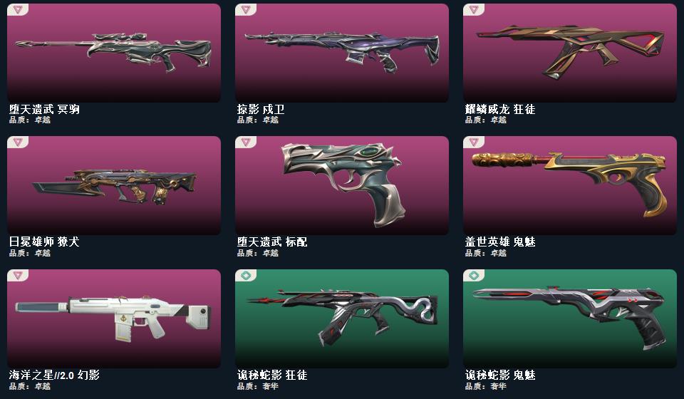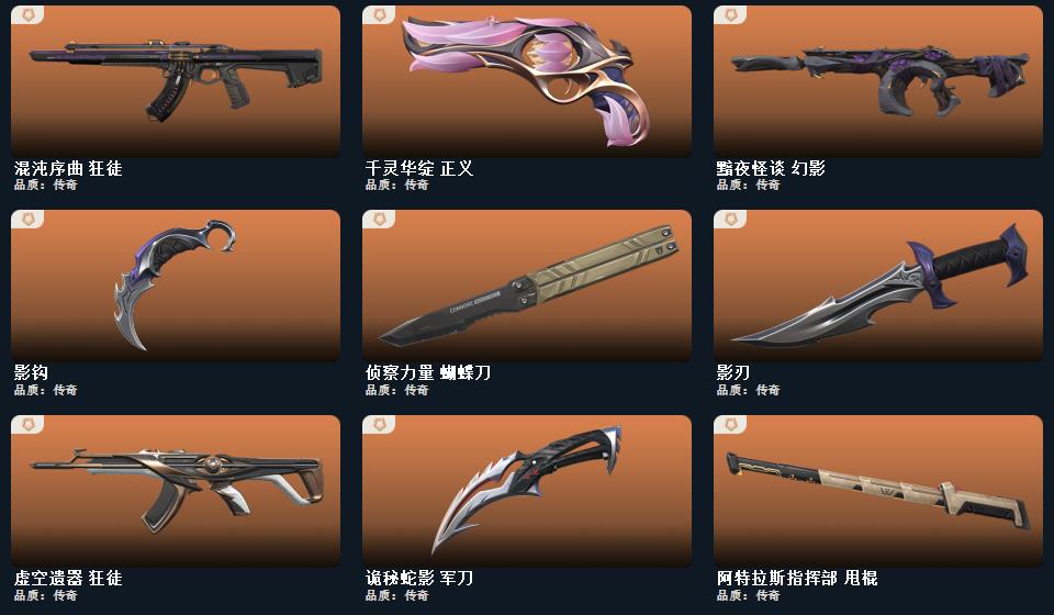 阿特拉斯指挥部 甩棍,影钩,影刃,诡秘蛇影 军刀,侦察力量 蝴蝶刀,阿特拉斯指挥部 标配,阿特拉斯指挥部 骇灵,耀鳞威龙 狂徒 ,阿特拉斯指挥部 莽侠,太空穿梭 战神,太空穿梭 判官