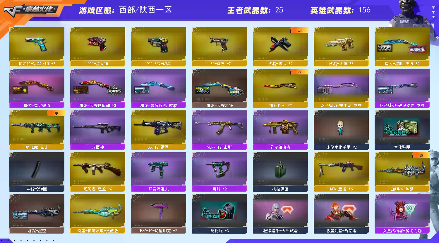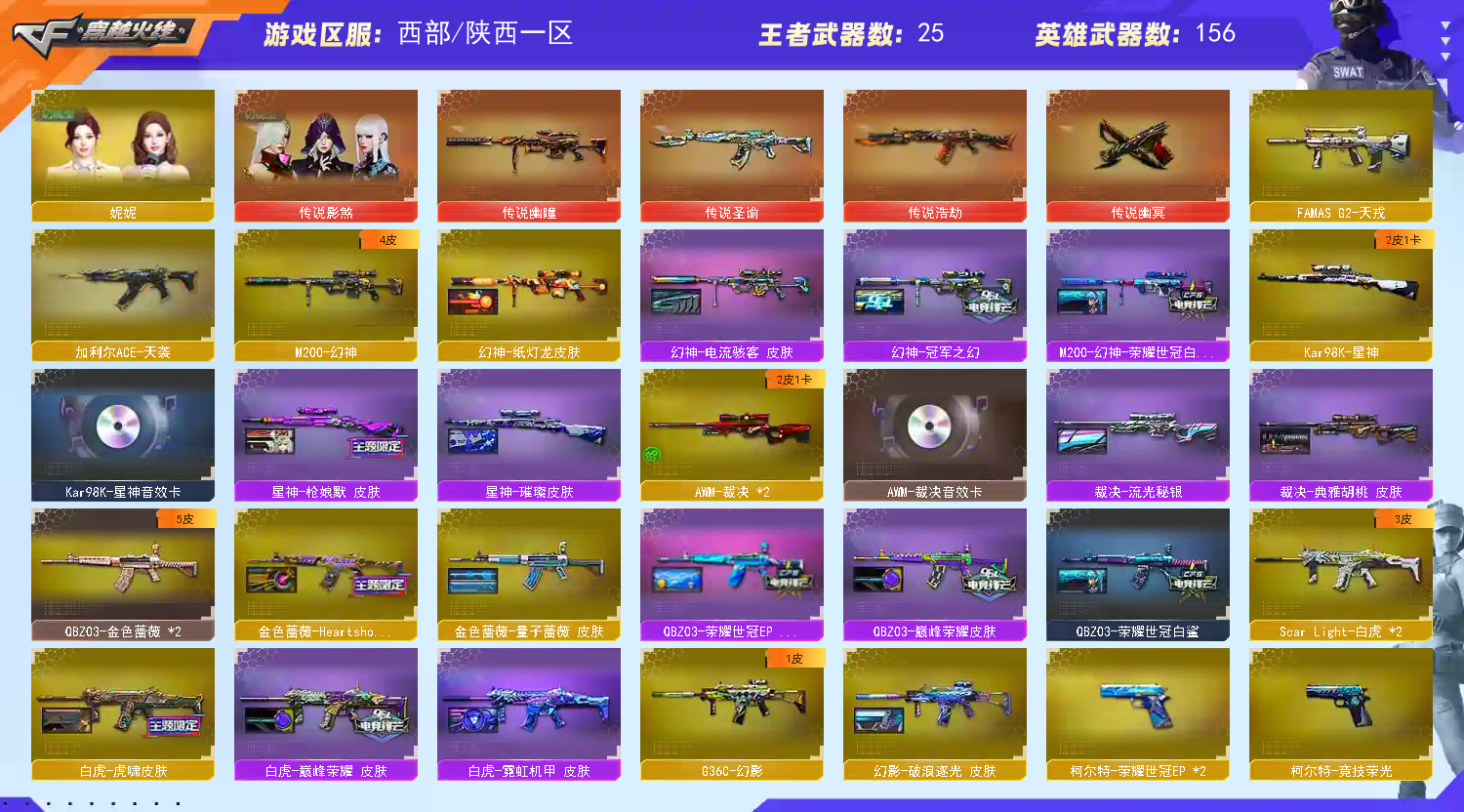 圣谕/浩劫/幽瞳/幽冥【幻神4皮】【雷神3件套】【毁灭3件套】【裁决3件套】【星神3件套】6盘6烈 【步枪】传说圣谕/传说浩劫/火麒麟/黑龙/雷神/黑骑士/无影/死神/黑武士/超新星/武圣/机械迷城/龙血/青龙/朱雀/白虎/玄武/无影神兵利器/幻影/天戒/穹宇/QZB金色蔷薇/猎神/9A91烈火/王者之心/王者之武/王者炎心/ 【狙击枪】传说幽瞳/天龙/毁灭/裁决/幻神/星神/M200竞技荣光/王者之决/王者幻神/王者风神/王者雷霆/裁决百城联赛天津/水枪不败狙神/毁灭孙三炮/金蚀机械姬/王者雷怒/炫金毁灭/双面神竞魂/ 【机枪】6盘龙/炼狱/炼狱泰师/ 【冲锋枪】6烈龙/异变清道夫/斯太尔恶棍/死亡之眼/ 【散弹枪】AA12雷霆 【挑战强化武器】传说浩劫/传说幽瞳/黑骑士/黑武士/超新星/白虎/9A91烈火/裁决/王者之决/6盘龙炼狱/6烈龙 【生化武器】传说圣谕/死神/朱雀/玄武/幻影/天戒/QBZ金色蔷薇/裁决/幻神/竞技荣光/王者之决/王者幻神/王者风神/AA12雷霆/双面神/双面神竞魂/ 【手枪】传说幽冥/修罗/天神/武圣/COP堕天神/COP幻灵/柯尔特竞技荣光/USP冥王/柯尔特荣耀世冠EP/COP白鲨/ 【刀】屠龙/龙啸/擎天/尼泊尔雷霆/麒麟刺堕天神/马来剑夜魔/幻灵之锋/擎天竞技荣光/炽芒碟刃/荣耀世冠龙啸/雷霆王者之锋/王者冰锋/ 【手雷】雷霆手雷x5/堕天神x7/夜魔/幻灵手雷套x2/竞技荣光手雷套x2/云龙/雷霆王者手雷/雷霆闪光弹x5/堕天神闪光弹x7/夜魔闪光弹/幻灵闪光弹x2/竞技荣光闪光弹x2/云龙闪光弹/雷霆王者/雷霆烟雾弹x5/堕天神烟雾弹x7/夜魔烟雾弹/幻灵烟雾弹/竞技荣光烟雾弹/云龙烟雾弹/雷霆王者烟雾弹/王者之魄手雷/王者之魄闪光弹/王者之魄烟雾弹/ 【角色】传说影煞/云悠悠/关小雨/荒漠琉璃/机械姬/葵/妮妮/司雨/星际战将/隐/影豹/雨棠/月兔特工/炫/不败狙神/奇洋探员/乔伊教练/王者春/王者救世主/王者葵貂蝉/王者迷迷香/王者瞳闭月羞花/王者玲珑/王者潘多拉/新海豹突击队/修道士/云海玲珑/ 【卡】星神卡/雷神卡/裁决卡/火麒麟卡/毁灭卡/ 【皮肤】荣耀世冠/纸灯龙/冠军之幻/电流骇客火麒麟玉面羞花/火麒麟枪娘卡萨林/白虎虎啸/无影华夏传说/屠龙星耀/金色蔷薇Heartshot/屠龙/毁灭魔灵/金色蔷薇量子蔷薇/火麒麟Heartshot/幻影破浪逐光/毁灭枪娘格雷姐妹/屠龙星火燎原/裁决典雅胡桃/QBZ荣耀世冠/火麒麟典雅胡桃/玄武幻装甲/龙啸幻灵之啸/黑骑士伏羲/雷神脉冲核心/屠龙破浪逐光/炽芒碟刃破浪逐光/火麒麟盘古/炽芒碟刃宋雨琦/雷神RLGD18冠军/白虎巅峰荣耀/雷神荣耀世冠/星神枪默/火麒麟巅峰荣耀/毁灭巅峰荣耀/擎天冠军之击/屠龙荣耀世冠AG/QBZ巅峰荣耀/火麒麟大唐荣光/裁决流光秘银/屠龙荣耀世冠AG/火麒麟荣耀世冠AG/星神璀璨/毁灭星卡/雷神耀金/黑骑士耀金/雷神宠儿/毁灭SV16冠军/QBZ荣耀世冠白鲨/黑骑士战神马超/毁灭AG15冠军/雷神荣耀之魄/火麒麟AG战队皮肤/毁灭冠军之心/屠龙荣耀之锋/毁灭英雄计划/黑武士典韦/黑龙墨子/火麒麟华夏之心/雷神虎将/雷神神秘按键;传说幽冥,柯尔特-冠军之特,炽芒蝶刃,传说影煞,电竞教官-云悠悠,妮妮,RPK-盘龙,