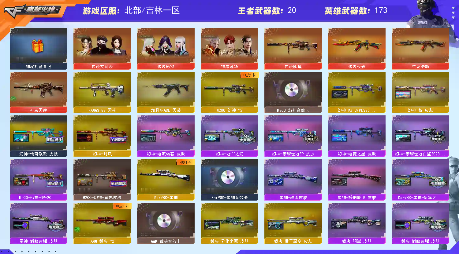 幽瞳,幻神,神威天绫莲华,各种主流武器4件套和稀有皮肤,COPx7,USPx4,柯尔特x3