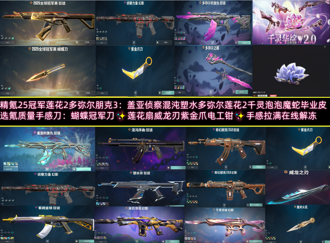 在线-及时解冻 精氪25冠军莲花2多弥尔朋克3:盖亚侦察混沌塑水多弥尔莲花2千灵泡泡魔蛇毕业皮 质量手感刀:蝴蝶冠军刀✨莲花扇威龙刃紫金爪电工钳✨手感拉满在线解冻;艾沃莉的梦之翼 奥丁,紫金爪刀,威龙之刃,归零者 獠犬,盖亚的复仇 狂徒,异鳞魔蛇 幻影,侦察力量 幻影,