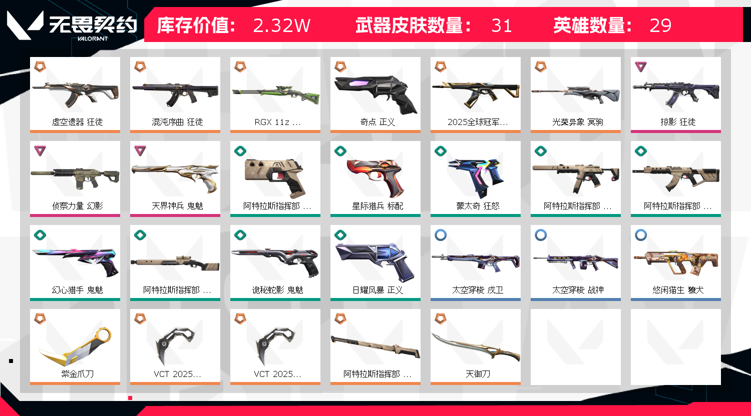 首页 > 租号大厅 > 无畏契约-wegame > wegame/wegame > 可排位 +混沌 25冠军 掠夺 虚无狂徒 紫金爪刀 vct爪刀 天域刀 侦查幻影 奇点正义 光荣大狙