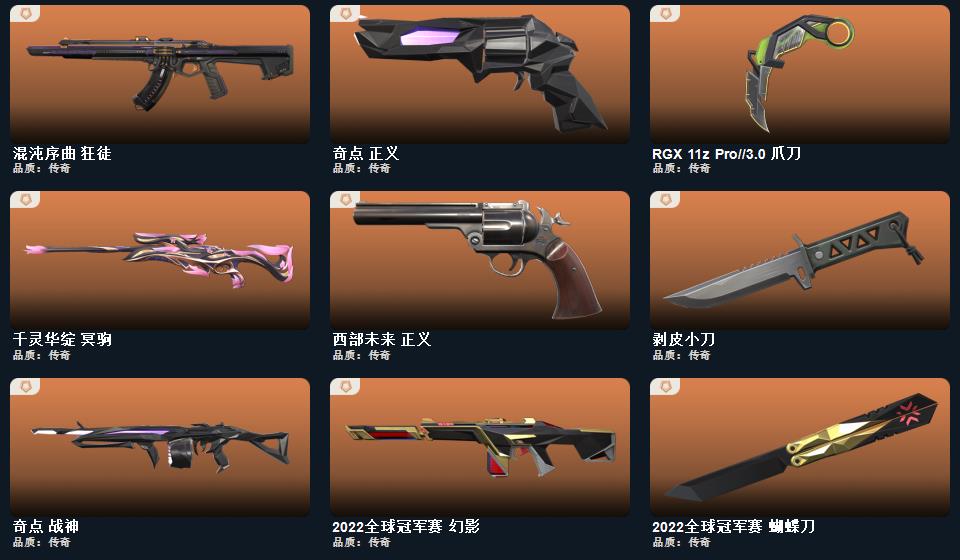 2022全球冠军赛套装,2022全球冠军赛 蝴蝶刀,剥皮小刀,超限闪存 匕首,RGX 11z Pro//3.0 爪刀,超能偶像 应援棒,弧光异彩 军刀,合金战车 军刀,蒙太奇 狂怒,异鳞魔蛇 幻影,超限闪存 莽侠,紫阙金琅//2.0 奥丁