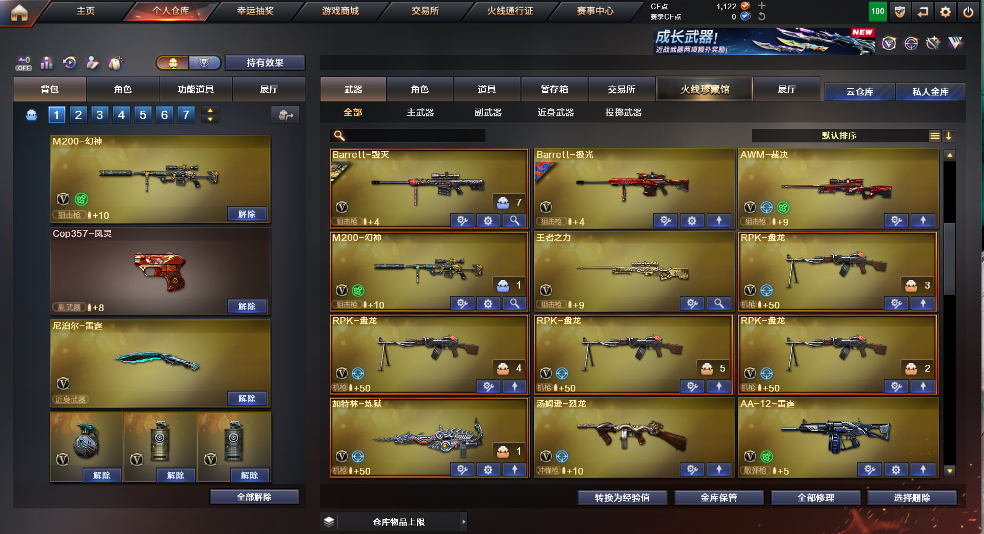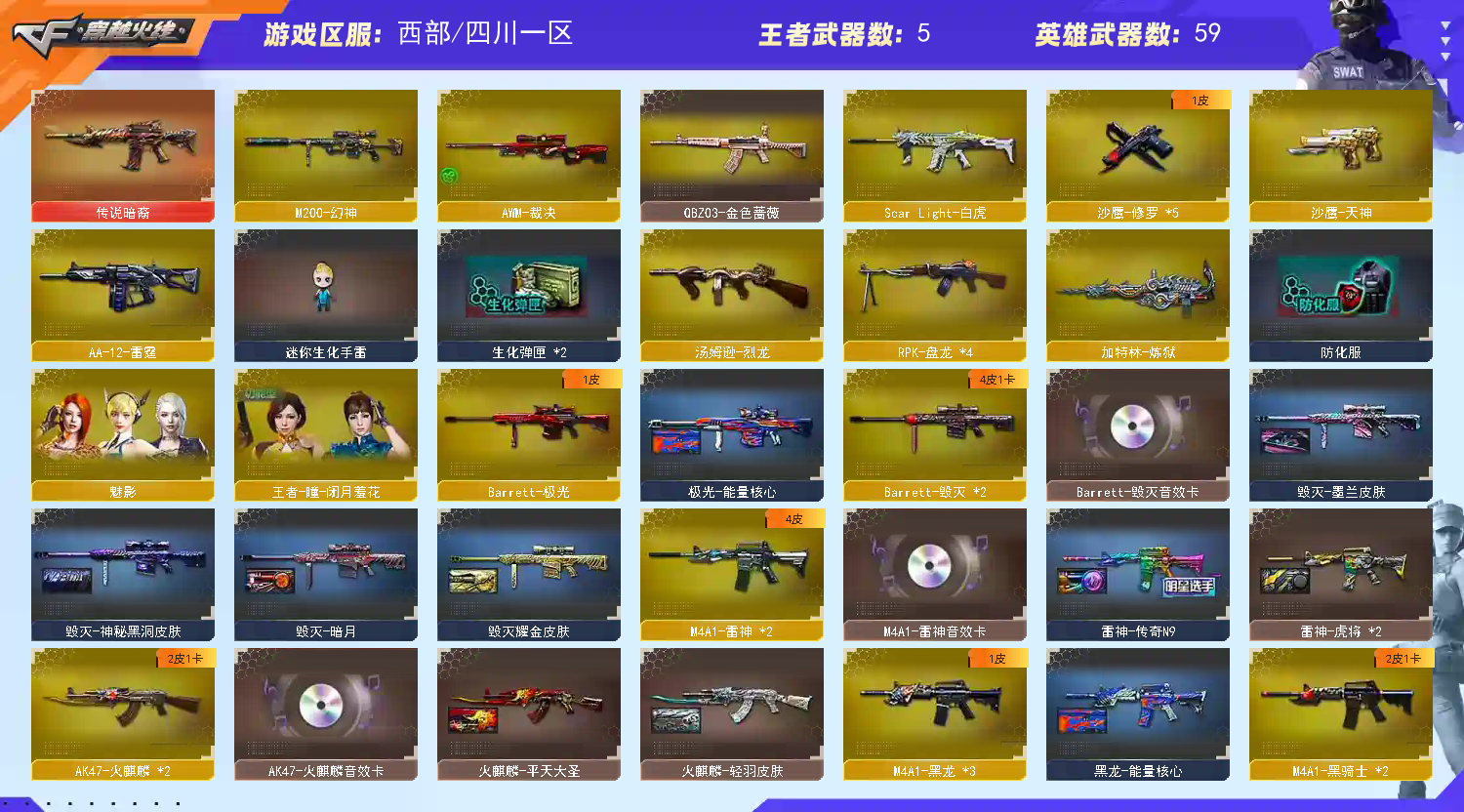 西部:传说暗翼+幻神蔷薇朱雀裁决4盘1炼狱雷神n9毁灭黑骑火麒麟雷神音效卡;RPK-盘龙,QBZ03-金色蔷薇,M200-幻神,Scar Light-白虎,传说暗裔,