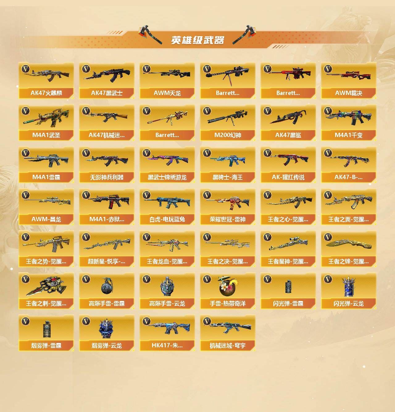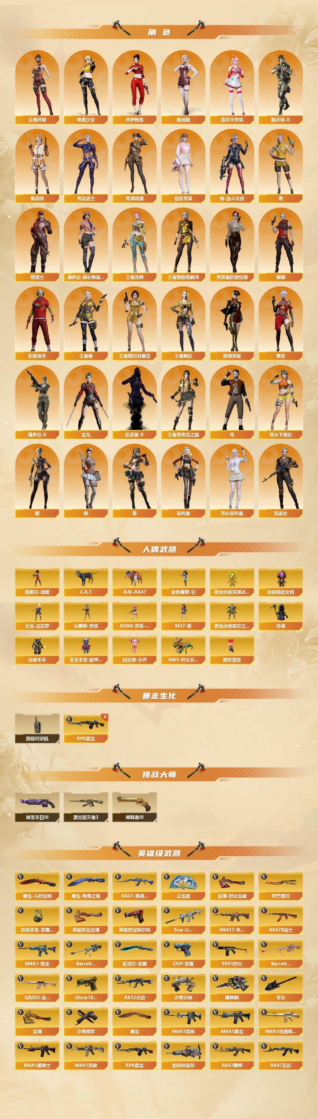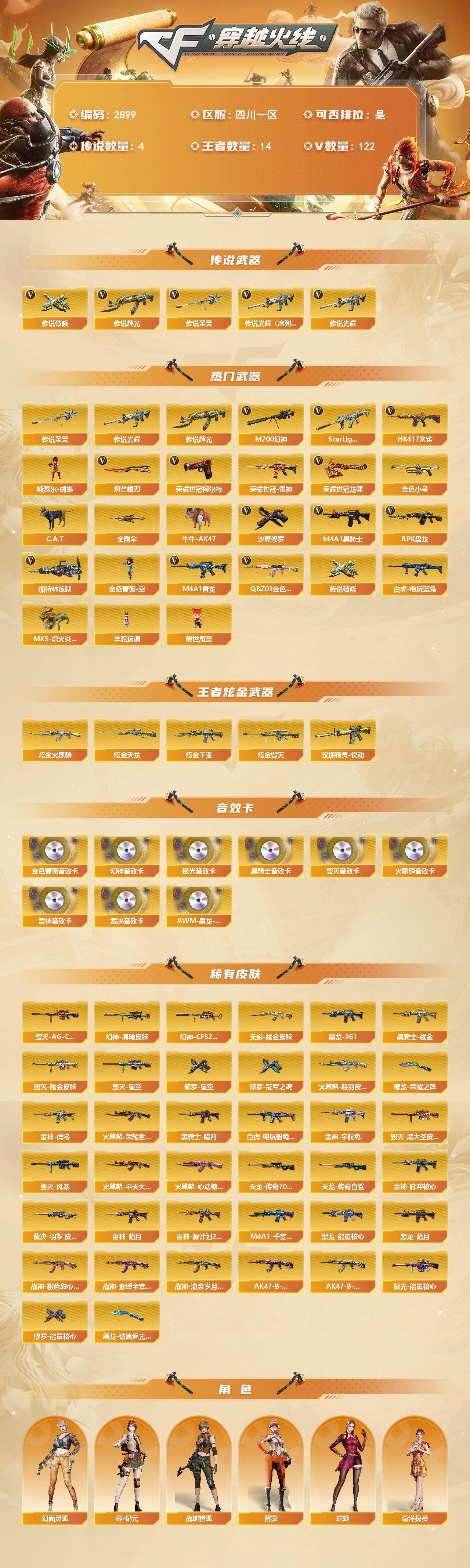 8传说✨幻神2皮肤+音效卡✨白虎+朱雀+斯泰尔蝴蝶✨炽芒蝶刃天龙-曼陀罗,火麒麟-灵狐,金色蔷薇-空,MK5-炽火炎龙,斯泰尔-蝴蝶,AWM-灵狐-15周年嘉年华,M37-葵,C.A.T,牛牛-AK47,黄金迷你深渊冰龙,黄金迷你裂空之翼,夺魂,迷你牛牛,生化手雷-机甲核心*3,闪光弹-小乔,迷你超能女侍,降世魔童【音效卡】:M200-幻神音效卡,AK47-火麒麟音效卡,M4A1-雷神音效卡,M4A1-黑骑士音效卡,Barrett-毁灭音效卡,Barrett-极光音效卡,QBZ03-金色蔷薇音效卡,AWM-裁决音效卡,AWM-昌龙-怀旧音效卡【皮肤】:幻神-周瑜皮肤,幻神-CFS2022,白虎-电玩粉兔皮肤,裁决-羽掣 皮肤,雷神-暗月,雷神-虎将,雷神-脉冲核心,雷神-宇航兔皮肤,雷神-源计划2.0专属 皮肤,火麒麟-轻羽皮肤,火麒麟-平天大圣*2,火麒麟-荣耀世冠AG,火麒麟-心动糖果,毁灭耀金皮肤,毁灭-星空,毁灭-AG-CFPLS15冠军,毁灭-黑大圣皮肤*2,毁灭-风暴,M4A1-千变-孔明皮肤,黑龙-能量核心,黑龙-暗月,M4A1-黑龙-361,黑骑士-暗月,黑骑士耀金皮肤,无影耀金皮肤,战神-粉色甜心皮肤*2,战神-紫绶金章皮肤*3,战神-流金岁月皮肤*2,AK47-B-常胜将军-曹操*2,AK47-B-常胜将军-刘备*2,AWM-天龙-传奇70KG,AWM-天龙-传奇白鲨,极光-能量核心*2,修罗-能量核心,修罗-星空,修罗-冠军之魂,屠龙-荣耀之锋,屠龙-破浪逐光 皮肤【挑战大师】:激光毁灭者III,神圣爆裂者-末日III,阐释者III*2【道具】:BS战队炫彩背包,Q9战队炫彩背包,亚洲杯纪念炫彩背包,奇洋探员-海龟背包,炫彩背包,虎牙炫彩背包,超级背包,迷你冰龙背包,黄金曼提柯尔的背包,终极猎手-秦魂将军,女皇终结者-魔龙之吻,救世主-黑桃战神,黄金生化钩,绿色巨人,灵魂忍者*3,变异宝贝,迷雾幽灵*2,夺命之镰,防化服*3,金色流光-枪王排位*2,星辰流光-枪王排位,流光-再燃火线,枪王排位28赛季金色流光,枪王排位29赛季金色流光,电玩兔兔表情*2,云海游龙表情,EP战队击杀图标,C4-高无钳,防弹头盔*3,防弹衣*3,C4工具钳*3,手雷包*3【源级武器】:源-千变,源·火麒麟*2,魂·火麒麟-百城,源·雷神*2,魂·M4A1-雷神-化蛇,魂·雷神-诺拉,魂·雷神-新春神龙,魂·雷神-15周年嘉年华,御·雷神-机甲刑天*2,御·雷神-烈虎,御·雷神-葫芦兄弟,御·雷神-小白龙,魂·黑骑士-摸金校尉,魂·黑骑士-破浪10年,御·黑骑士·哪吒闹海,灵·黑骑士-炫光,魂·超新星-春桃,源·武圣,源·机械迷城,源-龙血,龙血-赛博蓝,魂·龙血-锋芒破茧,源·青龙,M4A1-青龙-掌上穿越火线,灵·HK417-朱雀-甜蜜火力,源·HK417-朱雀,源-金色蔷薇,魂·QBZ03-金色蔷薇-萌杀*2,魂·9A91·烈火-电子连击,魂·玫瑰精灵-傲梅,源·猎神,魂·英雄-湾区光枢,源-极光,源·天龙,魂·天龙-彼岸花,魂·裁决-新人王绿豆,魂·裁决-羽掣,源·毁灭,魂·毁灭-青帝,魂·毁灭-神秘黑洞,御·毁灭-葫芦兄弟,魂·Barrett-金色蔷薇-蛇姬,魂·Barrett-朱雀-锦鲤,灵·Barrett-朱雀-炫光,魂·炼狱-电子连击,魂·炼狱-月,魂·炼狱-蒸汽钟表,加特林-炼狱-掌火,御·炼狱-女娲,魂·天神-维纳斯*2,灵·天神-穹宇,源·武圣glock,魂·屠龙-春桃,魂·屠龙-都是Cfer,源·擎天-萌杀,源·龙啸,魂·麒麟刺-神秘黑洞,魂·麒麟刺-月,灵·麒麟刺-穹宇【英雄级武器】:M4A1-千变,AK47-火麒麟*3,AK47-麒麟,M4A1-黑龙*2,M4A1-雷神,M4A1-黑骑士,AK47-无影*4,M4A1-死神,AK47-黑武士,AK12-天启,M4A1-武圣,AK47-机械迷城,AK47-黑鲨,M4A1-雷霆,M4A1-青龙,HK417-朱雀,Scar Light-白虎,无影-神兵利器,黑武士-锦绣游龙,M4A1-玫瑰精灵,QBZ03-金色蔷薇*6,9A91-烈火,王者之心-觉醒版,王者之翼-觉醒版,王者之势-觉醒版*2,超新星-悦享-觉醒版,AK-47-猩红传说*6,AK47-B-战神*2,黑骑士-海王,王者龙血-觉醒版,白虎-电玩蓝兔,荣耀世冠-雷神,HK417-朱雀-电竞之星,机械迷城-穹宇,AK47-B-战士,AWM-天龙,Barrett-毁灭*2,Barrett-极光,AWM-裁决,M200-幻神,Barrett-朱雀,Barrett-金色蔷薇,王者之决-觉醒版,王者星神-觉醒版*2,Barrett-暗月传说,RPK-盘龙*7,;荣耀世冠-柯尔特,炽芒蝶刃,RPK-盘龙,QBZ03-金色蔷薇,M200-幻神,Scar Light-白虎,