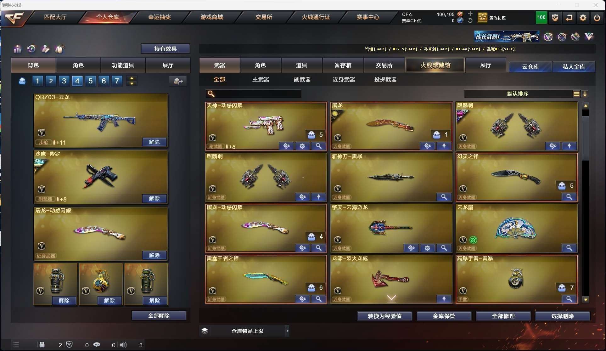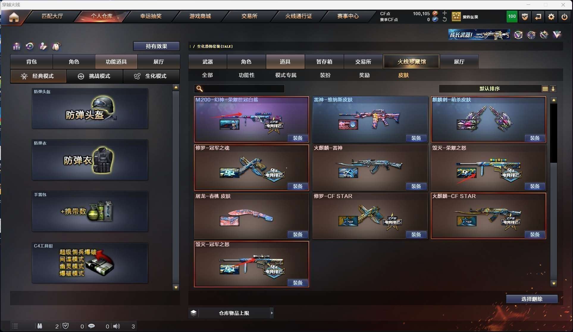 【m200幻神*2+冠军之幻皮肤+荣耀世冠白鲨皮肤+n9皮肤+星耀皮肤+usp雷暴】【98k星神+星神音效卡】【白虎+王者白虎】【qbz03金色蔷薇+qbz03云龙】【毁灭+荣耀之怒皮肤+冠军之怒皮肤】【王者之光】【火麒麟 天启 黑骑士 龙血 无影神兵利器 黑骑士海王 超新星 黑武士锦绣游龙 】——【热门武器/小人呛】【斯泰尔蝴蝶 牛牛ak 】——【usp雷暴 cop幻灵 修罗 天神动感闪耀】——【幻灵之锋 雷霆王者之锋 龙啸烈火龙威 麒麟刺 屠龙 斩神刀雷暴 云龙扇 屠龙动感闪耀 擎天云海游龙 屠龙动感闪耀】——【幻灵投掷武器套装*4+雷暴投掷武器套装*4+雷霆王者投掷武器套装】——【角色】【4防(隐 王者炽天使 王者潘多拉 灵狐者职业经理 )】【华】;USP-雷暴,QBZ03-金色蔷薇,M200-幻神,Scar Light-白虎,Kar98K-星神,