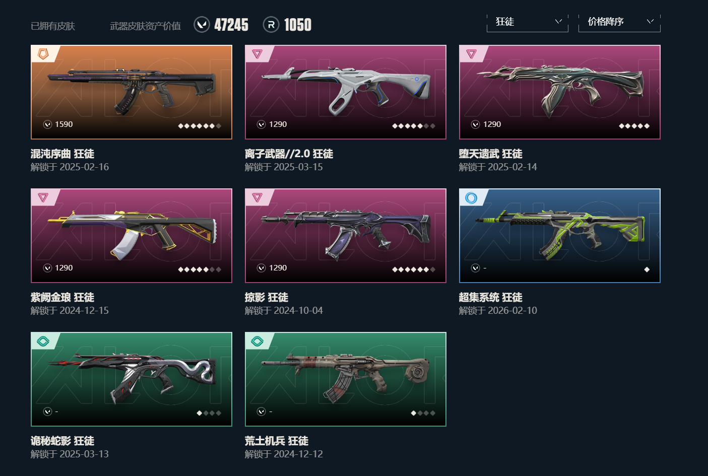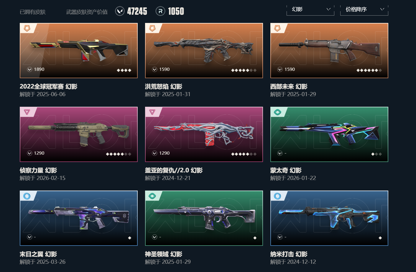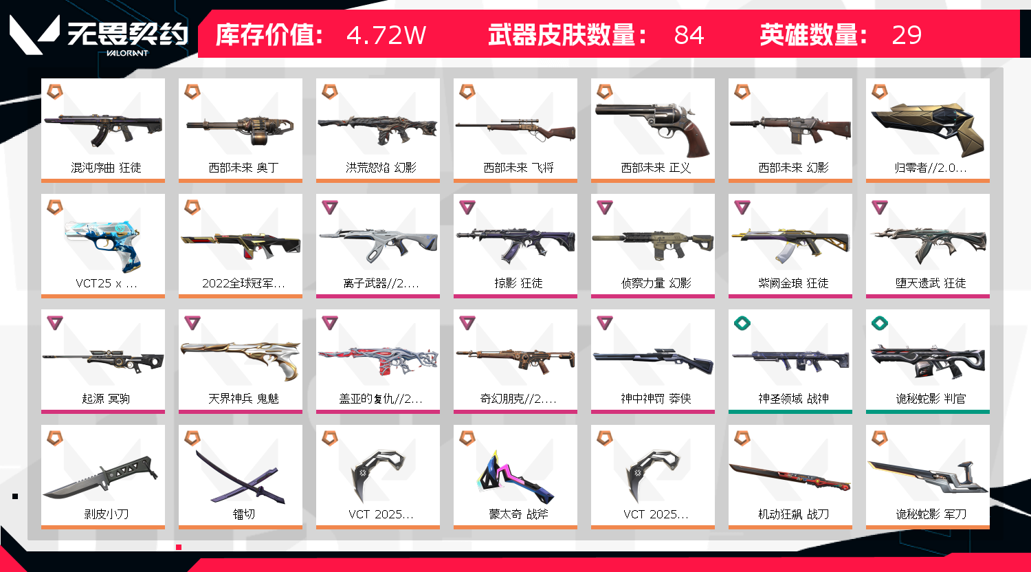 允许 英雄28 武器皮肤数量84;西部未来 奥丁,剥皮小刀,镭切,VCT 2025 爪刀,掠影 狂徒,侦察力量 幻影,洪荒怒焰 幻影,