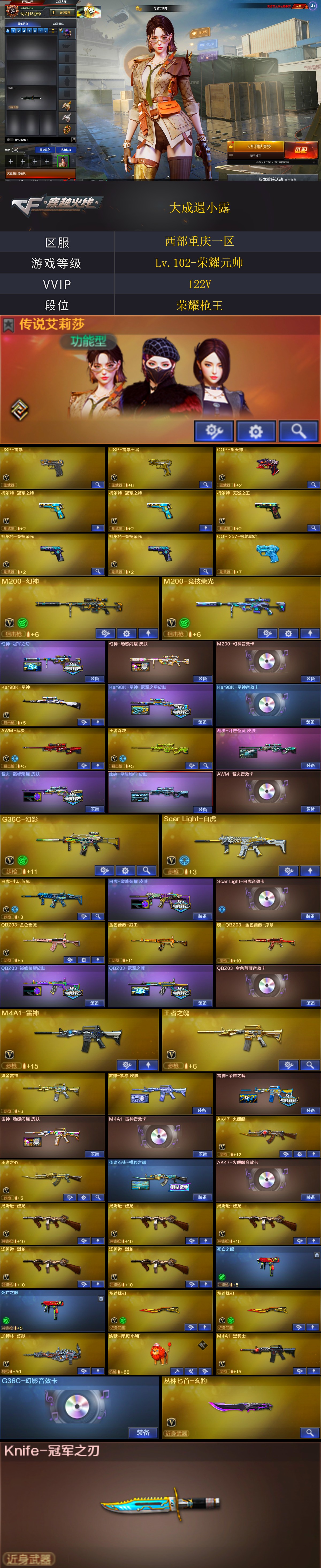 商品标题】:西部重庆一区-122V-可二次实名-【Lv.102-荣耀元帅】-【段位:荣耀枪王】 【稀有武器】:M200-幻神/Kar98K-星神/G36C-幻影/ScarLight-白虎/USP-雷暴/COP-堕天神/柯尔特-竞技荣光(2)/天神-动感闪耀/柯尔特-无冕之王/修罗-古蛇迷踪/柯尔特-冠军之特(2)/金色蔷薇-古蛇迷踪/QBZ03-金色蔷薇/AK47-火麒麟(3)/M4A1-黑龙/M4A1-雷神/M4A1-黑骑士/AK47-黑武士/白虎-电玩蓝兔/Barrett-毁灭(3)/Barrett-极光/AWM-裁决/M200-竞技荣光/加特林-炼狱/汤姆逊-烈龙(5)/炽芒蝶刃(2)/马来剑-夜魔/擎天-竞技荣光 【王者武器】:王者之心-觉醒版/王者之魄-觉醒版/王者之怒-觉醒版/王者森决-觉醒版 【热门角色】:传说艾莉莎/电竞教官-云悠悠/鹰/乔伊教练/蛇隐宗/王者春/王者凌霄/空/潘多拉-X/兔囡囡 【热门音效卡】:M200-幻神音效卡/Kar98K-星神音效卡/AWM-裁决音效卡/Scar Light-白虎音效卡/QBZ03-金色蔷薇音效卡/M4A1-雷神音效卡/Barrett-毁灭音效卡/M4A1-黑骑士音效卡/AK47-火麒麟音效卡/Barrett-极光音效卡 【热门皮肤】:幻神-冠军之幻/幻神-动感闪耀皮肤/裁决-巅峰荣耀皮肤/屠龙-星火燎原/QBZ03-巅峰荣耀皮肤/Kar98K-星神-冠军之星皮肤/QBZ03-冠军之薇/白虎-巅峰荣耀 皮肤/黑龙-冠军之武/传奇石头-横秒之巅/黑骑士-AG-S4冠军典藏/屠龙-荣耀之锋(4)/毁灭-荣耀之怒/雷神-荣耀之魄 【其他亮点】:Knife-冠军之刃/贝雷塔687-射手座/金刚伞-电玩红兔 (截图展示段位不代表实际段位,如赛季更新等不可抗拒因素发生变化,其余道具看截图或咨询客服);USP-雷暴,柯尔特-无冕之王,USP-雷暴王者,柯尔特-冠军之特,炽芒蝶刃,Knife-冠军之刃,电竞教官-云悠悠,