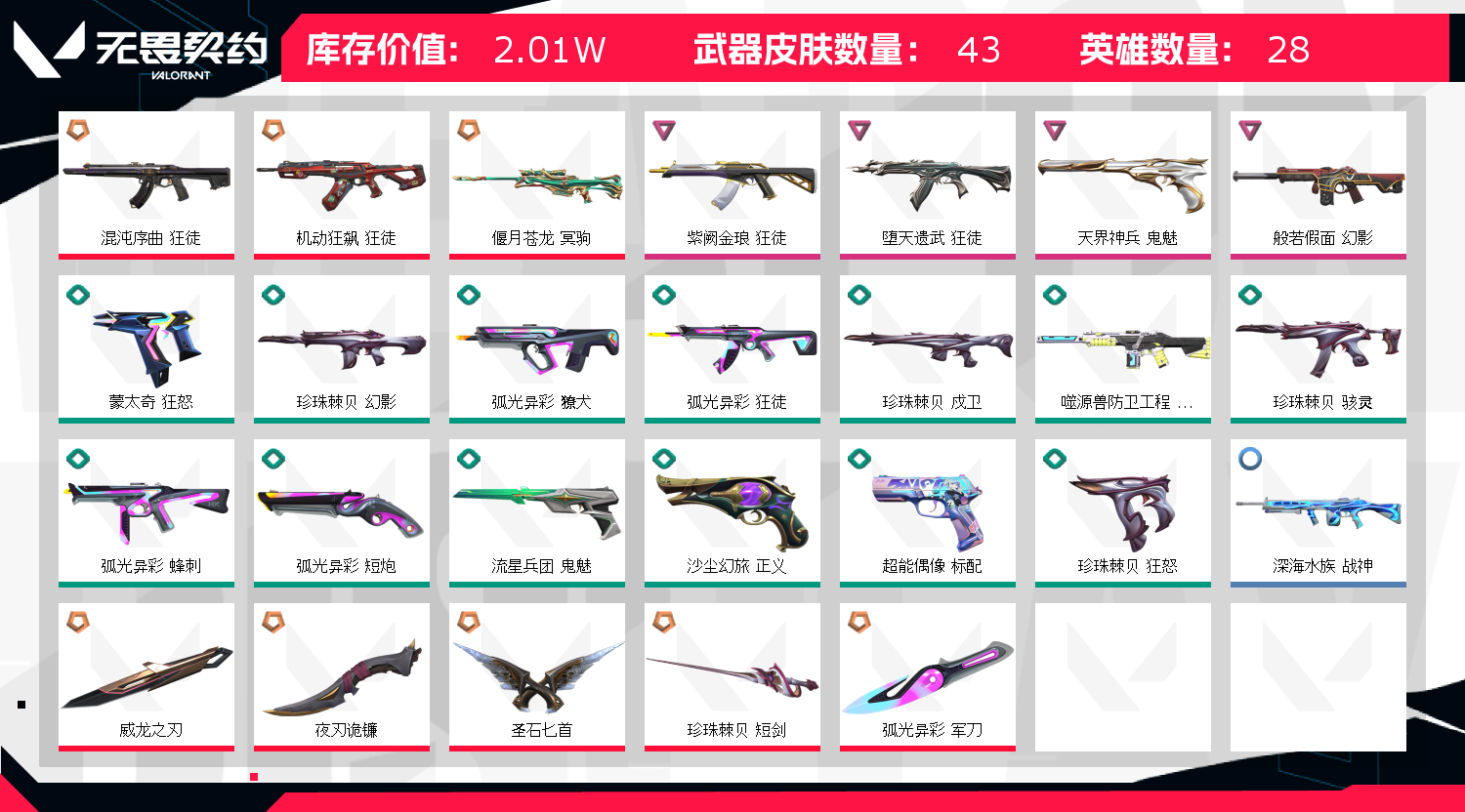 可排位 英雄28 武器皮肤数量43;威龙之刃,紫阙金琅 狂徒,堕天遗武 狂徒,混沌序曲 狂徒,天界神兵 鬼魅,