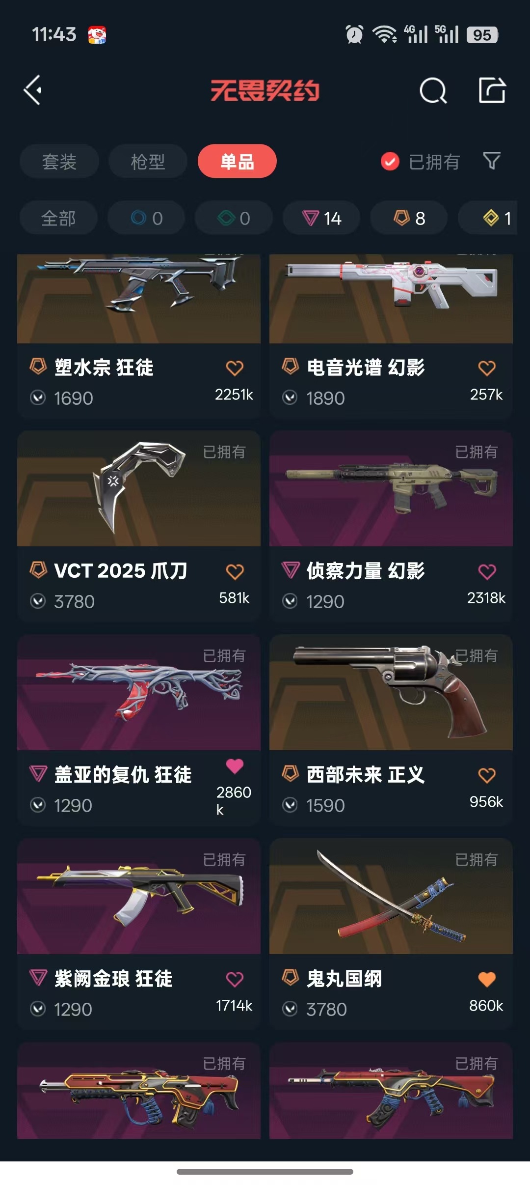 VCT2025爪刀❤️光谱侦查幻影❤️威龙套❤️掠夺1.0❤️还有很多皮肤❤️