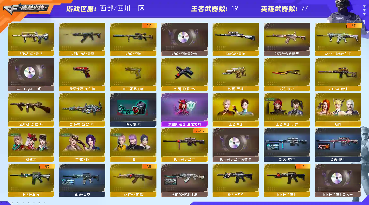 M200-幻神+音效卡】【Kar98K-星神】【ScarLight-白虎+音效卡】【QBZ03-金色蔷薇】【生化 3炼狱 6烈龙】【Barrett-毁灭+音效卡】【天戎】【天袭】【AK47-火麒麟】【黑龙】【M4A1-雷神】【黑骑士+音效卡】【王者之心 王者之怒】【无影 黑武士 天罚+音效卡 海王】【8手枪 修罗*5 天神 荣耀世冠-柯尔特 】【11近战 屠龙*2 擎天 麒麟刺 炽芒蝶刃蝴蝶刀 王者之啸 王者之击】【手雷 竞技荣光】【四防 王者玲珑小乔】【幻神音效卡 ScarLight-白虎英音效卡;USP-雷暴王者,荣耀世冠-柯尔特,炽芒蝶刃,QBZ03-金色蔷薇,M200-幻神,Scar Light-白虎,加利尔ACE-天袭,