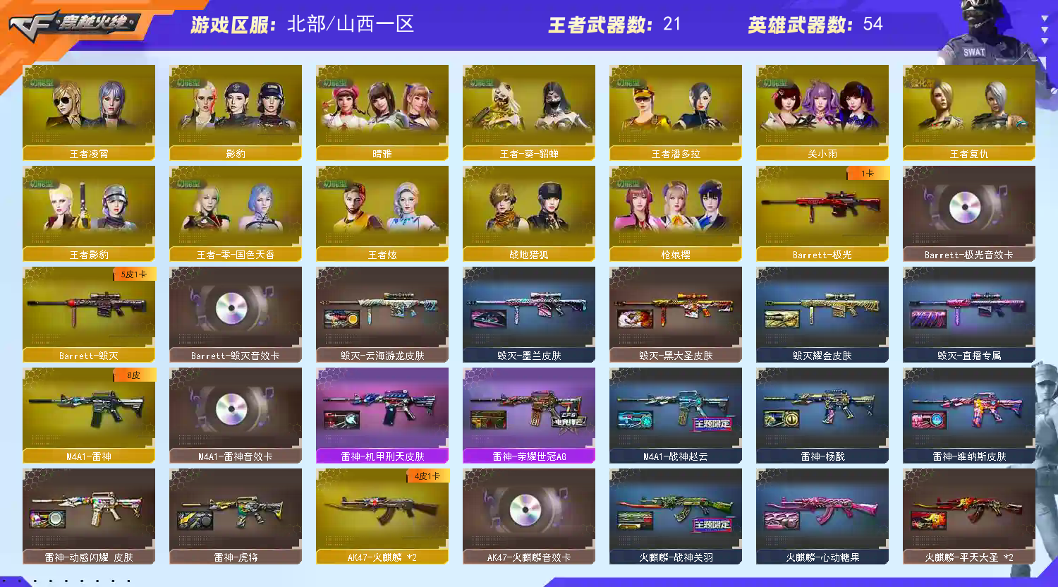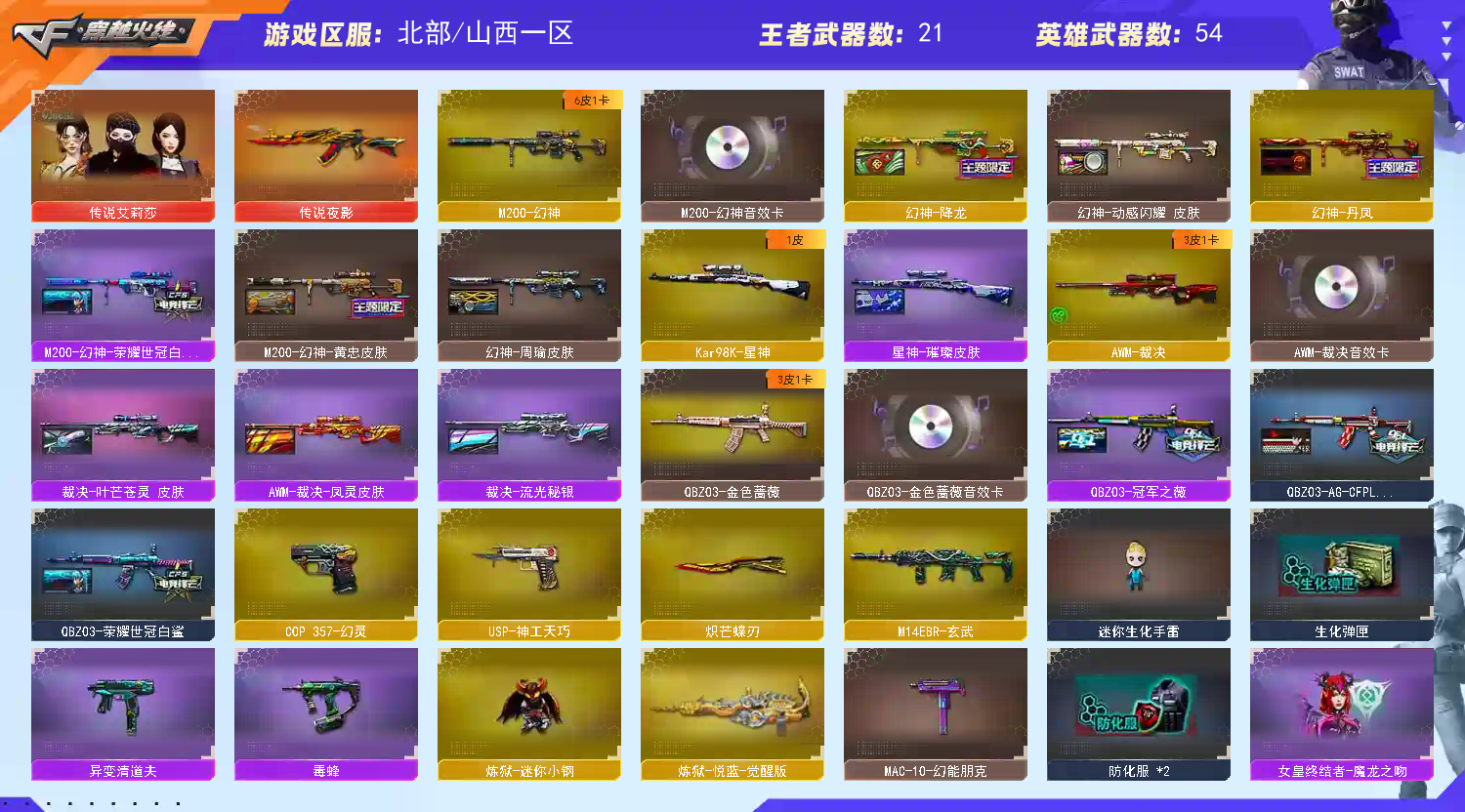 传说艾莉莎】【M200-幻神+音效卡+幻神-丹凤+幻神-荣耀世冠白鲨+幻神-降龙+幻神-周瑜+幻神-动感闪耀】【Kar98K-星神+星神-璀璨】【王者风神】【传说夜影】【白虎之魄】【QBZ03-金色蔷薇+音效卡】【裁决+音效卡+裁决-流光秘银】【Barrett-毁灭+音效卡】【极光+音效卡】【幻灵套】【神工天巧套】【AK47-火麒麟+音效卡】【黑龙+音效卡】【M4A1-雷神+音效卡+雷神-荣耀世冠ag】【黑骑士+音效卡+黑骑士-马超】【王者之武 王者之魄 王者之鲨 王者冰魄 王者之烈 王者风吟 王者芳薇】【死神 黑武士 超新星 青龙 hk417-朱雀 玄武 玫瑰精灵】【3手枪 cop幻灵 usp神工天巧】【7近战 麒麟刺 幻灵之锋 炽芒蝶刃蝴蝶刀】【手雷 幻灵雷 神工天巧 】【四防 影豹 王者葵貂蝉 王者零国色天香 王者凌霄 王者潘多拉 王者影豹 王者炫 】【幻神音效卡 QBZ03-金色蔷薇音效卡 Barrett-毁灭音效卡 AK47-火麒麟音效卡;炽芒蝶刃,晴雅,传说艾莉莎,QBZ03-金色蔷薇,M200-幻神,Kar98K-星神,