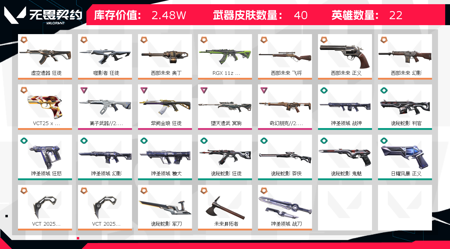可排/无敌小号/精品全单买/显卡金琅离子虚空噬影AK/西部M4/西部父VCT爪/西部正义/弃王狙;西部未来 奥丁,VCT 2025 爪刀,虚空遗器 狂徒,噬影者 狂徒,紫阙金琅 狂徒,RGX 11z Pro 狂徒,离子武器//2.0 狂徒,