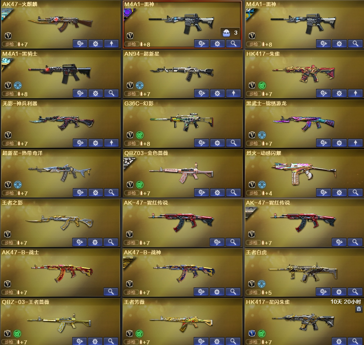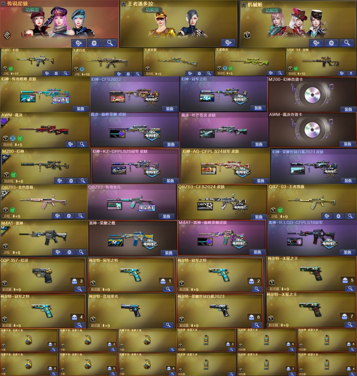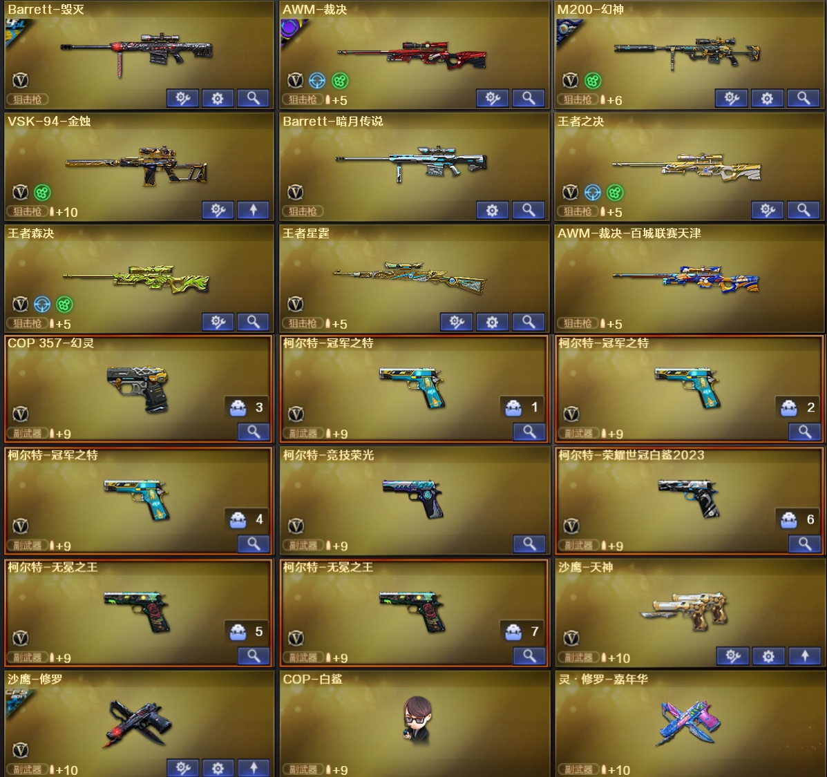 1;柯尔特-无冕之王,柯尔特-荣耀世冠白鲨2023,柯尔特-冠军之特,炽芒蝶刃,传说星骇,RPK-盘龙,QBZ03-金色蔷薇,