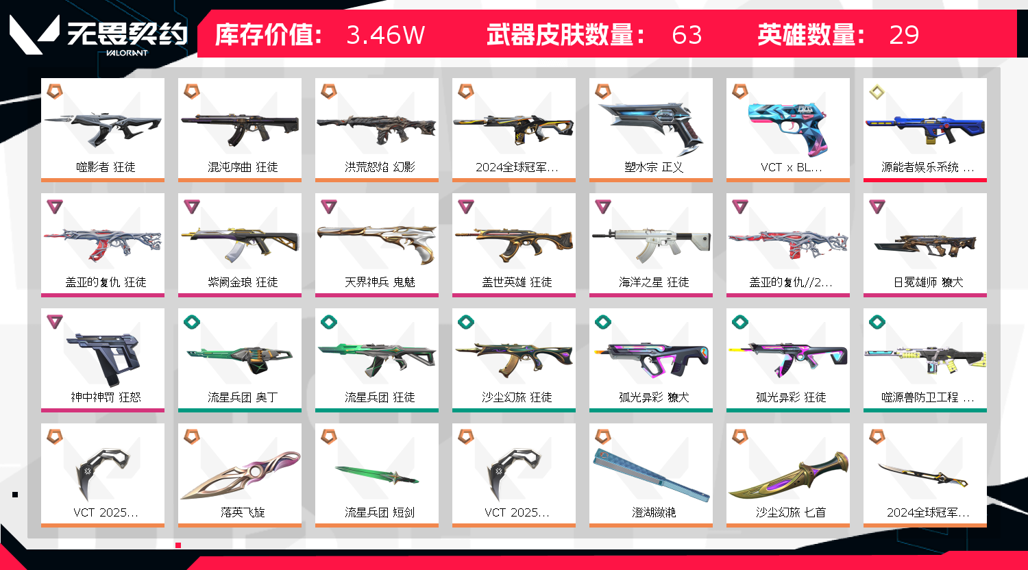 禁止开挂,禁止挂机,挂机或者炸鱼将收取押金,请勿挂机或者炸鱼,欢迎老板体验;VCT 2025 爪刀,盖亚的复仇 狂徒,噬影者 狂徒,源能者娱乐系统 幻影,洪荒怒焰 幻影,紫阙金琅 狂徒,混沌序曲 狂徒,