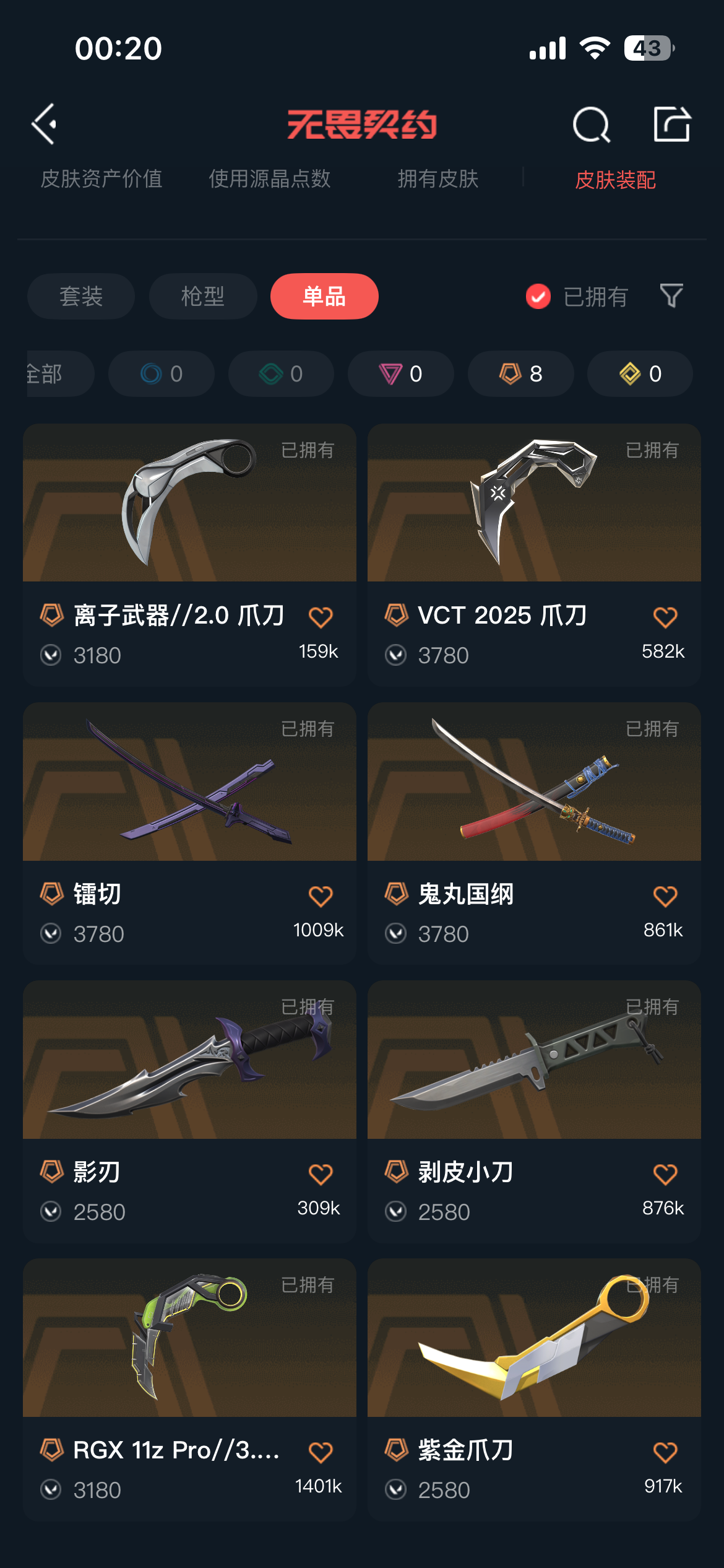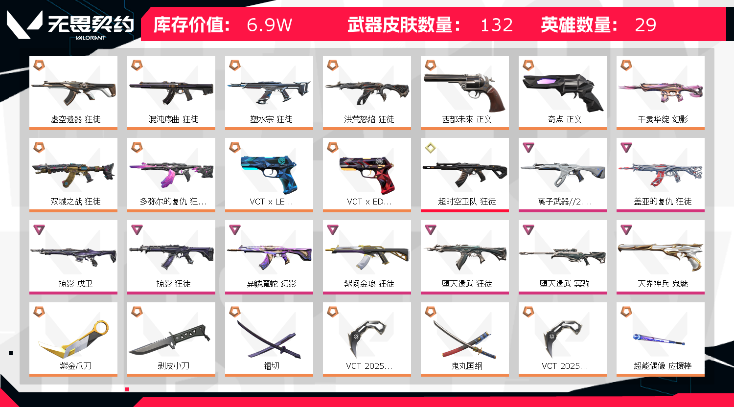 允许 英雄28 武器皮肤数量131;紫金爪刀,剥皮小刀,镭切,VCT 2025 爪刀,盖亚的复仇 狂徒,虚空遗器 狂徒,掠影 戍卫,
